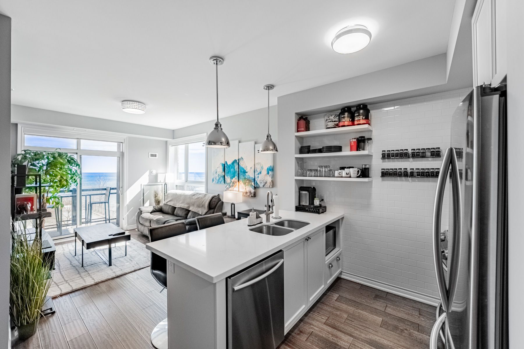 Wake up to breathtaking, unobstructed views of lake ontario right from your living room, primary bedroom, and private balcony! Welcome to waterfront trails - one of stoney creek's most sought-after boutique lakeside communities. This stunning 2-bedroom corner unit is bright, modern, and move-in ready, with natural light pouring in throughout the day. The open-concept layout features beautiful hand-scraped hardwood flooring, a sleek white kitchen with stainless steel appliances, quartz countertops, upgraded pendant lighting, and a breakfast bar island - perfect for morning coffee or entertaining guests. Both bedrooms are generously sized, with the primary bedroom capturing those gorgeous lake and toronto skyline views. The updated 4-piece bathroom is clean and contemporary. Step outside to your private balcony and let the sound of the water do the rest. This building is heated and cooled by geothermal - while fees are listed as excluding heat, a/c & hydro, there are no gas or traditional energy costs; only minimal hydro for the air handling unit. Building amenities include a spectacular rooftop terrace with panoramic lake and escarpment views, a well-equipped fitness centre, party room, bike storage, and ample visitor parking. Walking trails and beach access are right at your doorstep, with quick and easy access to the qew and all local amenities. Don't miss this one!