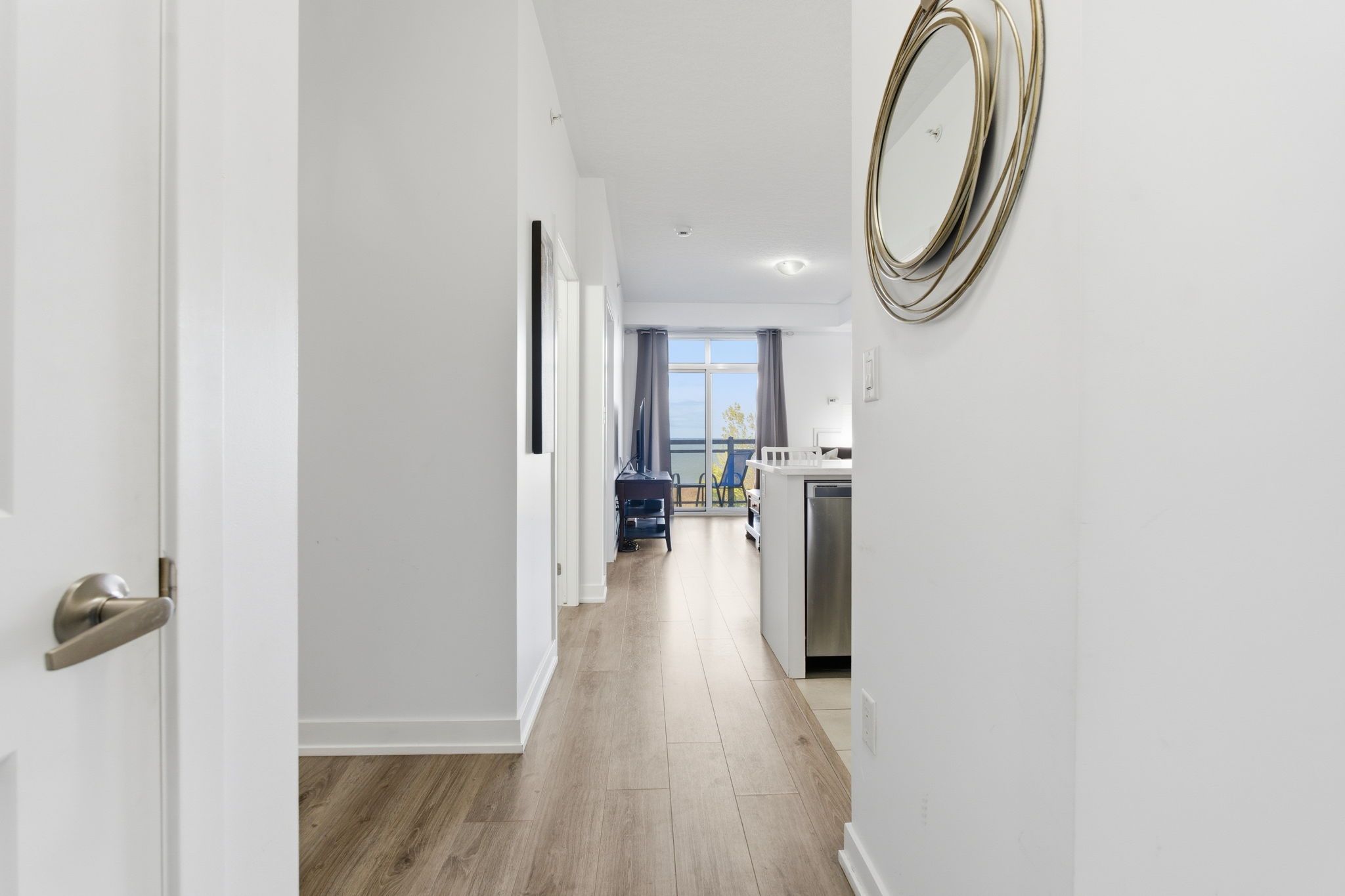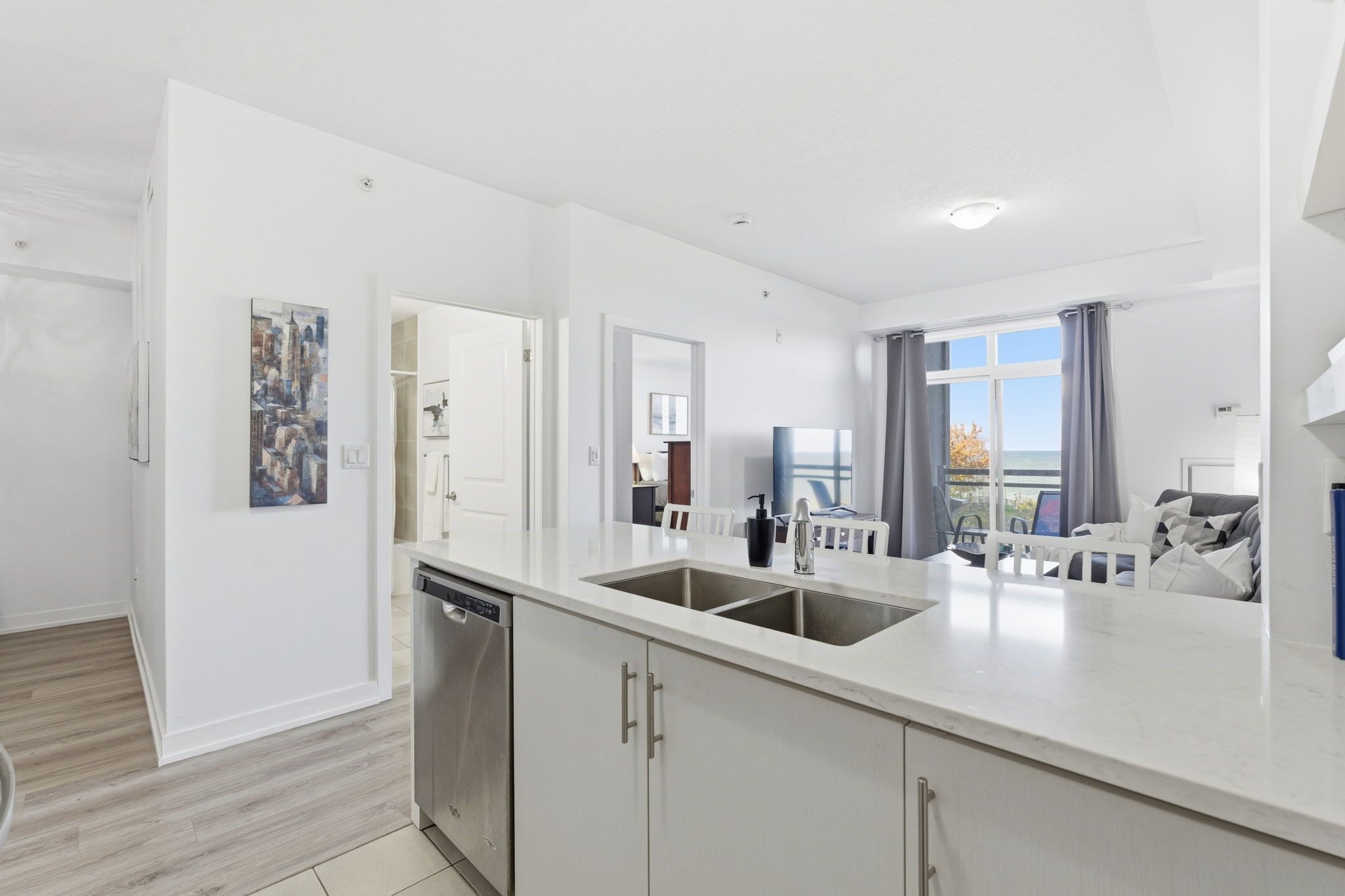 Lakeside living just 15 minutes from downtown burlington's vibrant shops, restaurants, and waterfront charm. Bright and spacious 1 bedroom + den condo with breathtaking waterfront views! This carpet-free home offers an open-concept design, a modern kitchen with quartz countertops, in-suite laundry, and plenty of natural light. Enjoy lake views from your balcony, living room, and even while preparing meals in the kitchen. The building offers fantastic amenities including a rooftop patio and party room. Ideally located minutes from the qew, go station, and scenic waterfront trails.