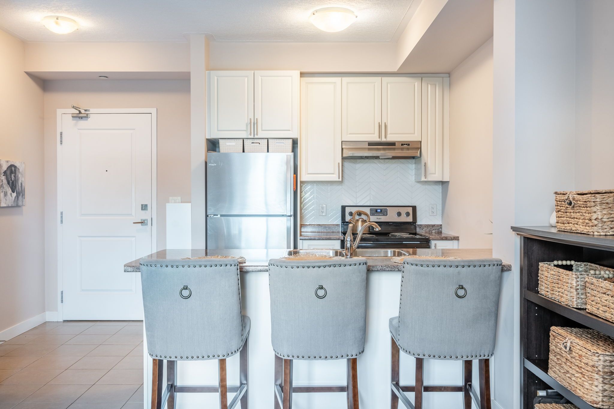 Discover boutique lakeside living in this stylish one-bedroom condo at the waterfront trails in stoney creek. Located in a charming four-storey building right on the lake, this freshly painted unit features newer wide plank flooring, a modern kitchen with stainless steel appliances and a breakfast bar. This unit features in-suite laundry and sliding doors that open to a private balcony. Enjoy the convenience of one owned underground parking space and one owned locker along with building amenities including a rooftop terrace with stunning lake views, an exercise room, bicycle storage and ample visitor parking! With a walking trail at your doorstep, easy beach access, quick access to the qew and local amenities, this condo is a perfect opportunity for first-time buyers or investors seeking a turn-key property in a prime waterfront location. Added bonus: the seller will pay the first 2 months of condo fees upon completion. Rsa.