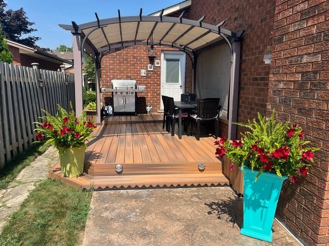 • Private backyard retreat with stamped concrete, composite decking, and a saltwater pool.