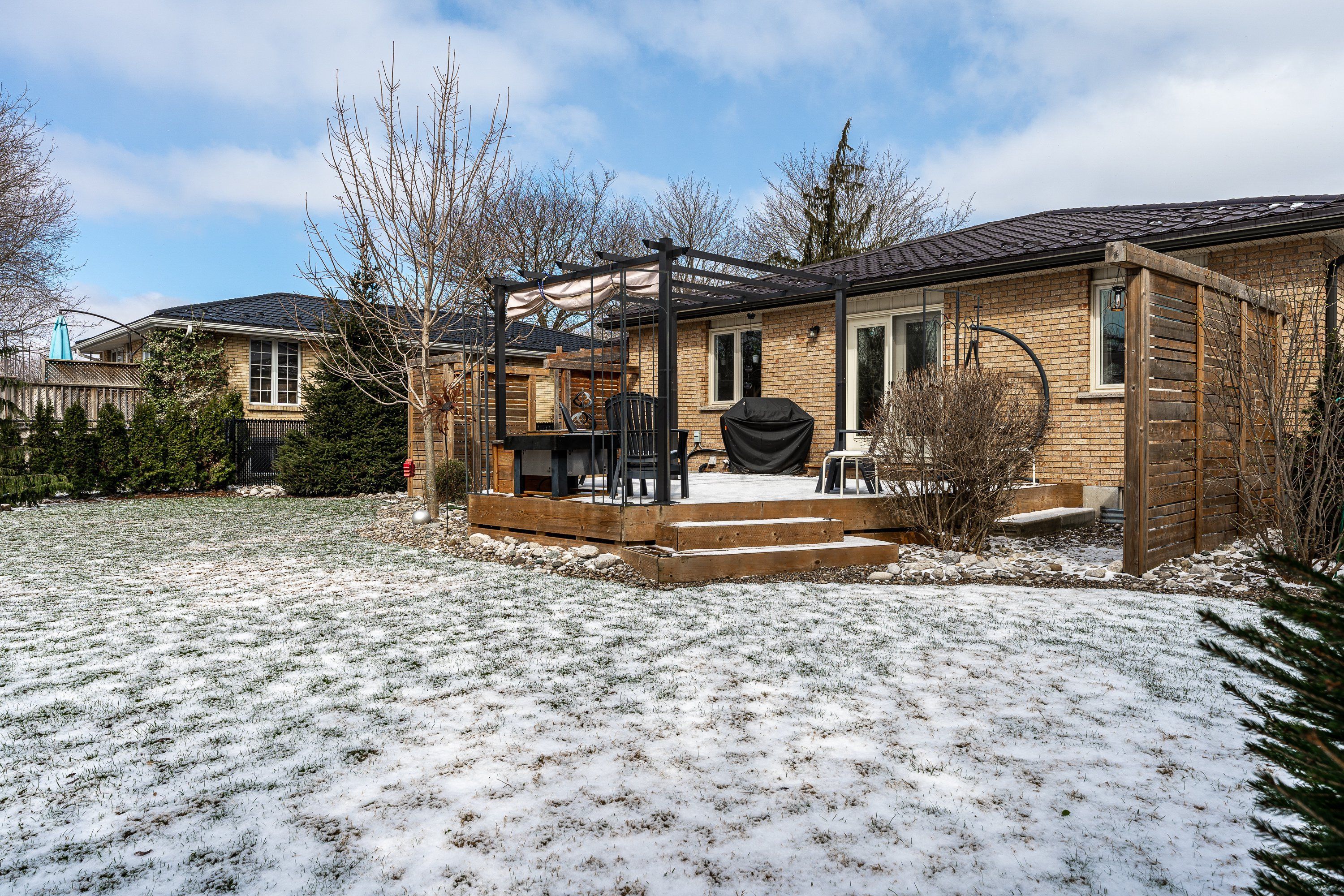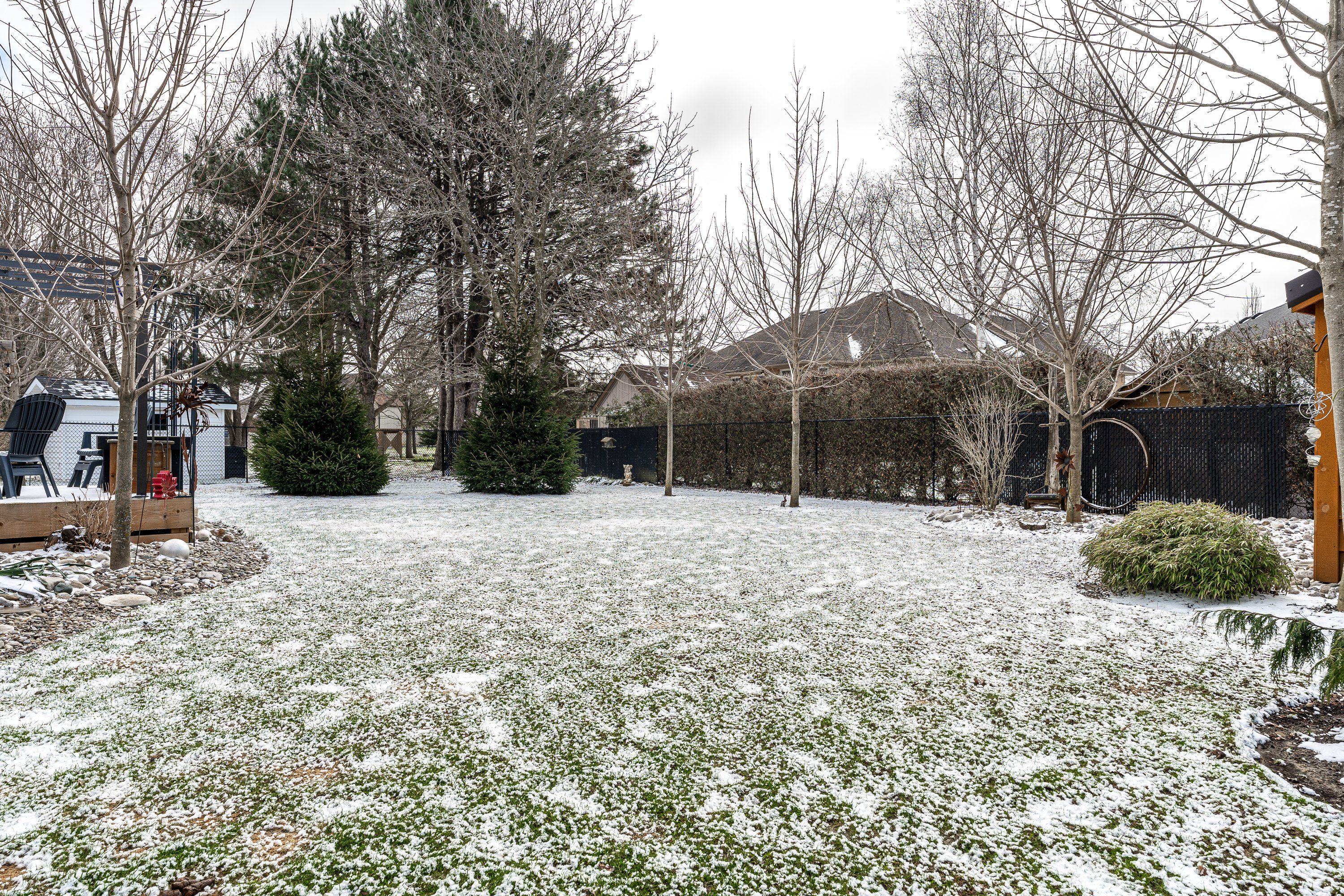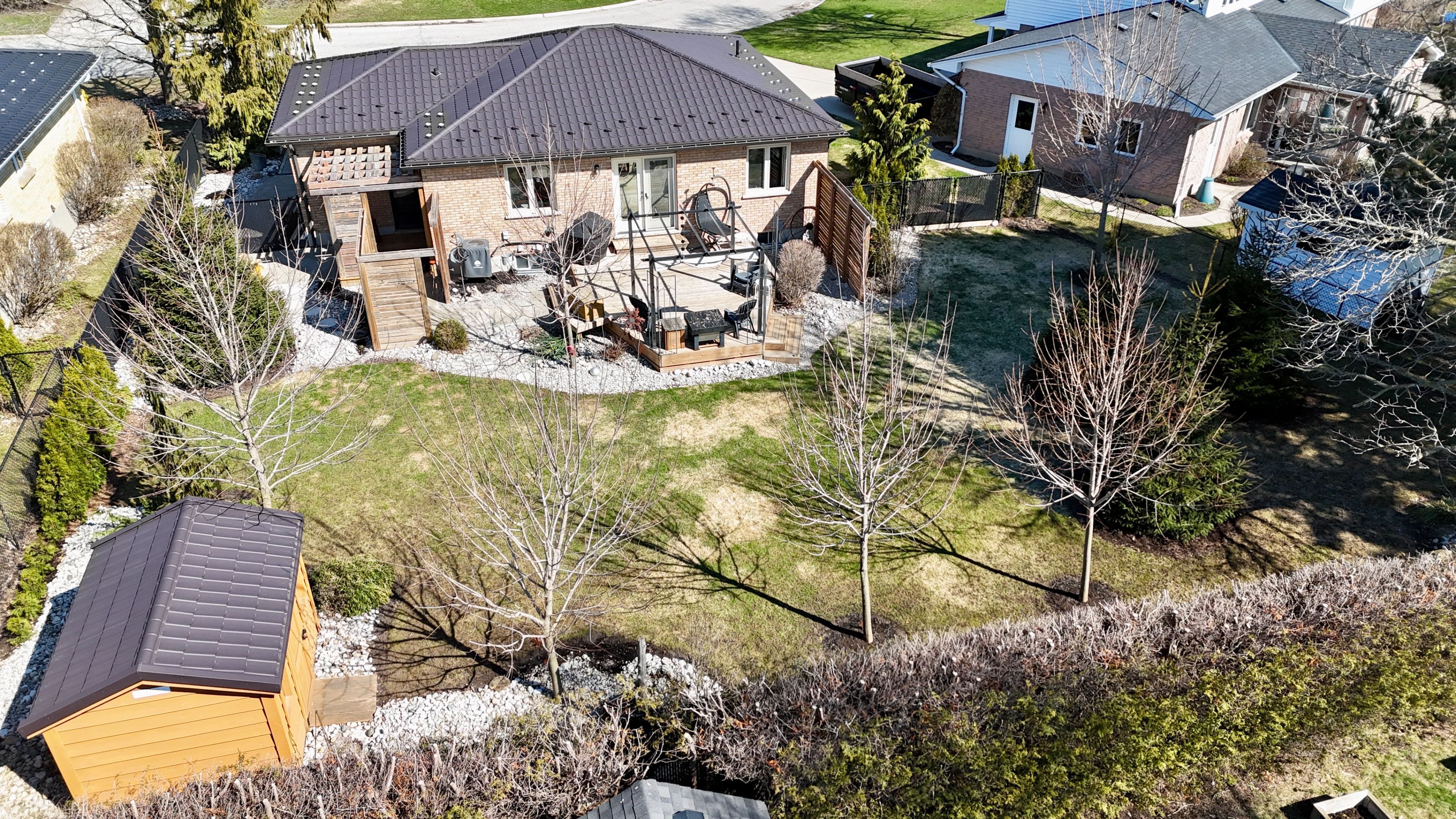 • Private, fenced backyard with mature trees and a large deck.