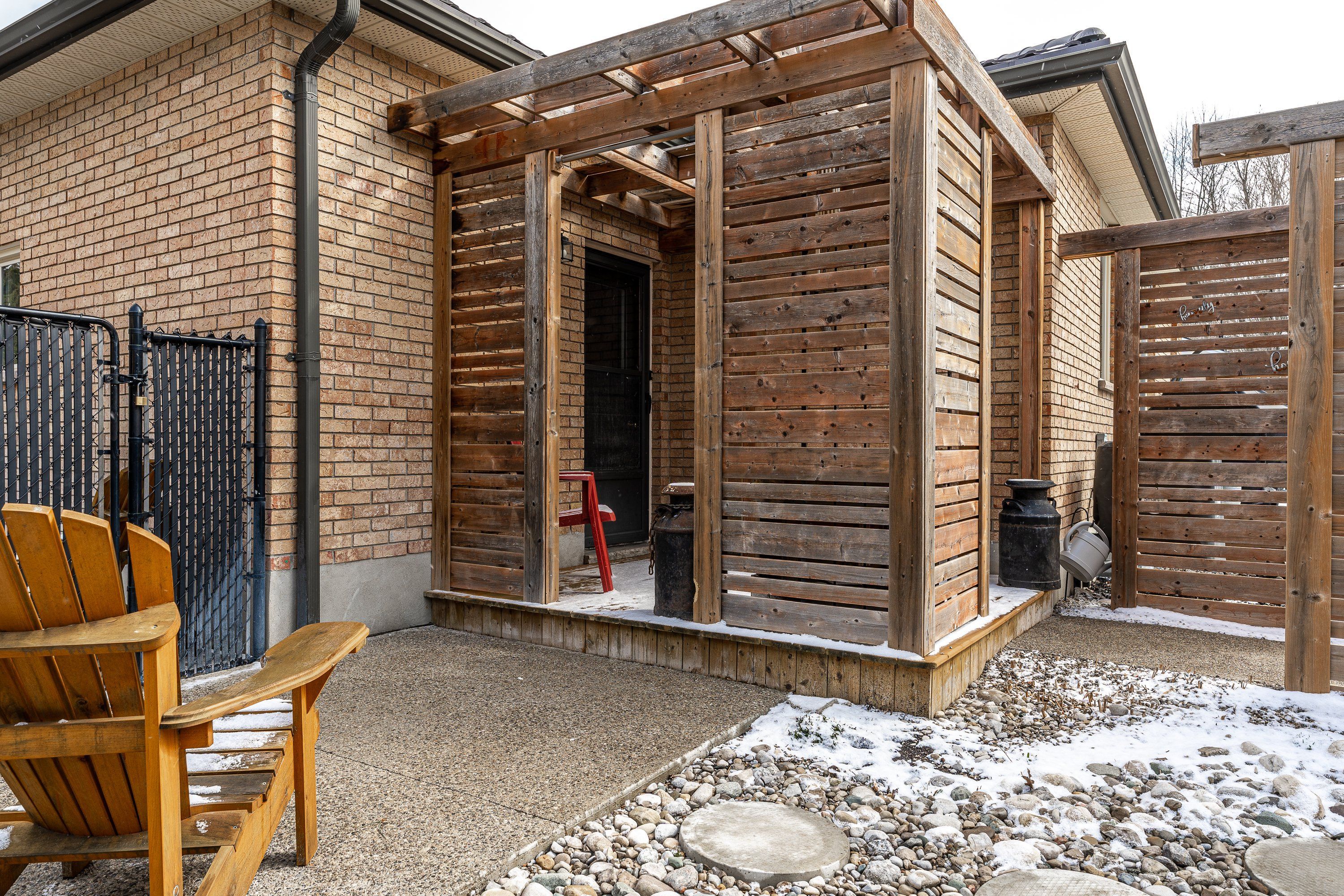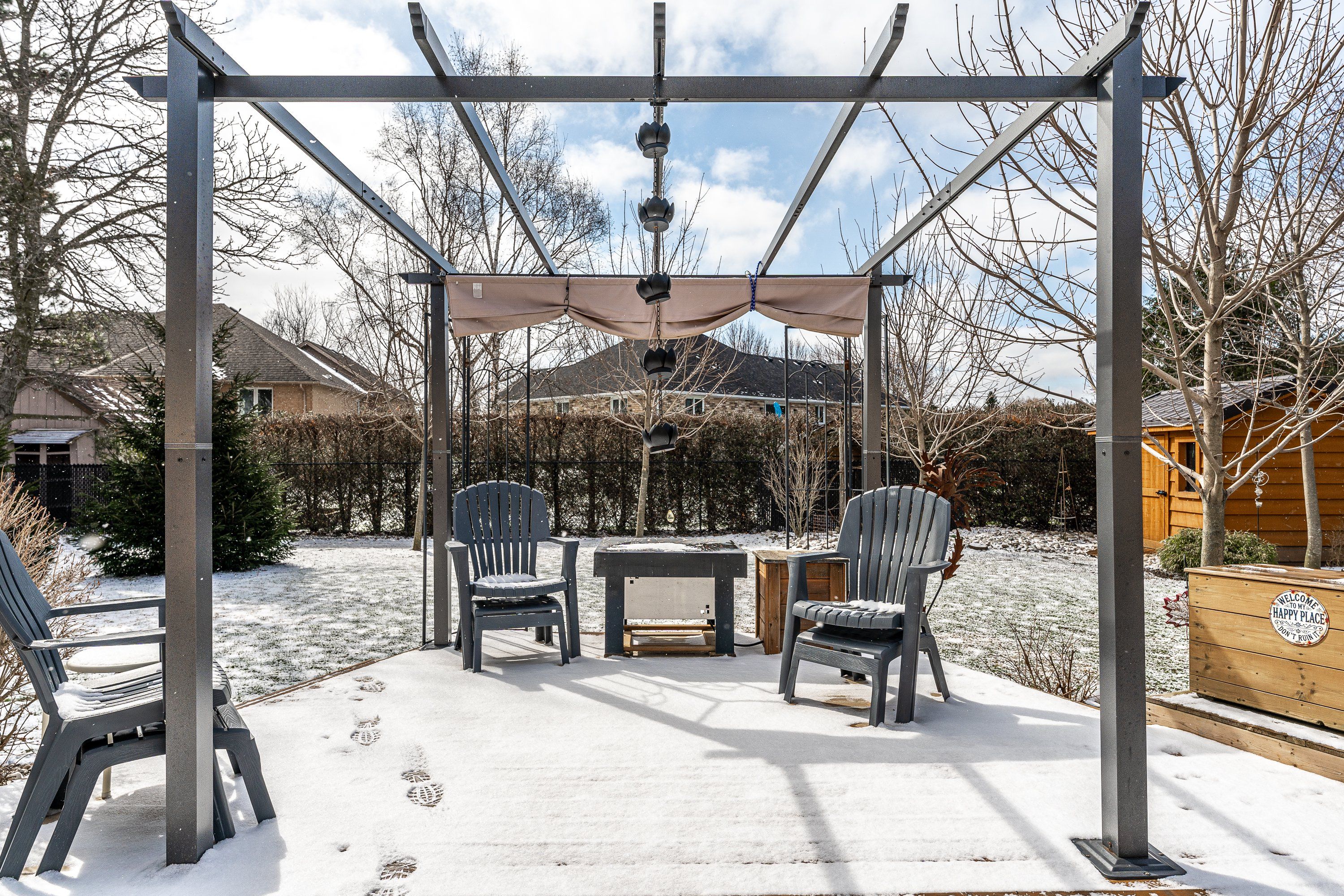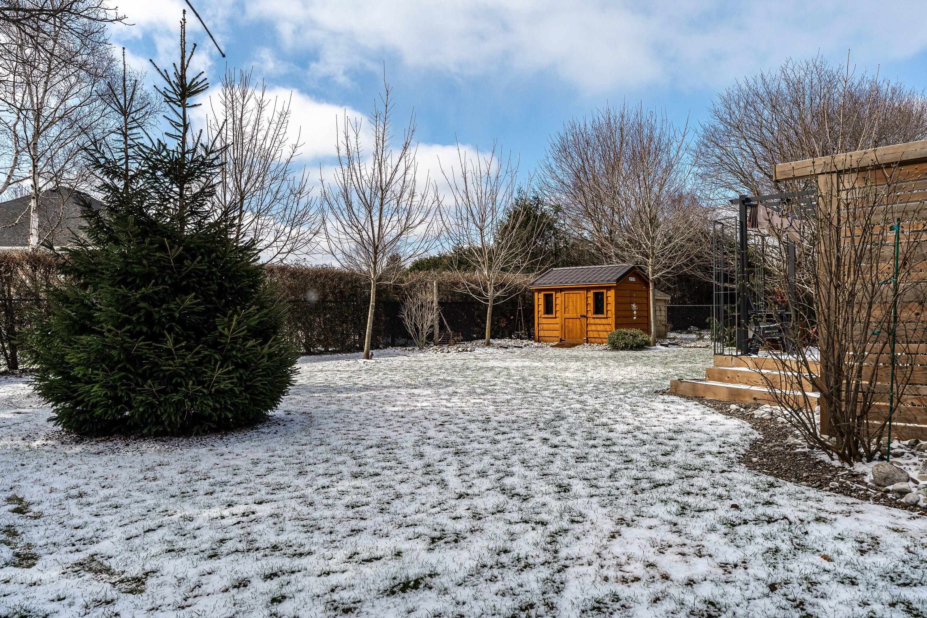 • Private, fenced backyard with mature trees and a large deck.