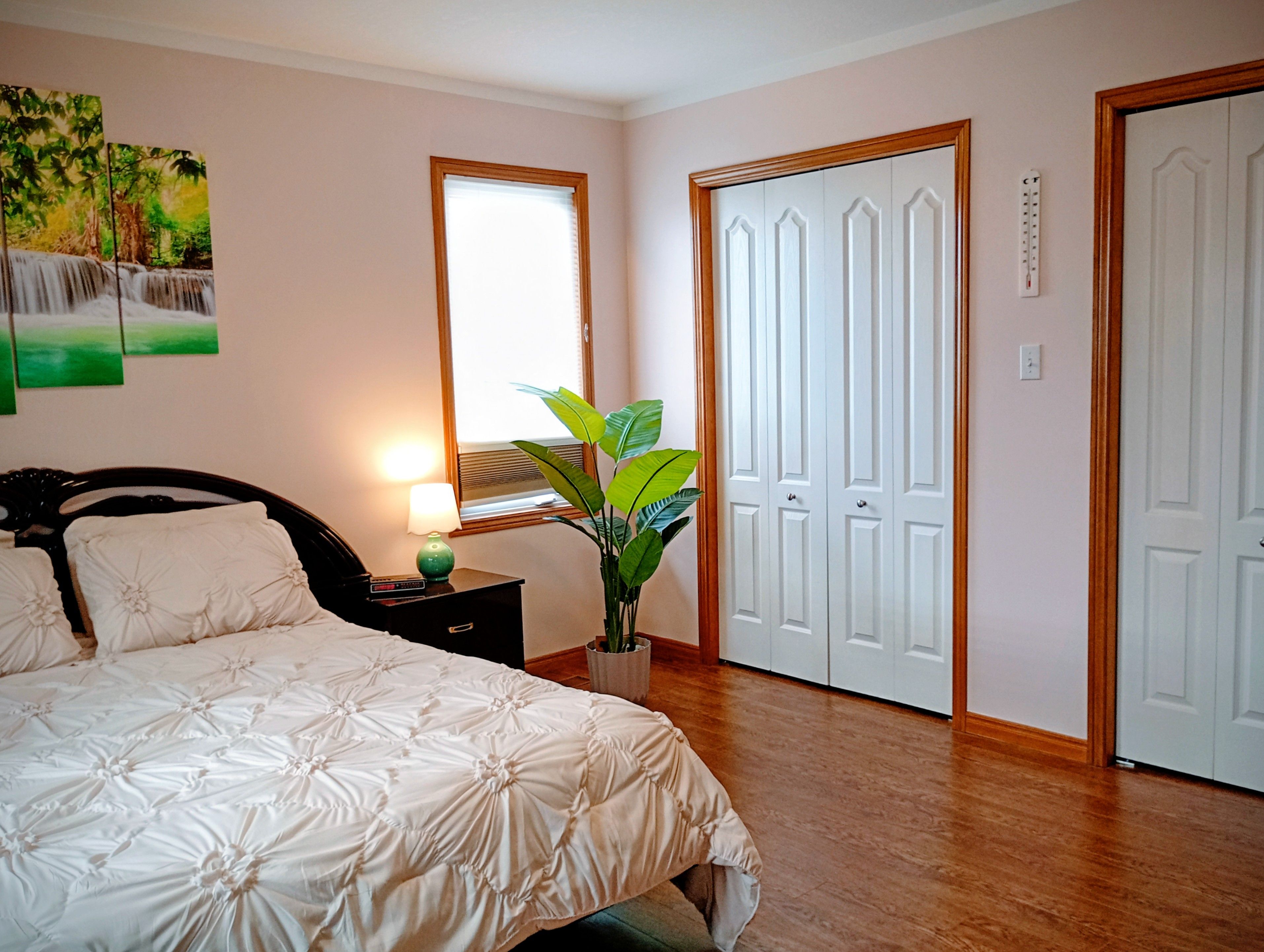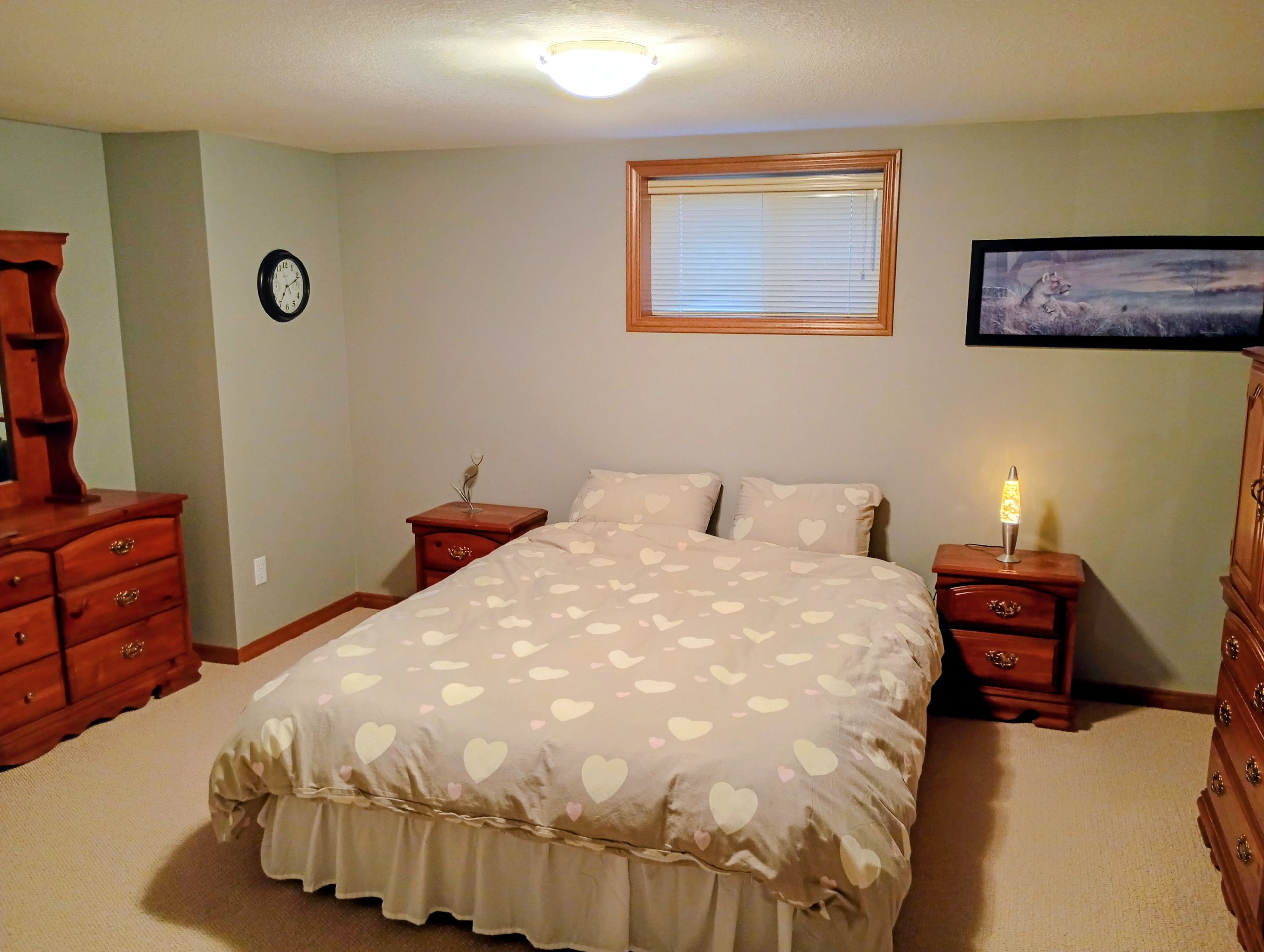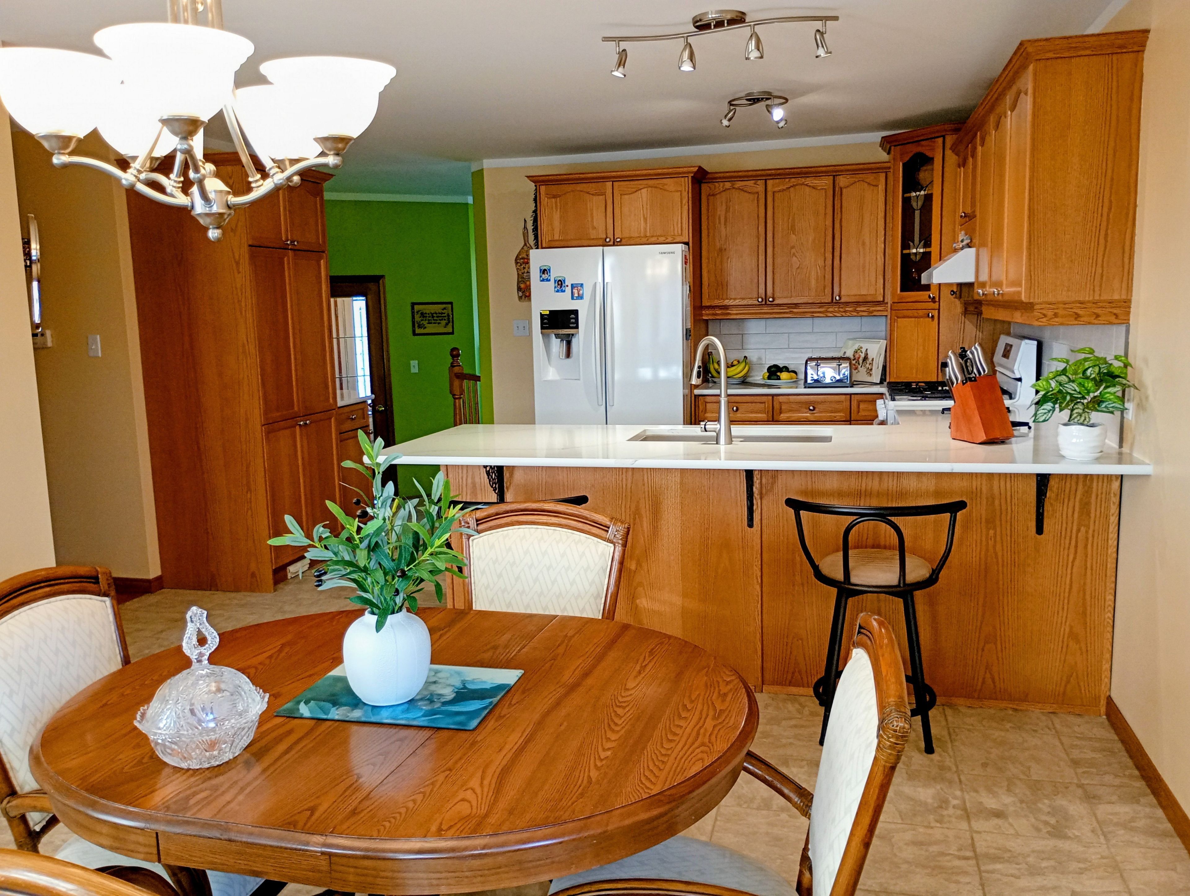 Welcome to your family dream home. Nestled on a quiet, newer cul-de-sac near the local high school, this beautifully solid all brick maintained home on a double lot offers the perfect blend of peaceful and convenient access to everyday amenities. From the moment you arrive, you'll be impressed with exceptional curb appeal and by the stamped concrete driveway-spacious enough to comfortably park four vehicles-leading to a double-car garage. Step inside to a warm and inviting foyer that opens into a cozy living room/lounge. The heart of the home is the elegant kitchen, featuring quartz countertops, a breakfast bar, and an adjoining dining area. From here, step out onto a large, enclosed wooden deck with adjustable shutters-ideal for entertaining or relaxing with gas bbq hook-up and with direct access to the backyard. The main floor is thoughtfully designed with: - a spacious primary bedroom with private access to a second enclosed deck-perfect for enjoying sunset views. - a second bedroom and a generous 4-piece family bathroom, complete with a jetted tub, separate shower, and linen closet. - convenient main-floor laundry for added ease. Downstairs, the fully finished lower-level offers: - a large rec room with a cozy gas fireplace - two additional bedrooms - a 3-piece bathroom - ample closet and storage space throughout - bonus: extra panel installed and ready to hook up your generator for peace of mind enjoy a gardener's paradise, bordered by emerald trees and featuring garden beds, fruit trees, berry bushes and adorned with vibrant perennials. Have peaceful moments on the concrete patio, watching birds and taking in the forest views-no rear neighbors! This warm and welcoming home is move-in ready and truly feels like home.