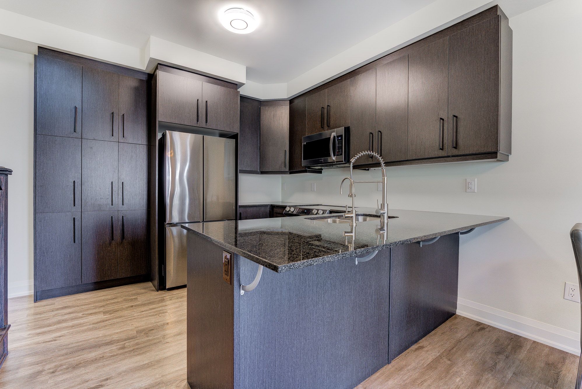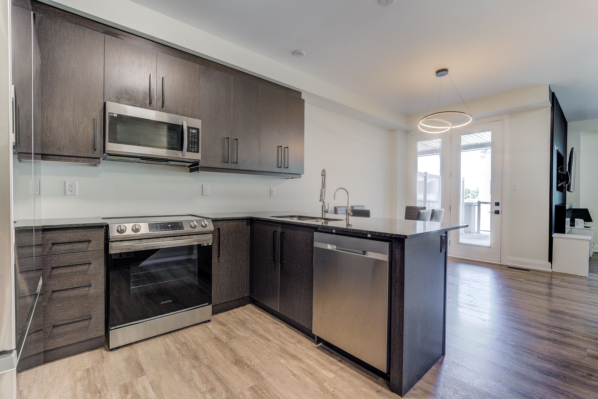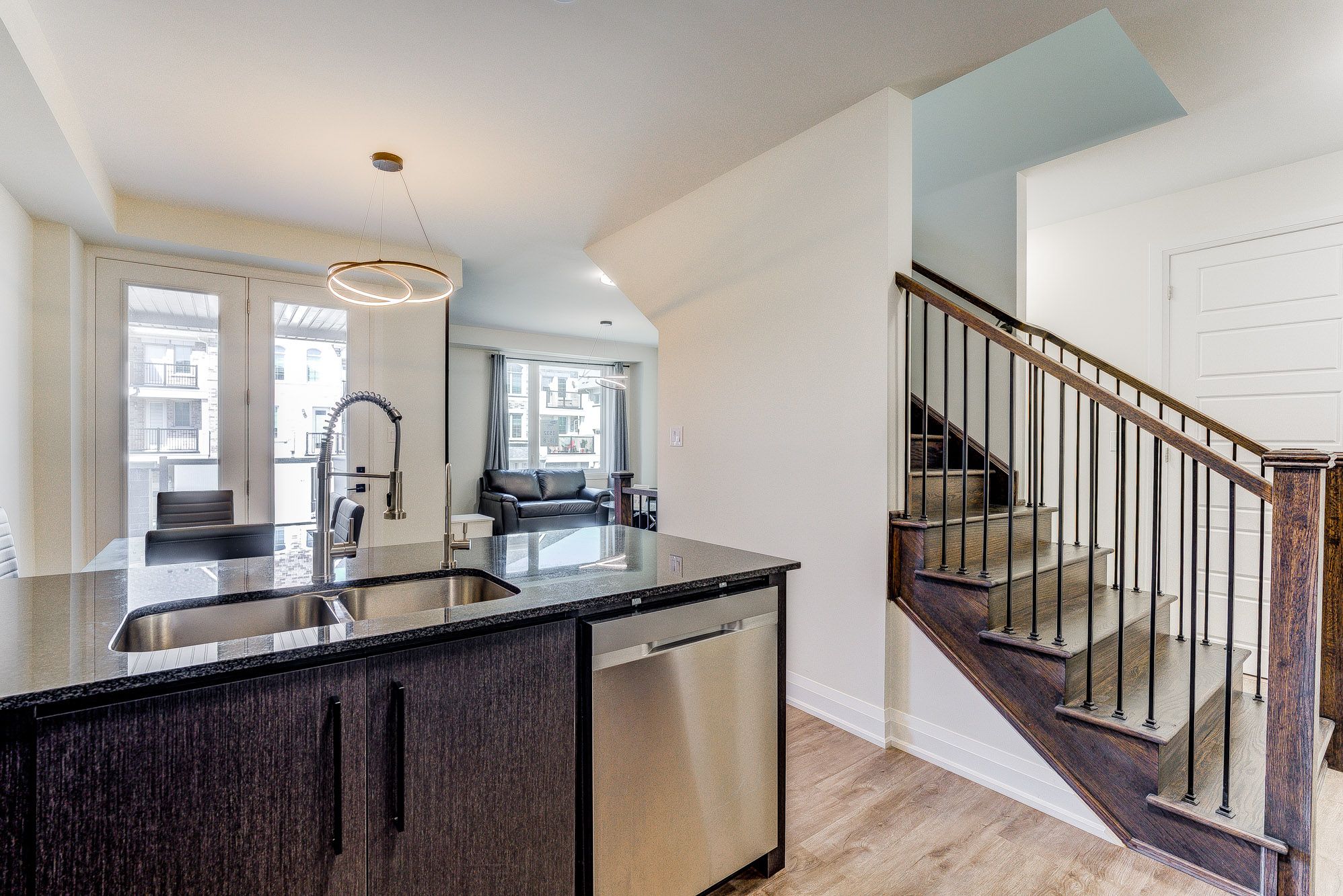 • Open-concept kitchen with stainless steel appliances and granite counters.