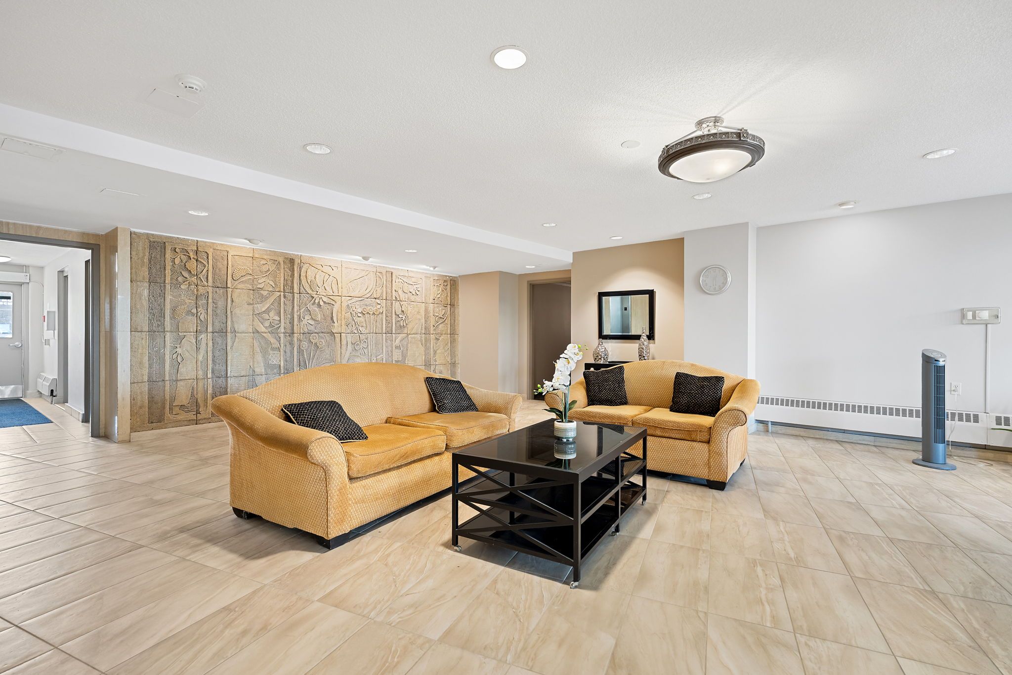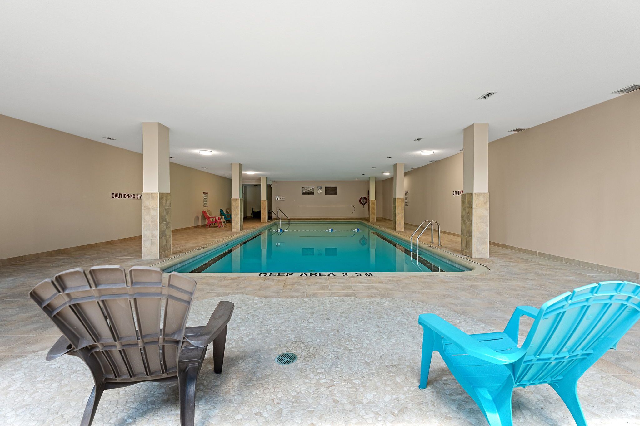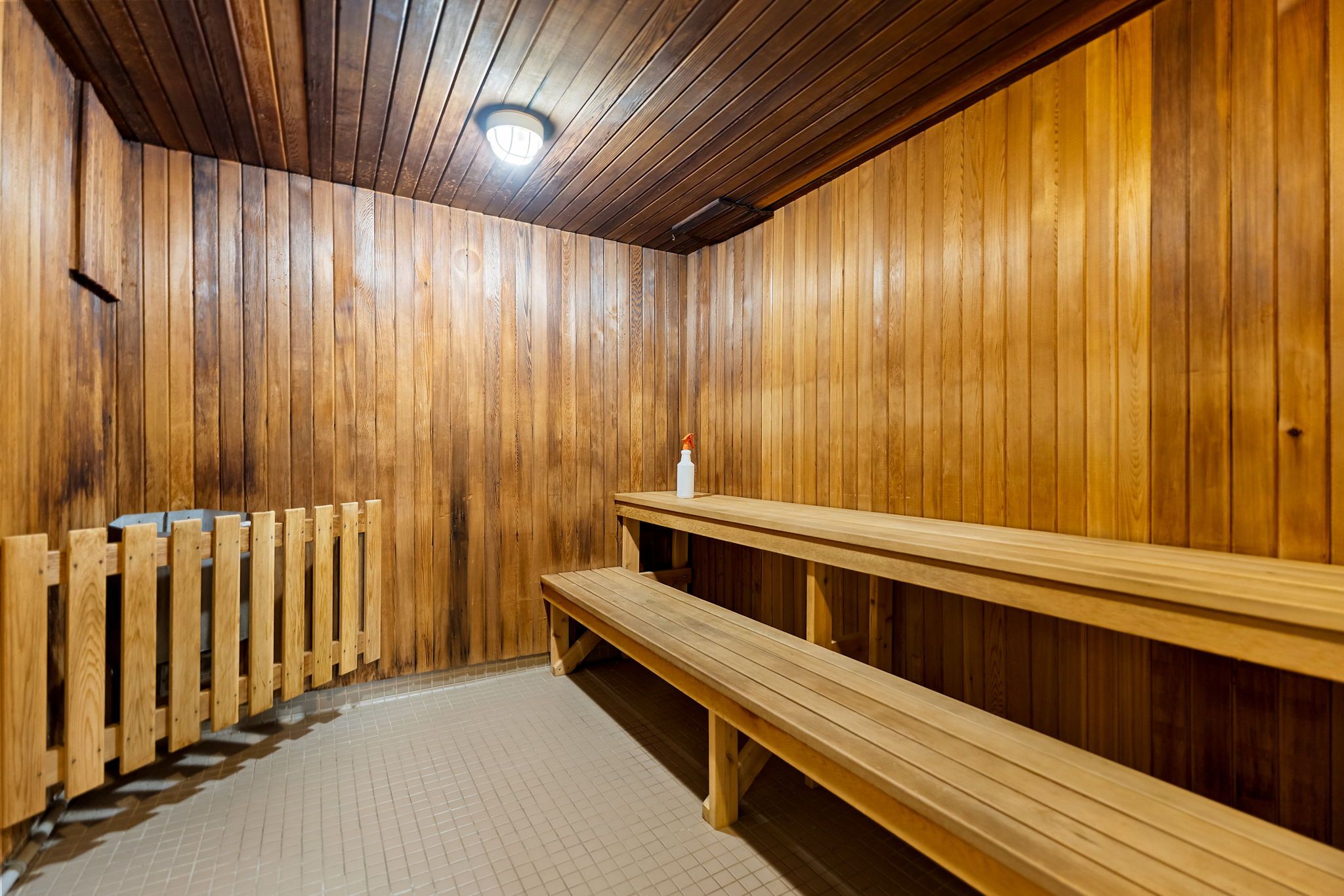 • Building amenities include a saltwater pool, sauna, and exercise room.