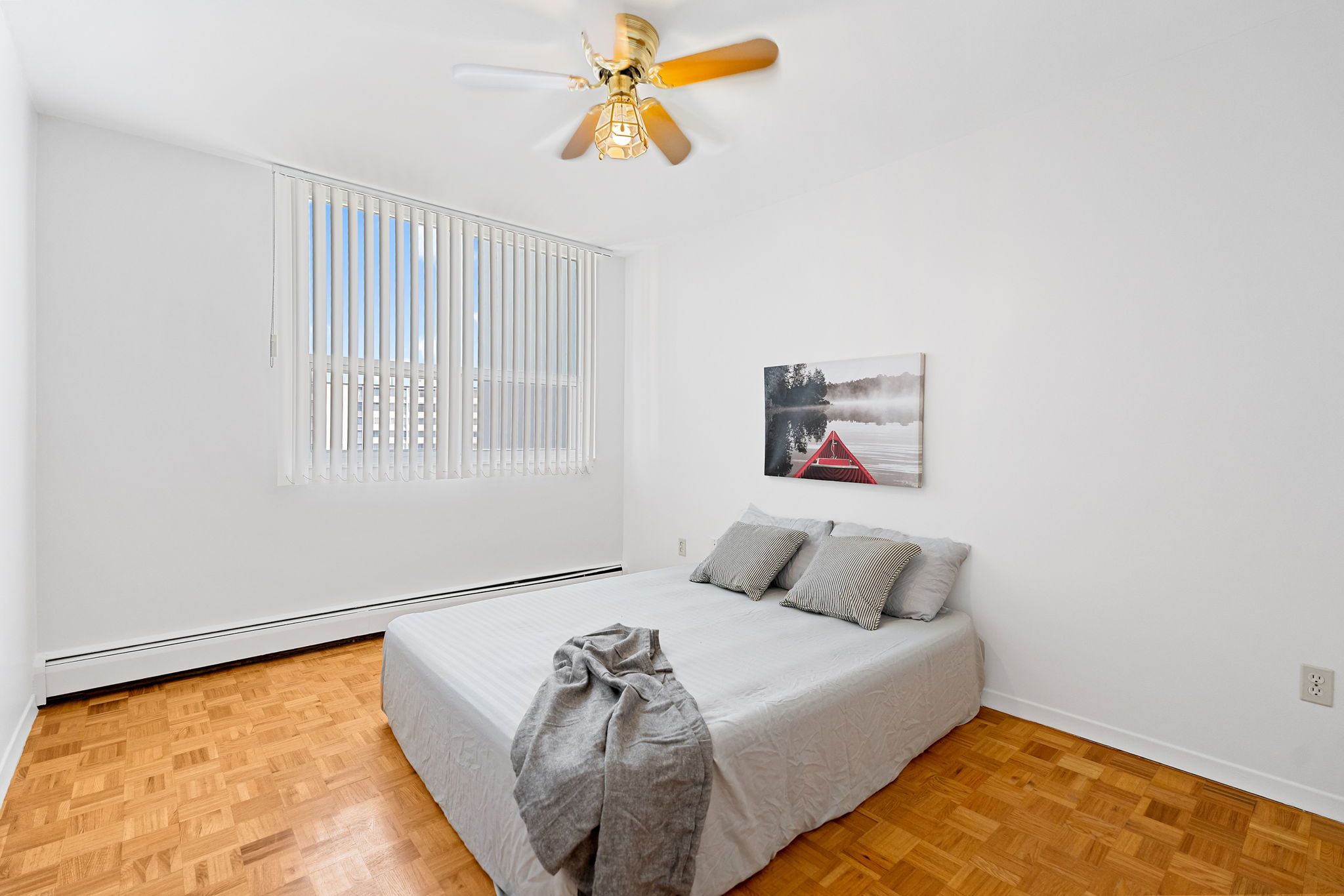 Carefree centennial tower living awaits at 35 towering heights! Perched on the tenth floor, this freshly painted 2 bedroom end unit suite offers a large balcony and the perfect blend of morning sunrises and evening sunsets. With a north-facing view, you'll avoid the harsh midday heat, keeping the unit nice and cool. The updated kitchen includes a large pantry, appliance garage, and a dishwasher. The bright, spacious living and dining areas feature gleaming parquet hardwood floors throughout and has a newer air conditioning unit. The large primary bedroom boasts a walk-in closet and ensuite privilege to a nicely updated bathroom, and the second bedroom is also generously sized. The building offers top-notch amenities: an indoor saltwater pool, sauna, exercise room, party room, sun terrace, bbq area, and more. Parking is available for $20/month outside and $50/month inside (with a waiting list for assigned spots inside). The maintenance fee covers heat, hydro, water, a storage locker, building maintenance, and insurance. Plus, it's close to public transit, shopping, highway access, and brock university. Pet friendly & move-in ready building!