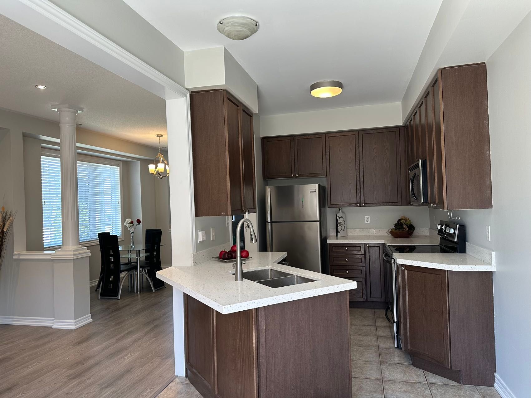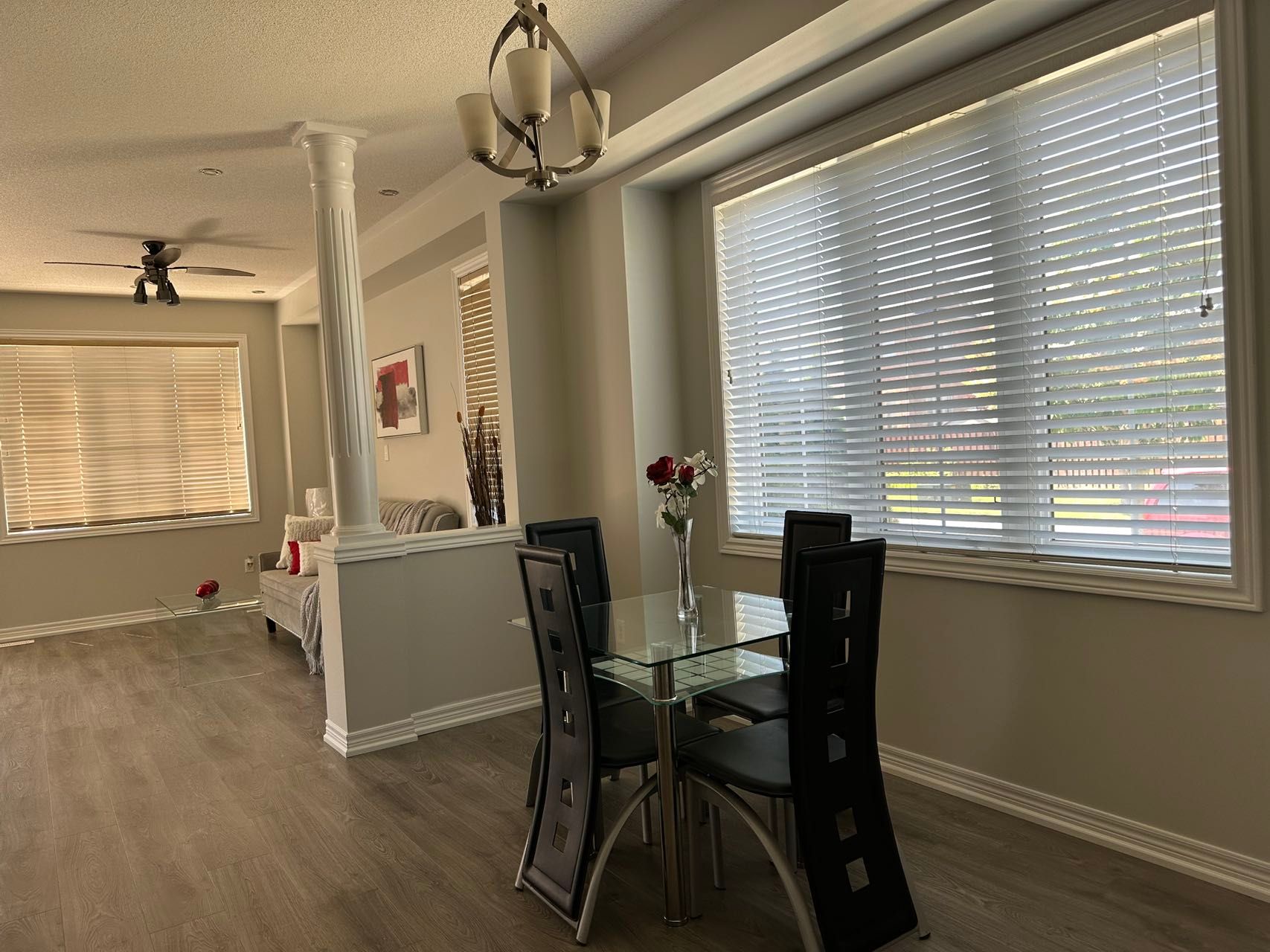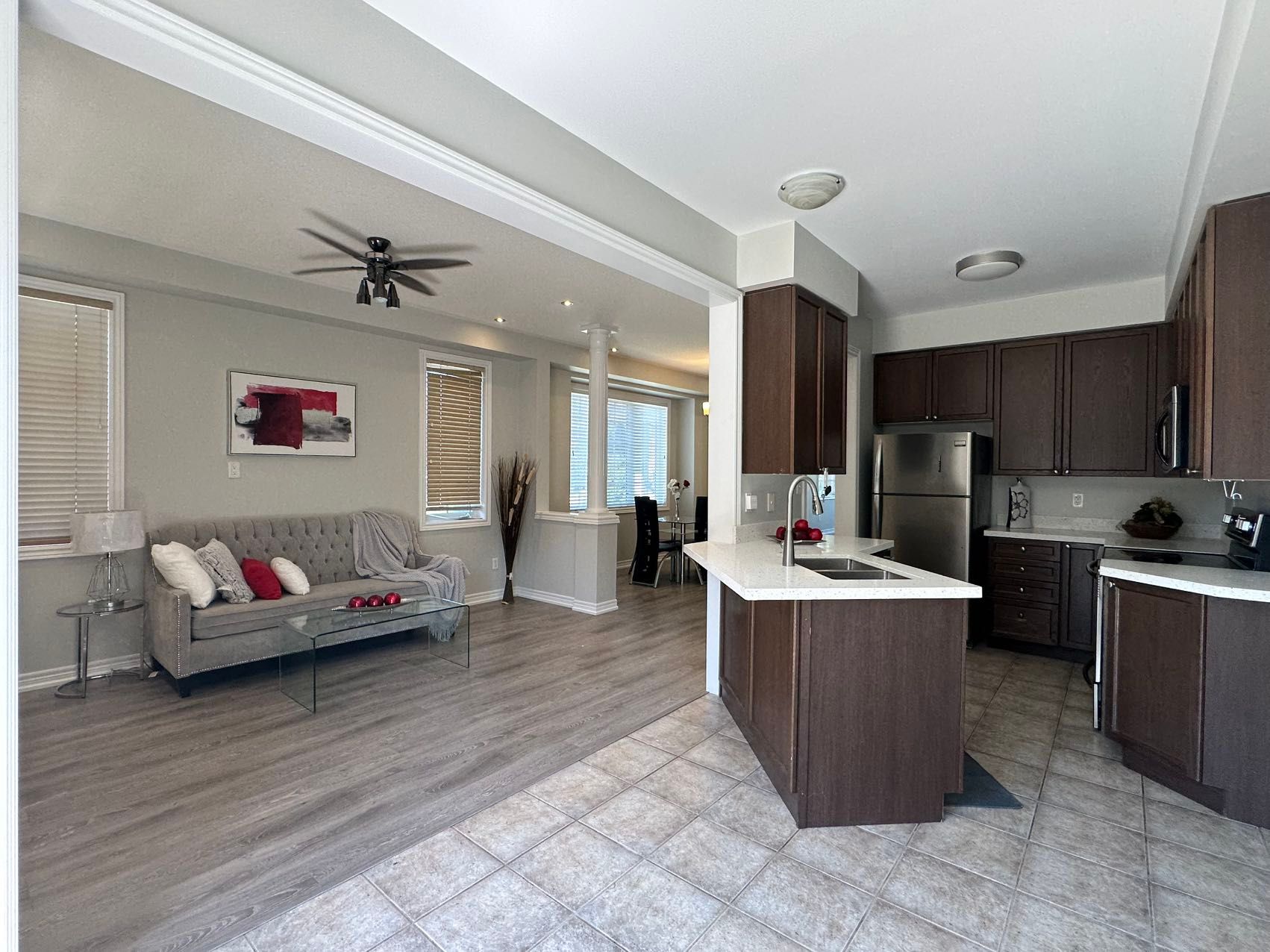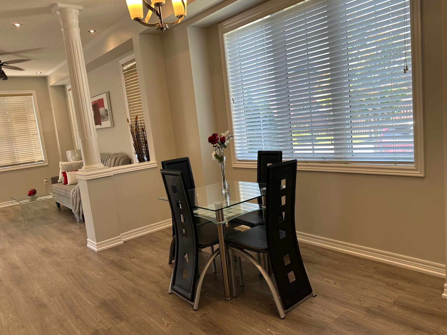 Beautifully updated and sun-filled corner unit offering rare 4-bedroom layout on a large lot! /enjoy abundant natural light through three-sided windows and a south-facing family room with walk-out to a spacious backyard / perfect for outdoor enjoyment/key features:newly renovated throughout with modern laminate flooring and fresh paint/new granite countertops in the kitchen/open-concept main floor with 9' ceilings and south-facing kitchen, dining, and family room/impressive cathedral ceilings and oversized windows in the living room /ideal as a library or formal sitting area/primary bedroom features a large walk-in closet and a 4-piece ensuite with separate tub and shower/second primary-sized bedroom with large picture windows/no sidewalk extended driveway fits 2 cars, plus direct garage access from inside the house/bright and airy layout with windows throughout the home/close to recreation centre, parks, library, public transit, and schools/this sun-drenched and spacious home is ideal for families seeking comfort, style, and convenience in a sought-after location/no survey.