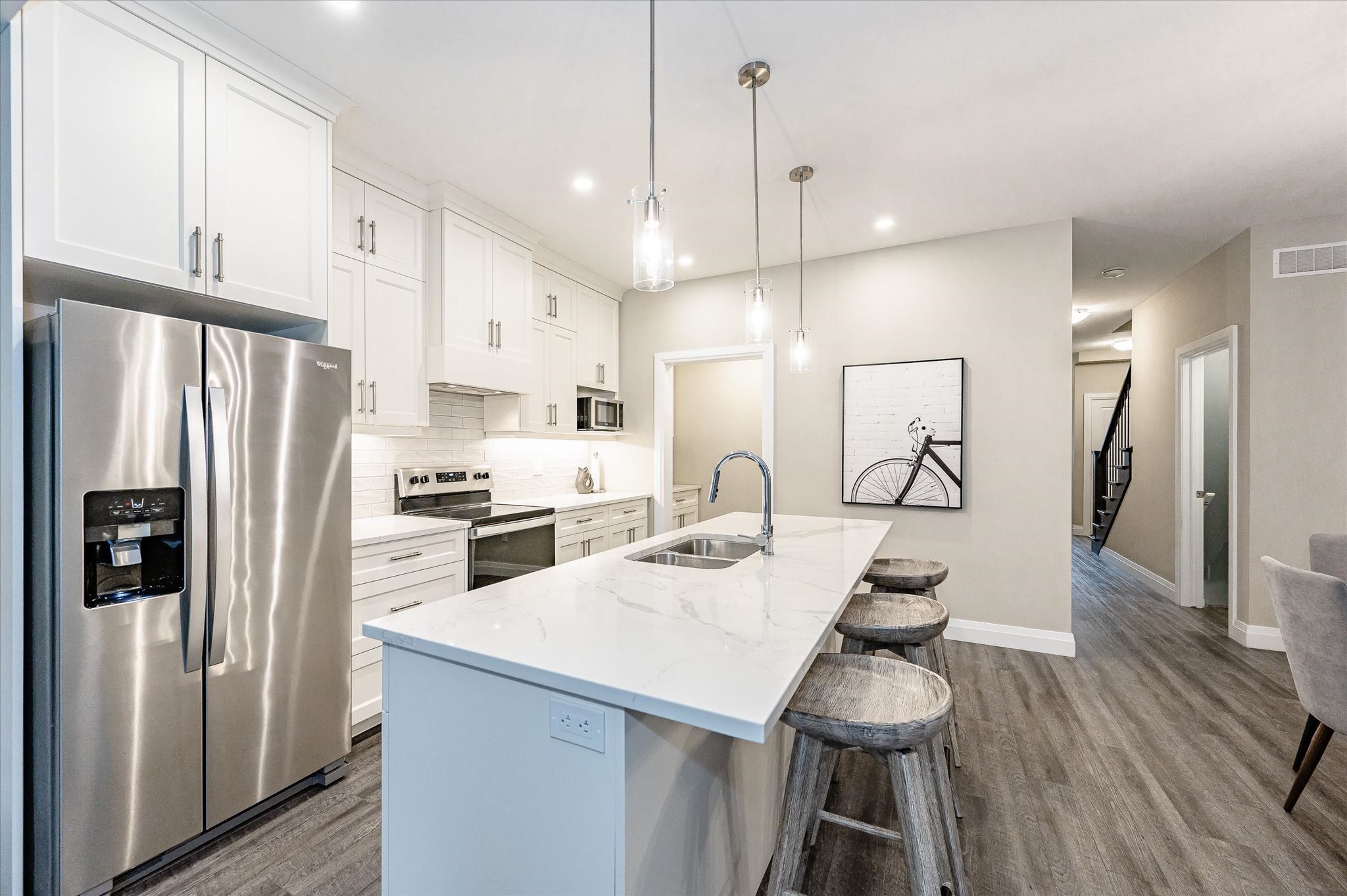 A beautifully designed freehold hillside townhome offering 1,860 square feet of refined living space, where modern style meets everyday functionality. The open-concept main floor feels bright and inviting, ideal for both relaxed living and hosting, and showcases a thoughtfully designed kitchen complete with a rare butler's pantry-perfectly blending practicality with a touch of luxury. Soaring 9-foot ceilings and large windows fill the space with natural light, enhancing the home's airy, elevated feel and highlighting the quality finishes throughout. The primary suite serves as a private retreat, featuring a generous walk-in closet and a spa-inspired ensuite, while two additional well-proportioned bedrooms provide flexibility for family, guests, or a dedicated workspace. A second-floor laundry room adds to the home's everyday ease. The fully finished lower level offers a bright and versatile extension of living space, ideal for a rec room, home gym, or cozy media area. Set in guelph's sought-after north end, this home combines peaceful surroundings with convenient access to nearby amenities-an exceptional opportunity to experience stylish, low-maintenance living.