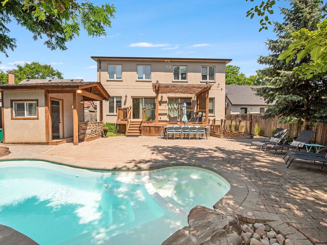 Welcome to an exceptional residence in the humberlea community! Nestled on a quiet, tree-lined street, this unique detached home offers over 3,600 square feet of meticulously designed living space. Main floor features - grand entrance, separate living and dining room with crown mouldings, wainscoting, pot lights, hardwood flooring. Beautiful open concept kitchen with oversized island great for entertaining guests or casual dining. 6 burner gas stove with wall mounted pot filler. Custom cabinetry, crown mouldings, walkout to backyard deck, eat in kitchen, combined family room which gives a spacious yet comfortable feel. Side entrance, direct entrance into garage & powder room which completes this functionallayout. 2nd floor features - primary bedroom - elegant 6 piece ensuite, walk in closet, potlights, crown mouldings overlooking back beautiful backyard. 2nd bedroom 3 piece ensuite, closet, 3rd and 4th bedroom share 4 piece ensuite with custom built in cabinetry. Hardwood throughout. Basement features - open concept living space with full sized kitchen with porcelain tiles flooring, eat-in area and living room. Vinyl flooring. Separate walk up entrance to private backyard. Bathroom, cold room and plenty of storage space. Exterior beautifully landscaped, interlocking throughout. Wood deck with pergola, inground salt water pool with hot tub. Cabana with 3 piece bathroom, outdoor kitchen, garden shed. Enjoy this private oasis!!!