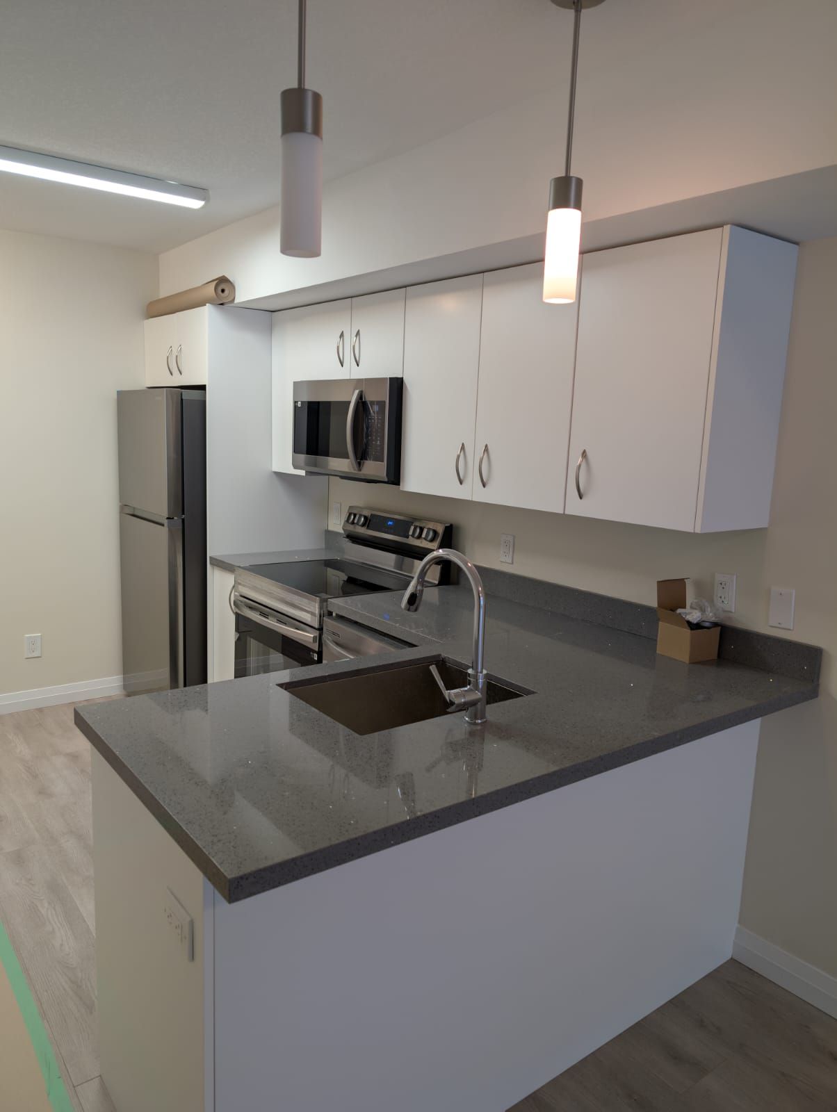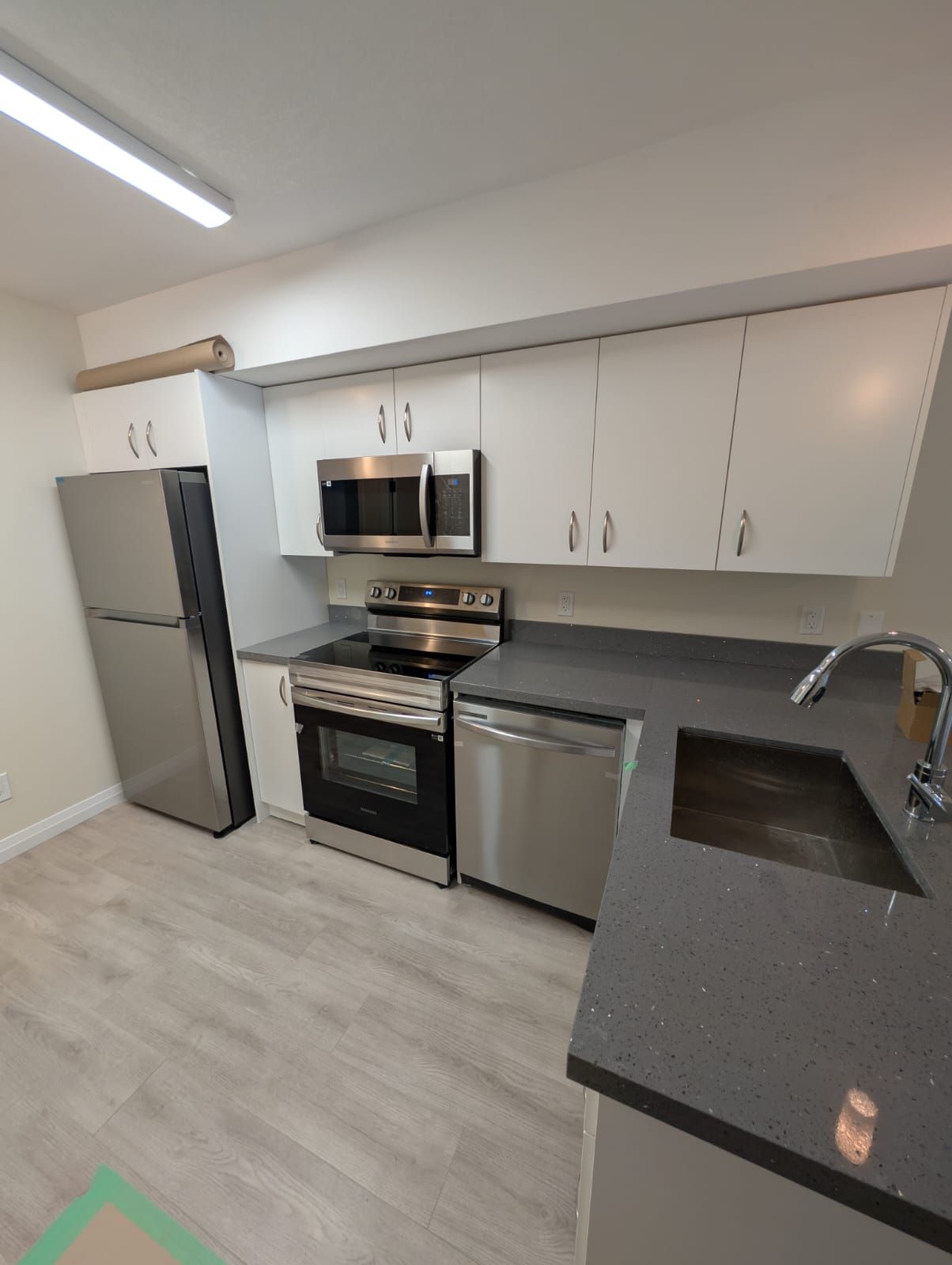 • Open concept kitchen with stainless steel appliances and quartz countertops.