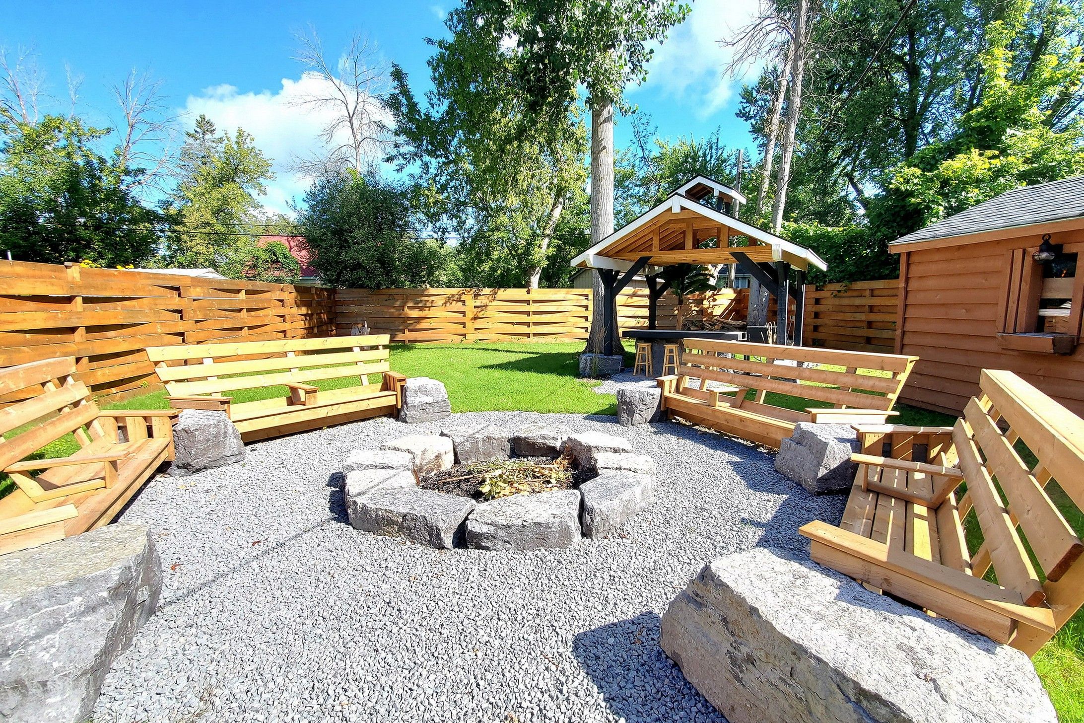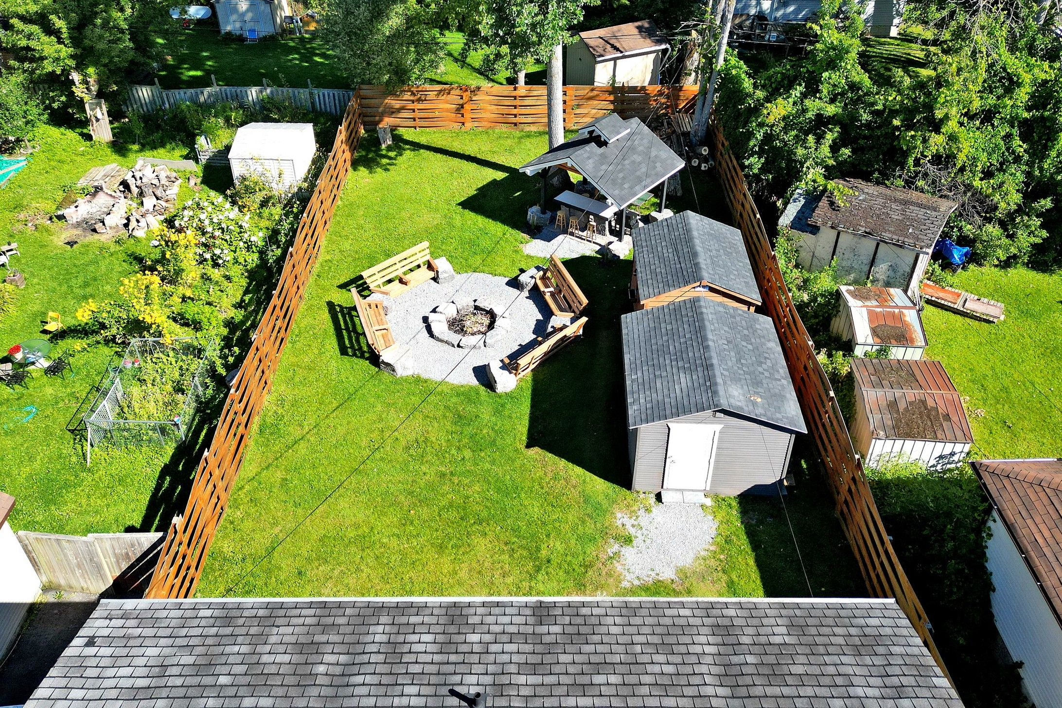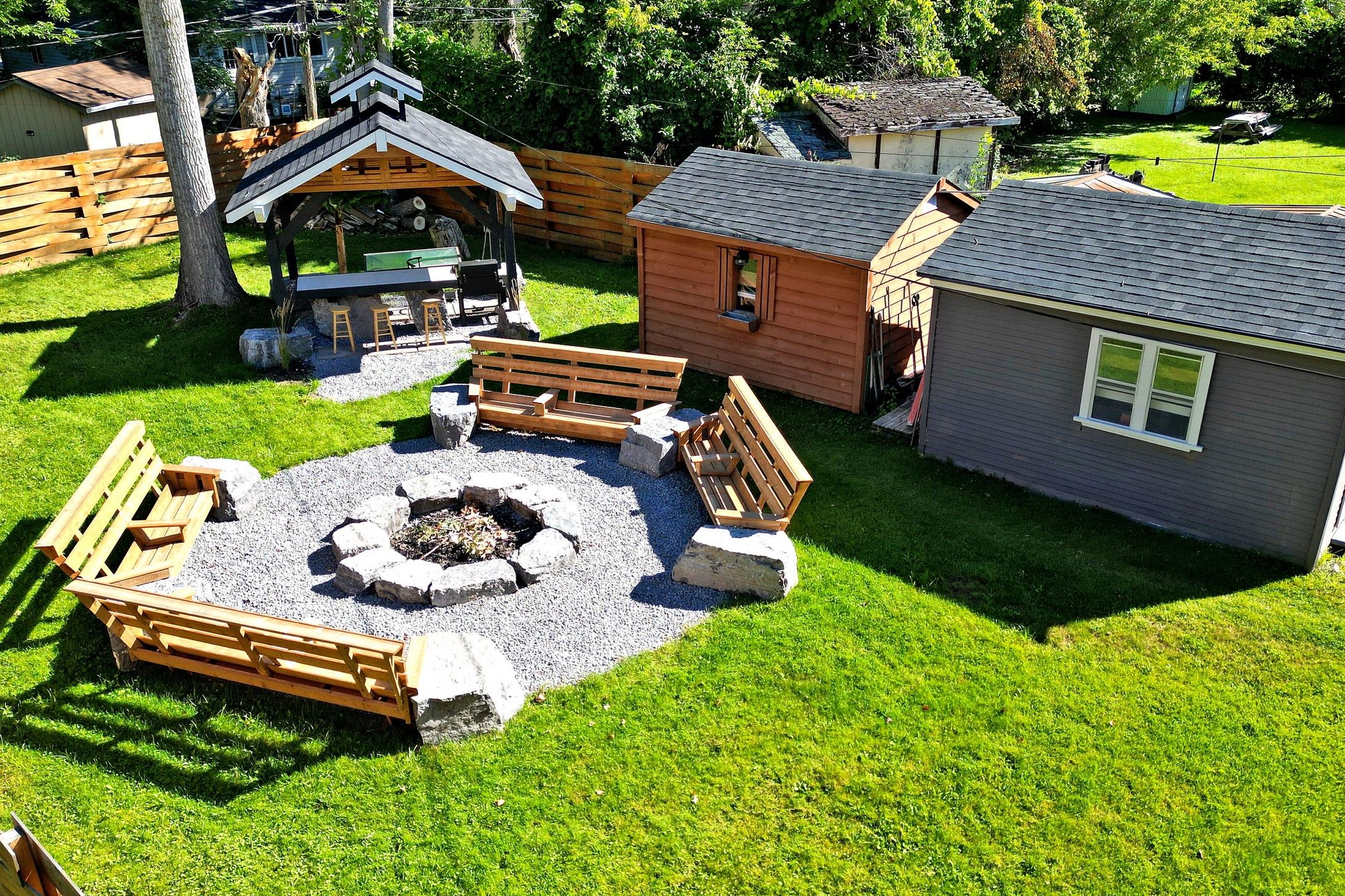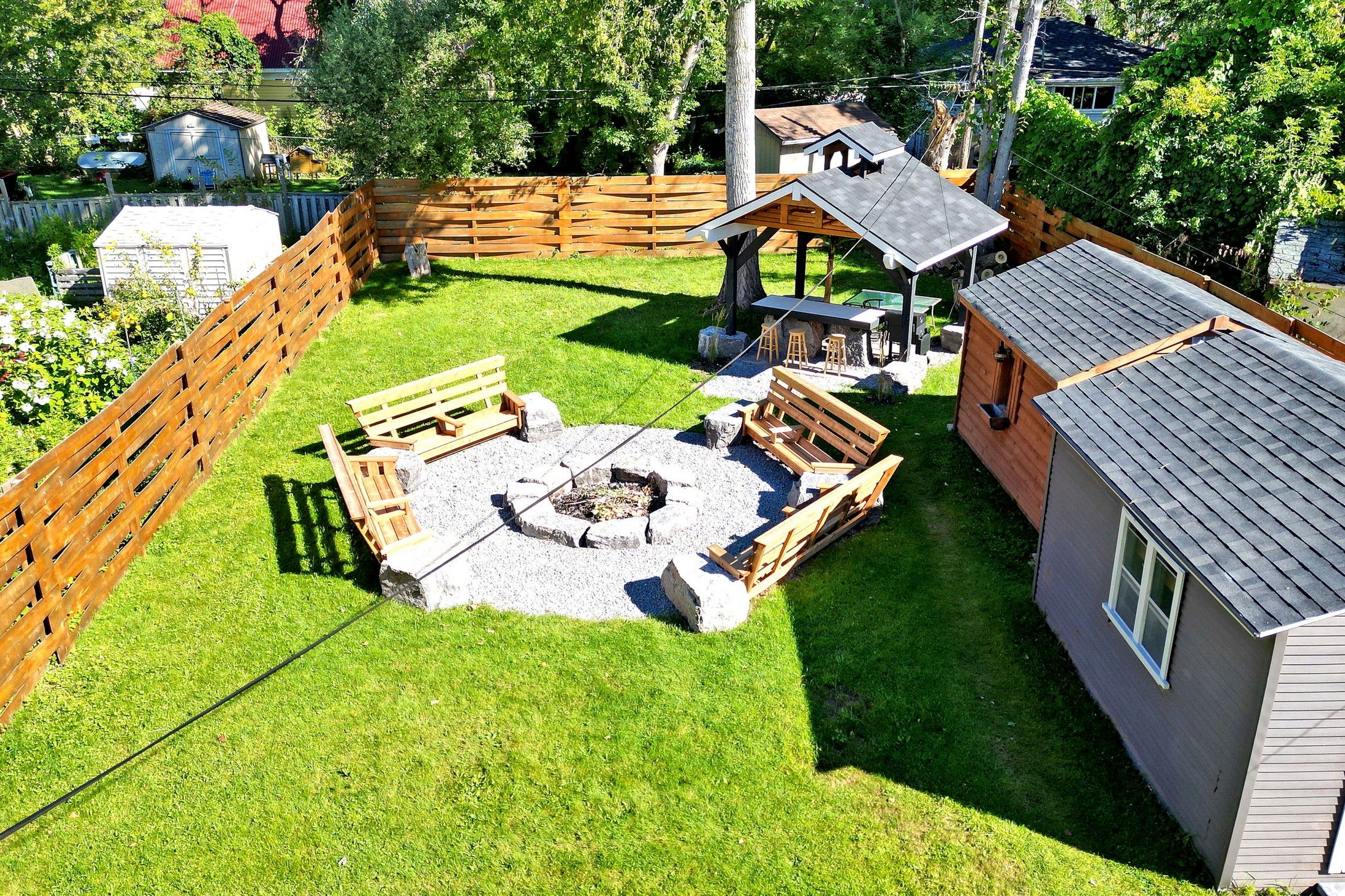 • Fully fenced backyard featuring outdoor kitchen, tiki bar, and firepit.