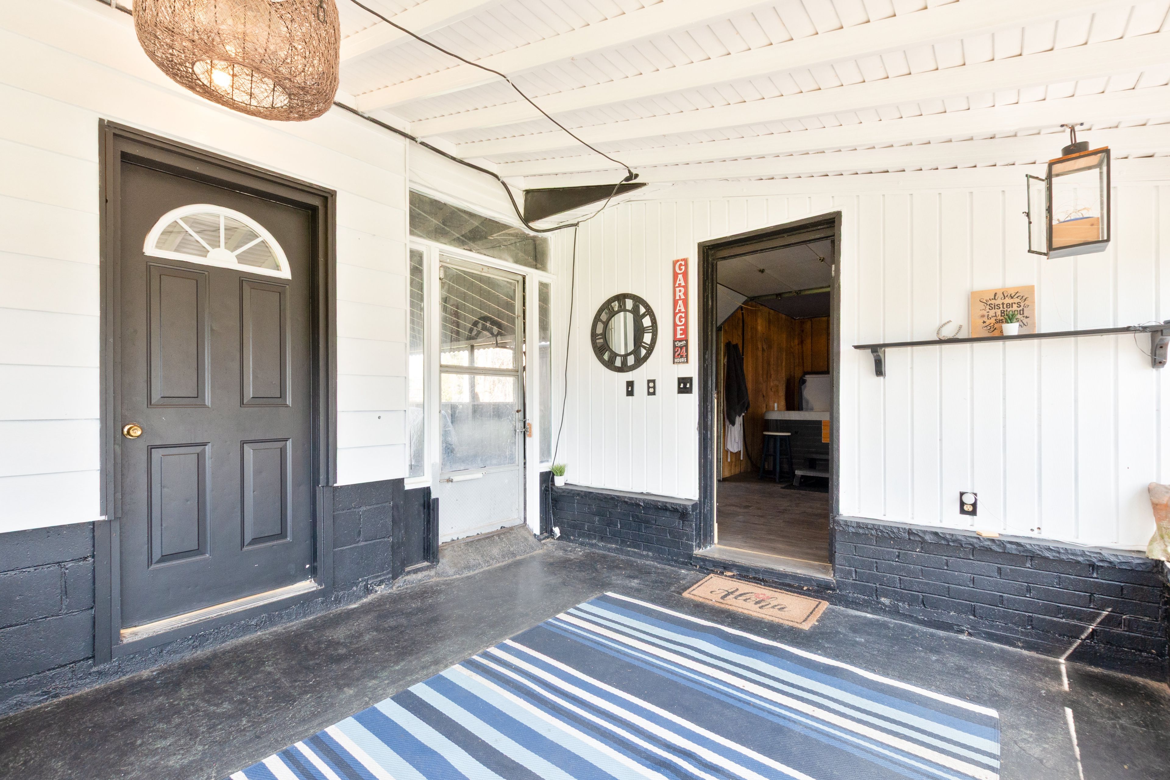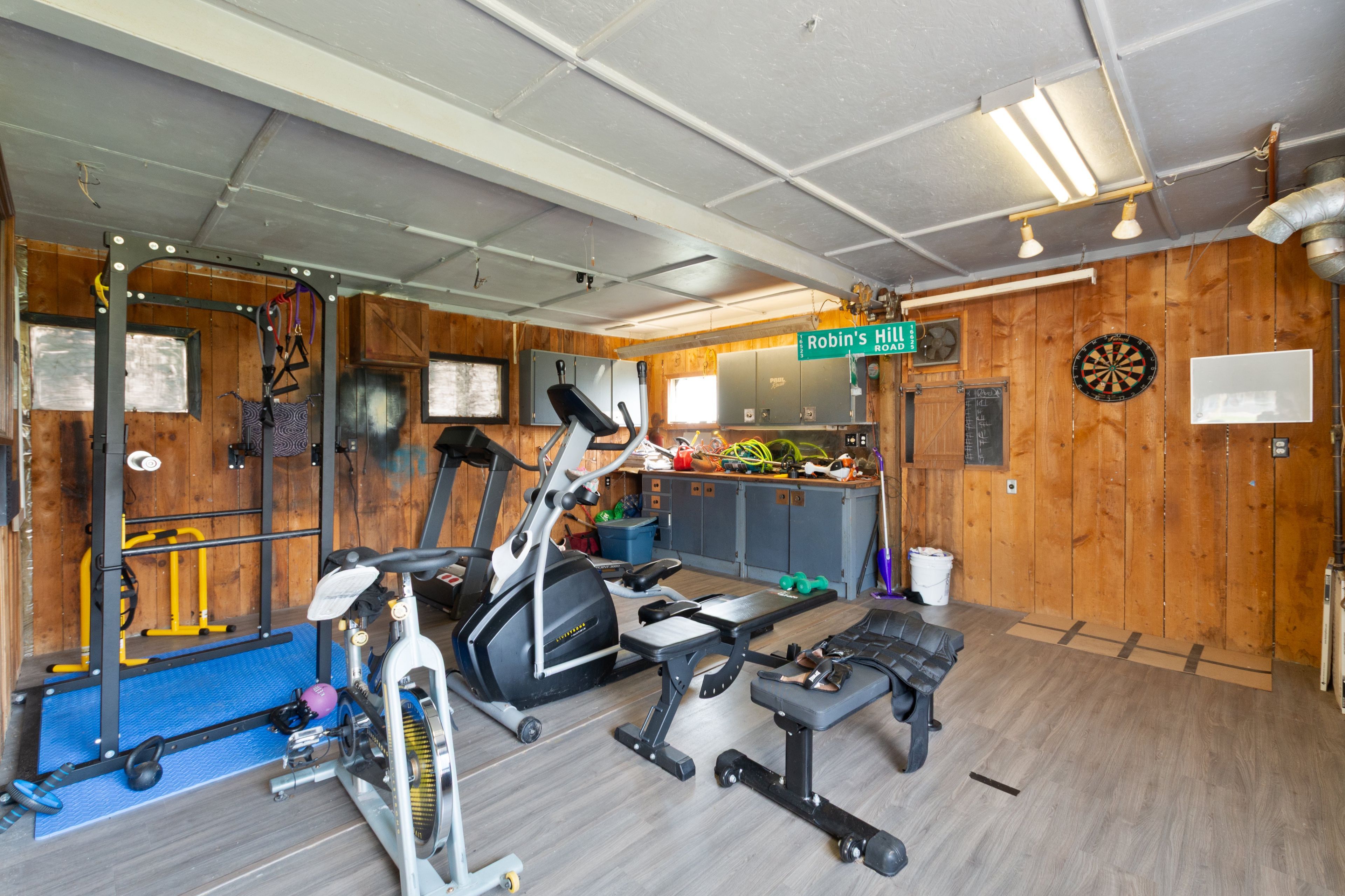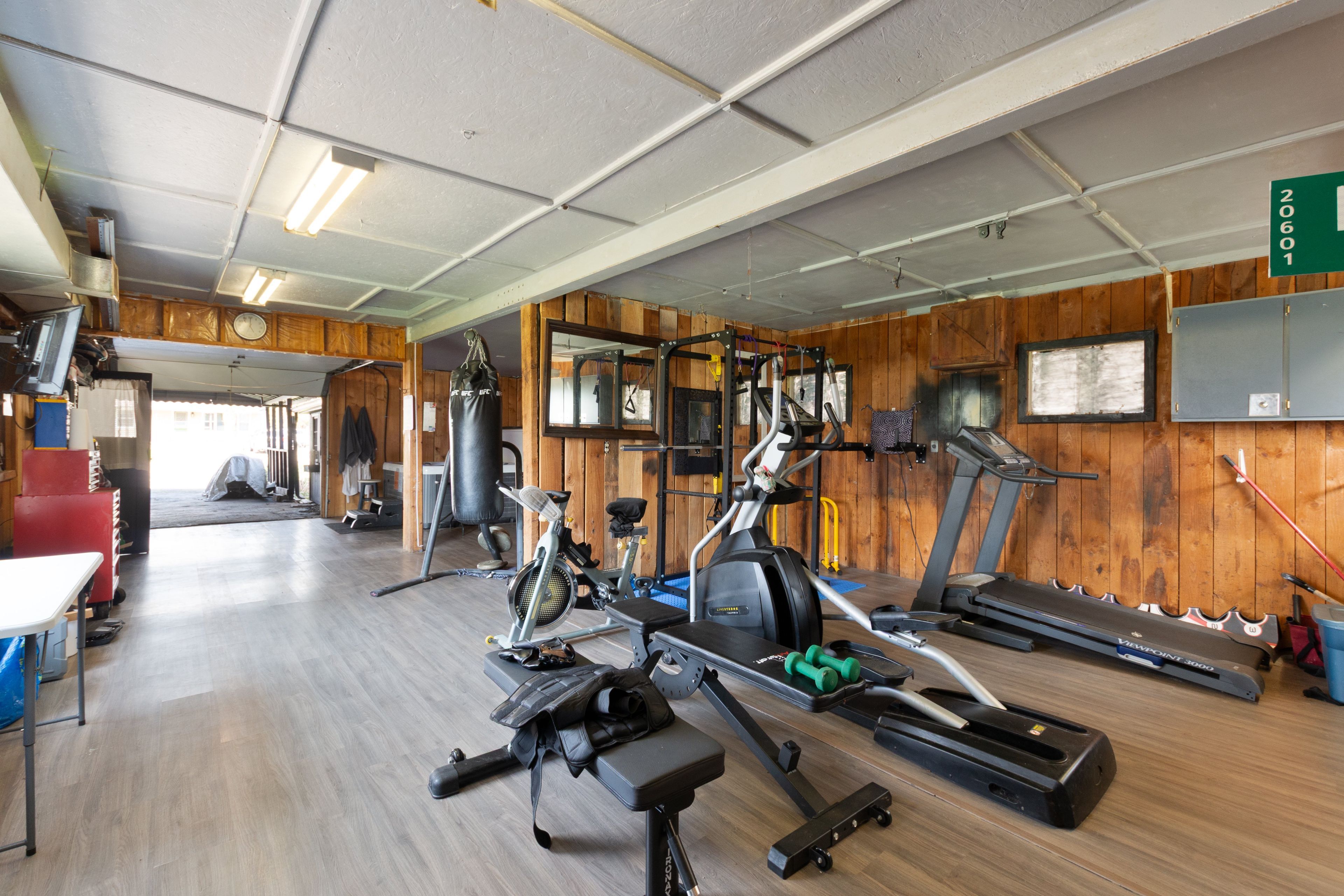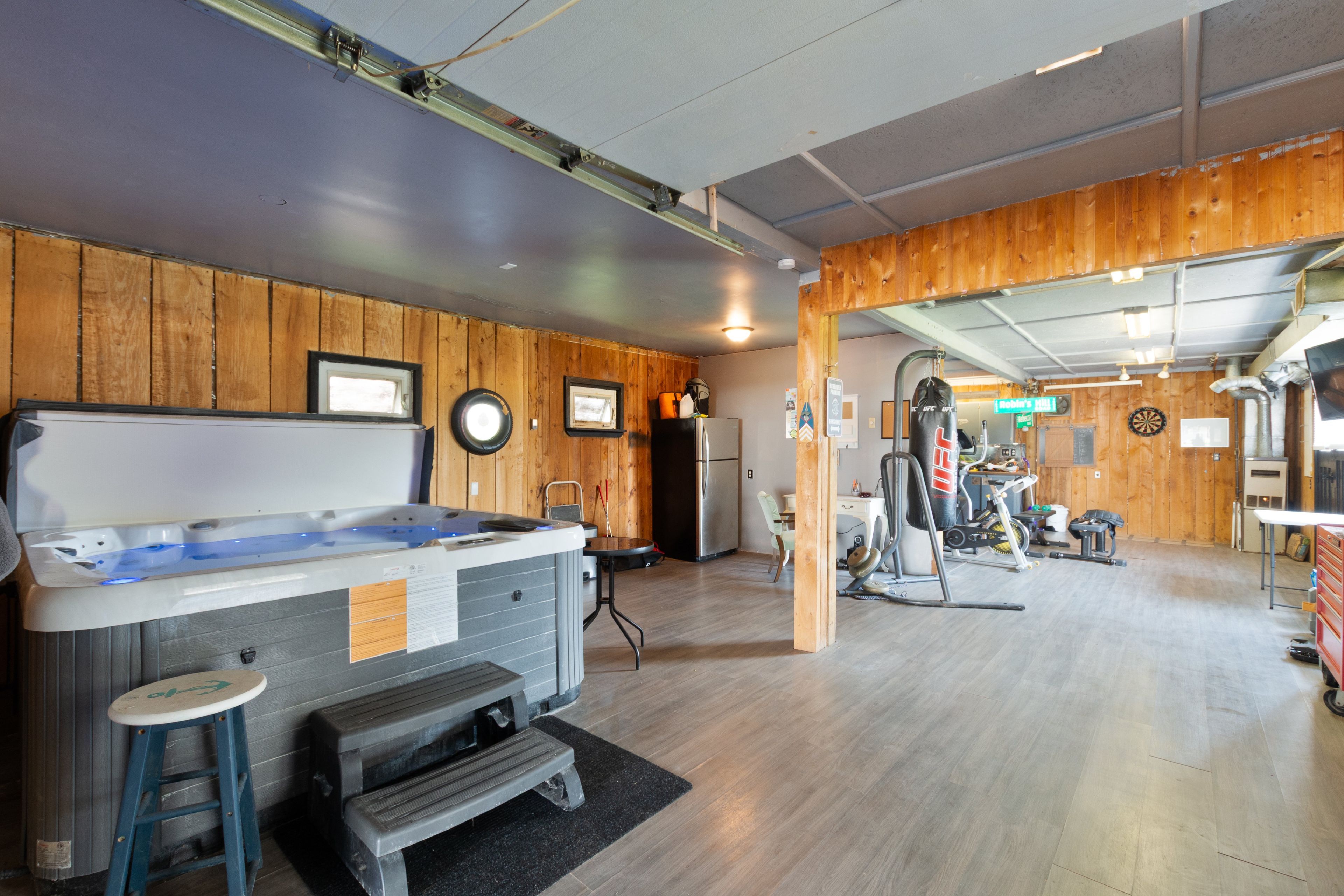 • Large attached heated workshop, garage, and hot tub room.
