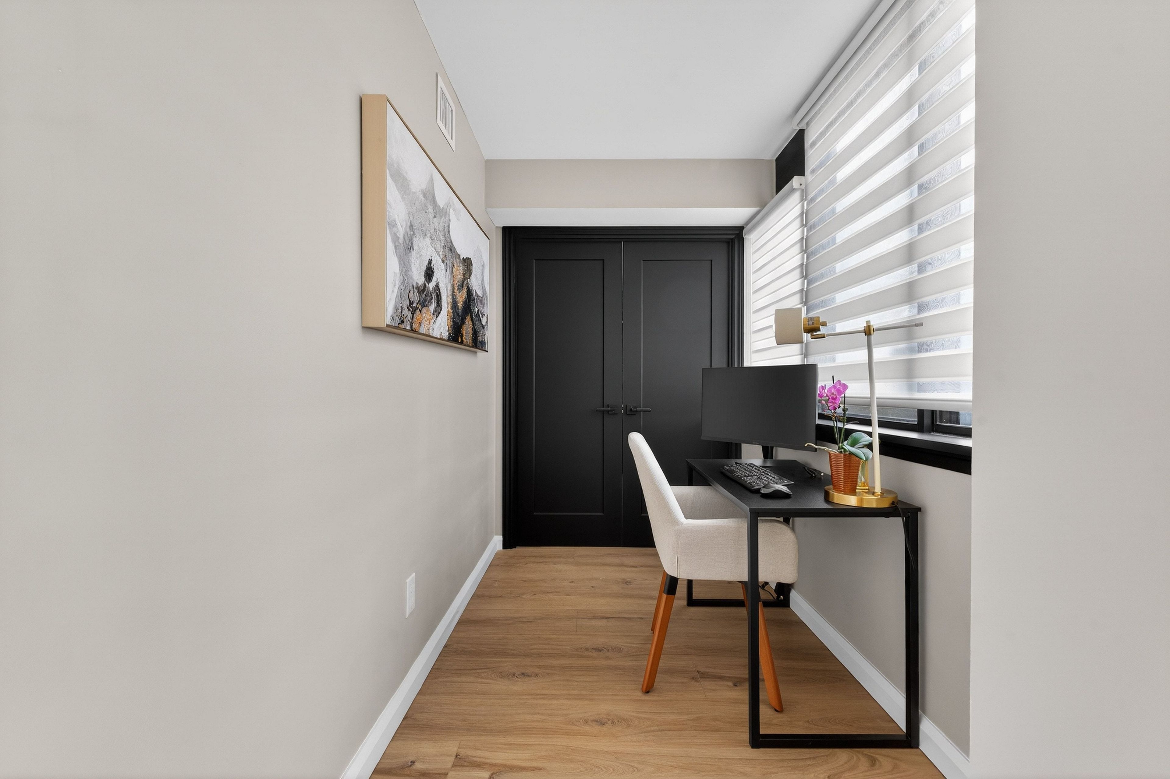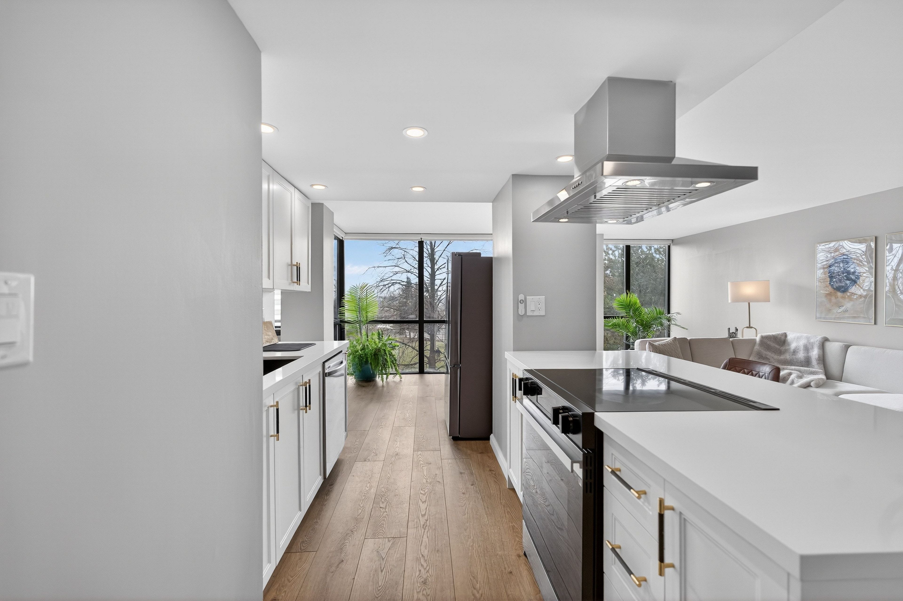 Welcome to luxury living in the heart of mississauga city centre. This beautifully renovated and exceptionally spacious condo offers a rare combination of modern design, premium upgrades, and unbeatable walkability just steps to square one, celebration square, restaurants, parks, transit, and everyday amenities. Thoughtfully redesigned throughout, featuring flat ceilings (no popcorn), wide modern baseboards, matte black window trims and sills, fresh neutral paint, and contemporary single-panel doors. The bright living area includes five motorized blinds (one remote control), upgraded lighting, and tv mount, creating a seamless blend of style and function. The designer kitchen is complete with quartz countertops and full backsplash, black granite sink, island range hood, soft-close cabinetry, built-in spice storage, under-sink waste system, usb island outlets, and brand-new full-size samsung appliances. Additional upgrades include black frosted sliding closet doors, custom bedroom built-ins, roller shades in the den, modern wall panel accents, led bathroom mirror, upgraded vanity, built-in shower niche, enhanced shower system, and new one-piece toilet. Comprehensive improvements provide peace of mind: plumbing and electrical updated to current standards, new outlets and switches throughout, upgraded hvac motor and insulation, digital thermostat, and recently cleaned ducts. A rare opportunity to own a turn-key, designer-finished residence in the heart of mississauga's vibrant downtown core.