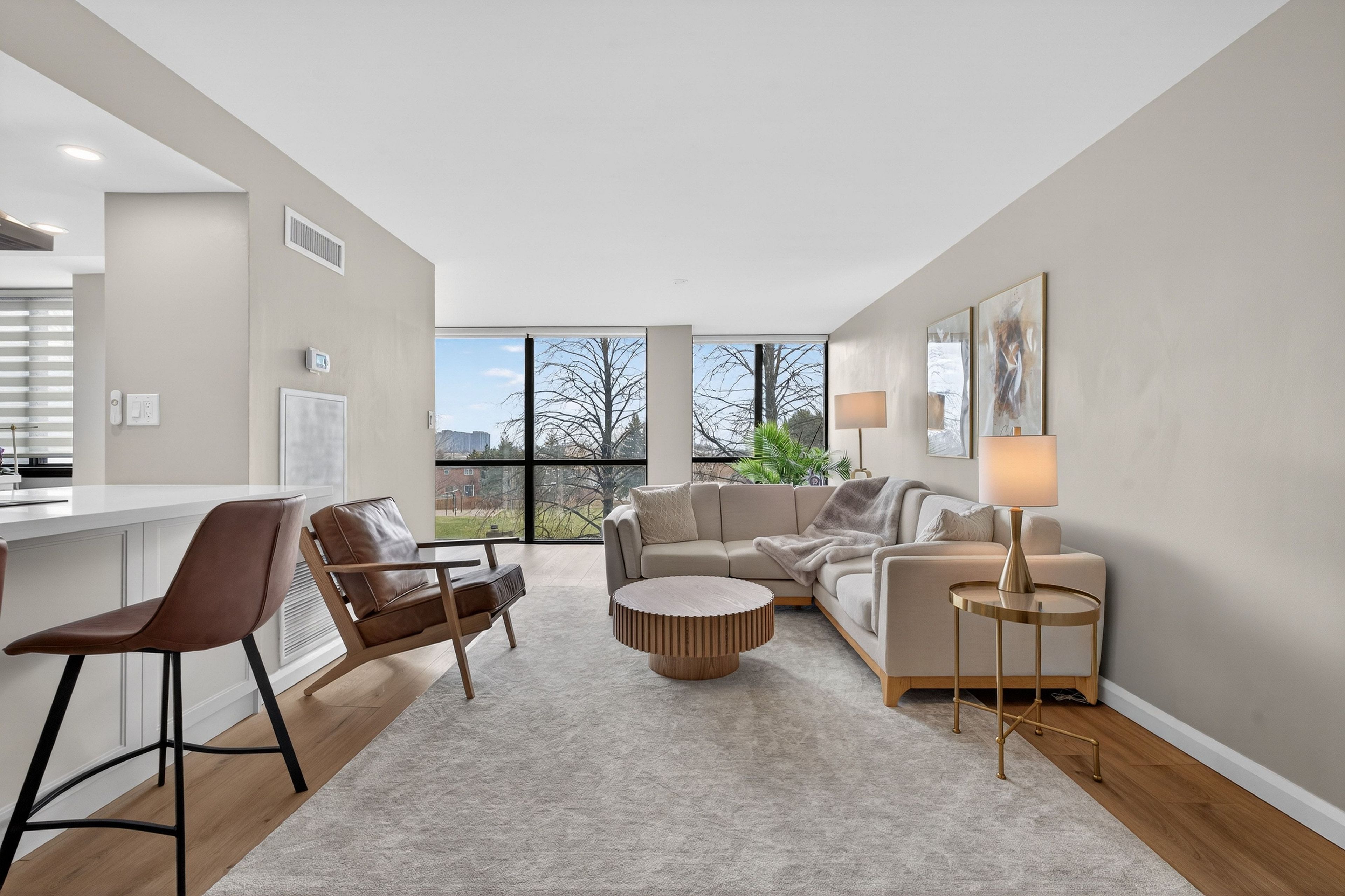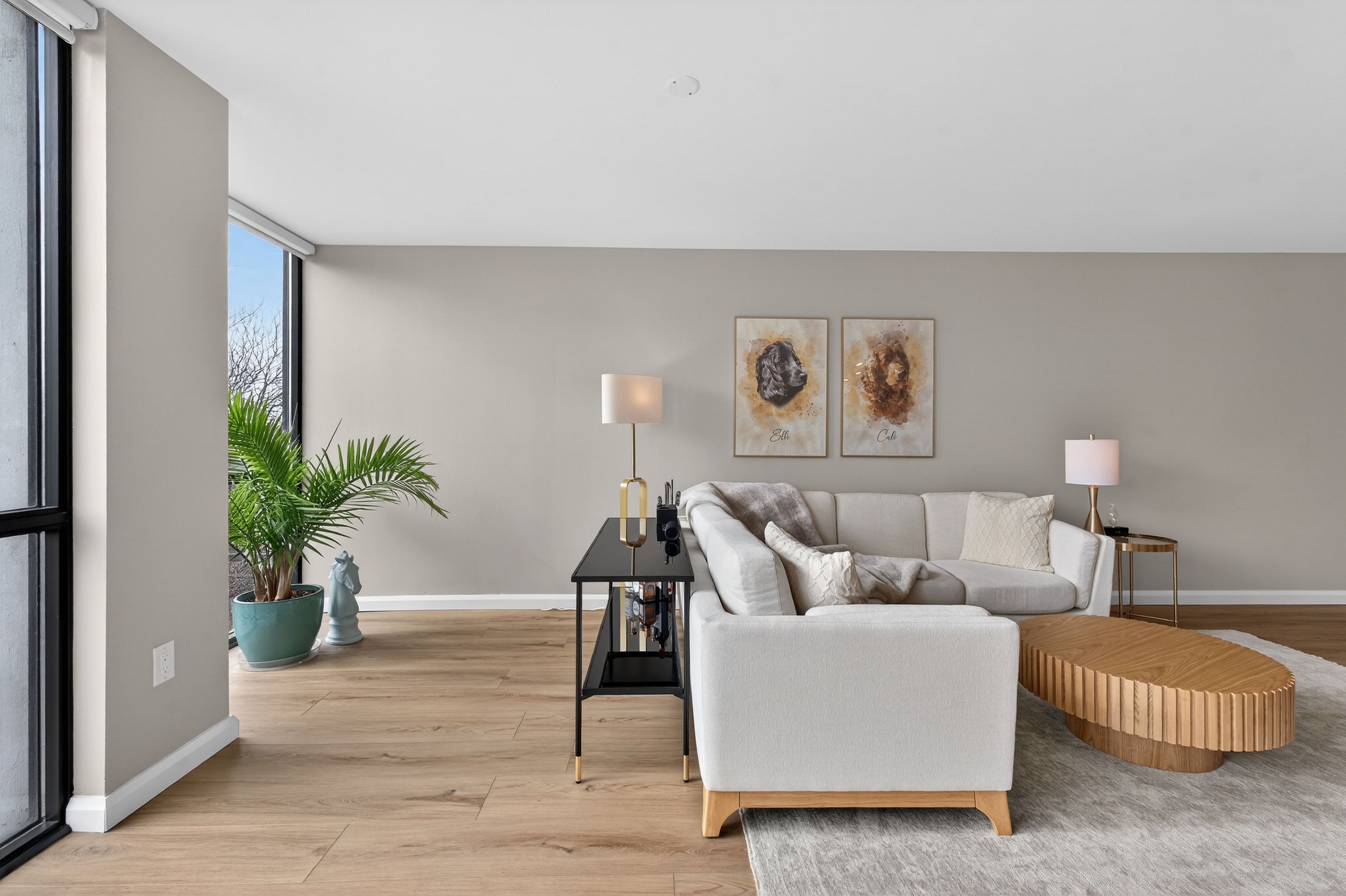 • Spacious living area featuring five motorized blinds and upgraded lighting.