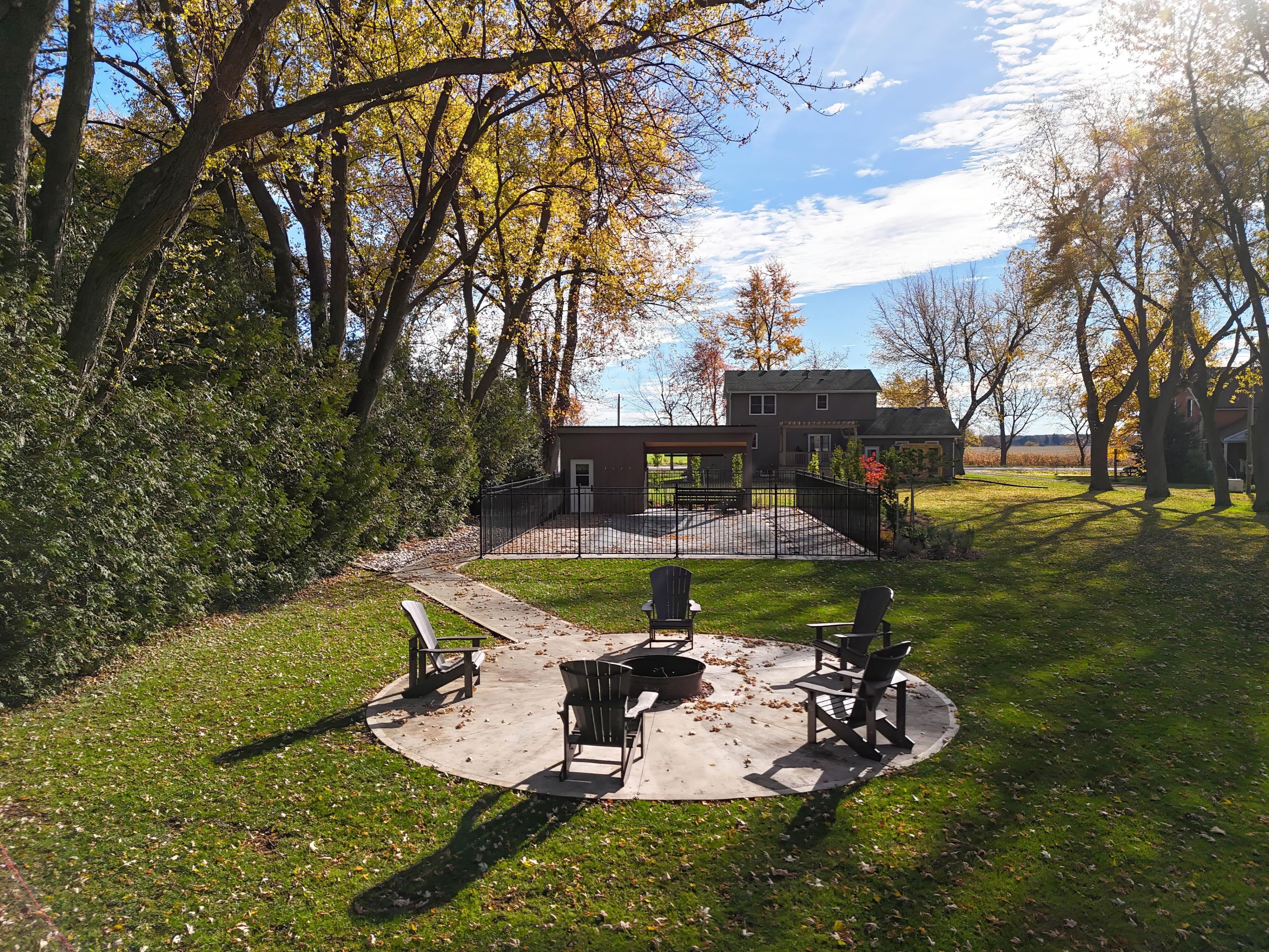 • Spacious yard with a large deck, pergola, and fire pit area.
