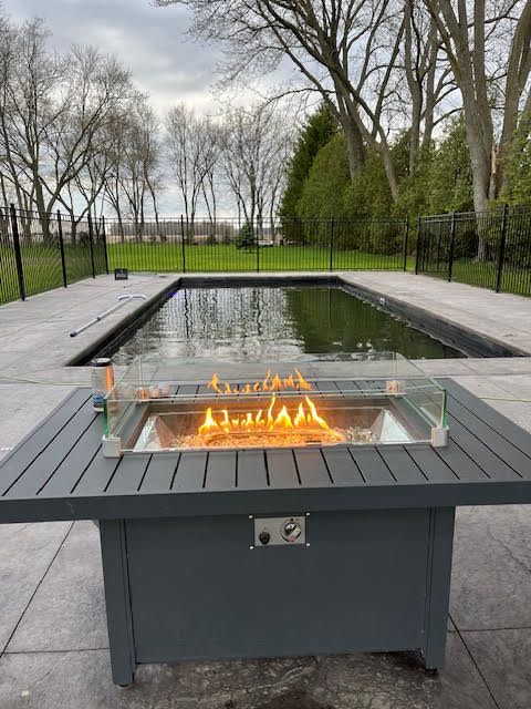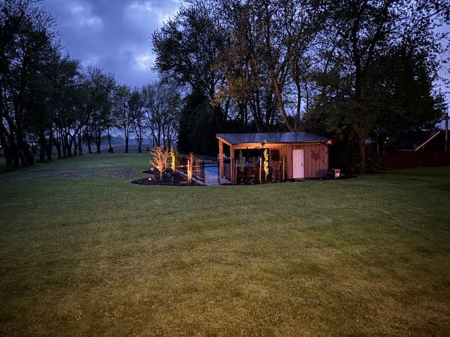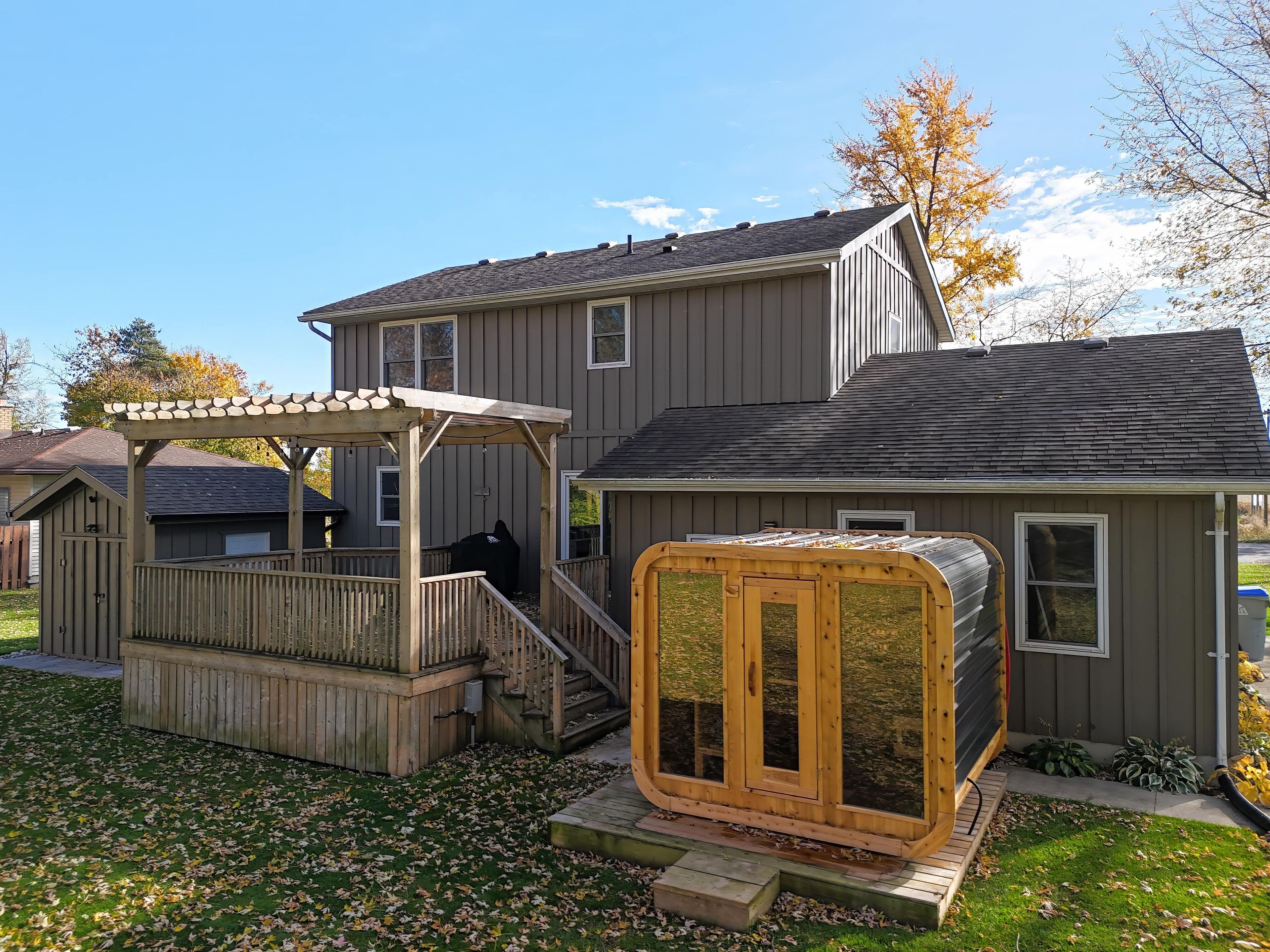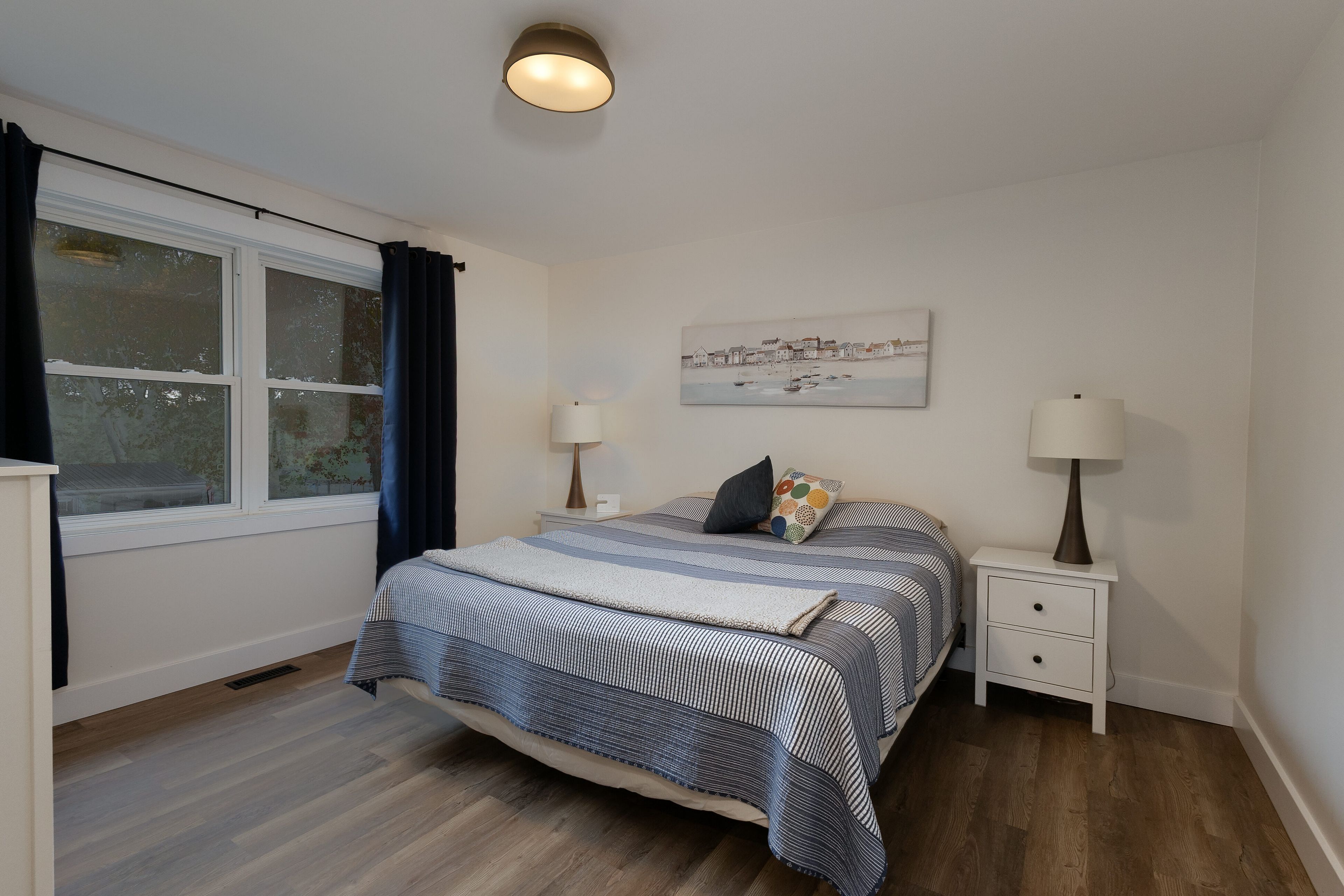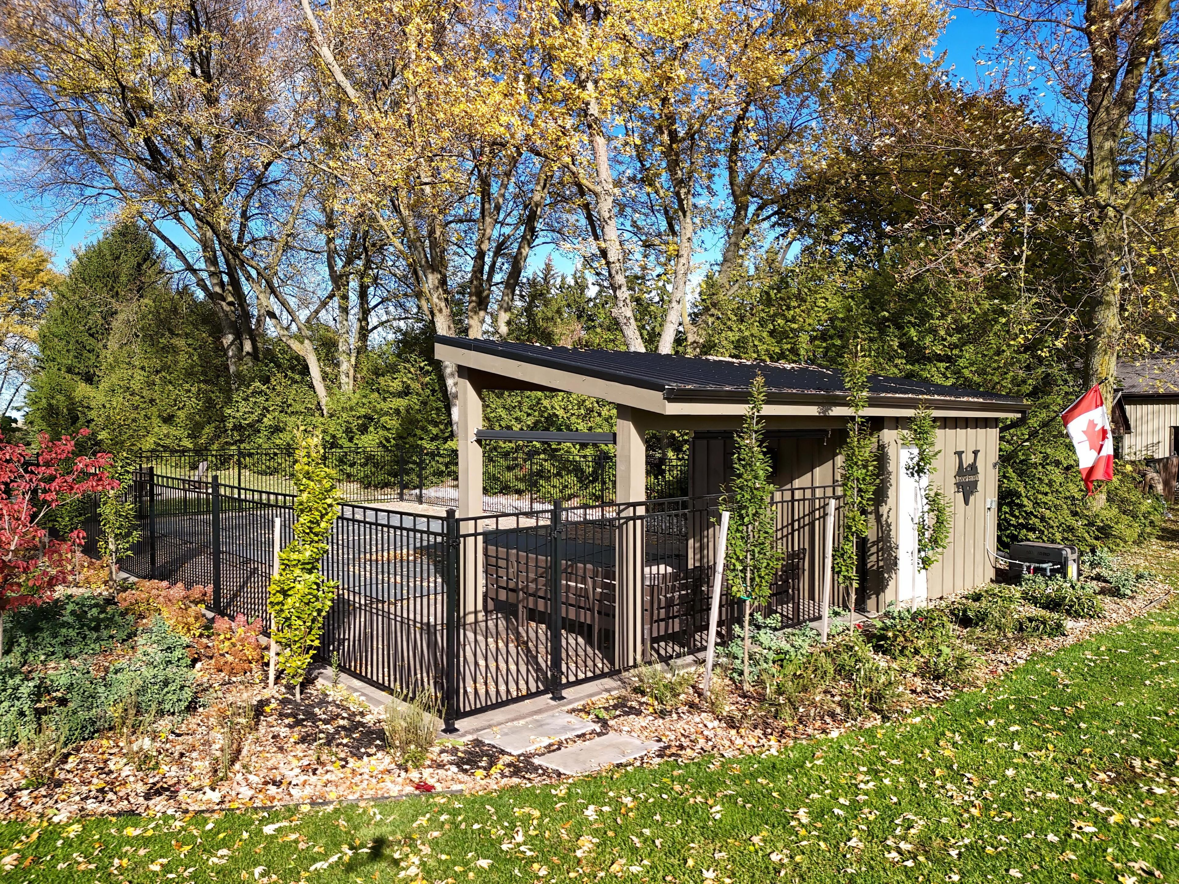 • Private yard with fire pit, mature trees, and landscaped gardens.