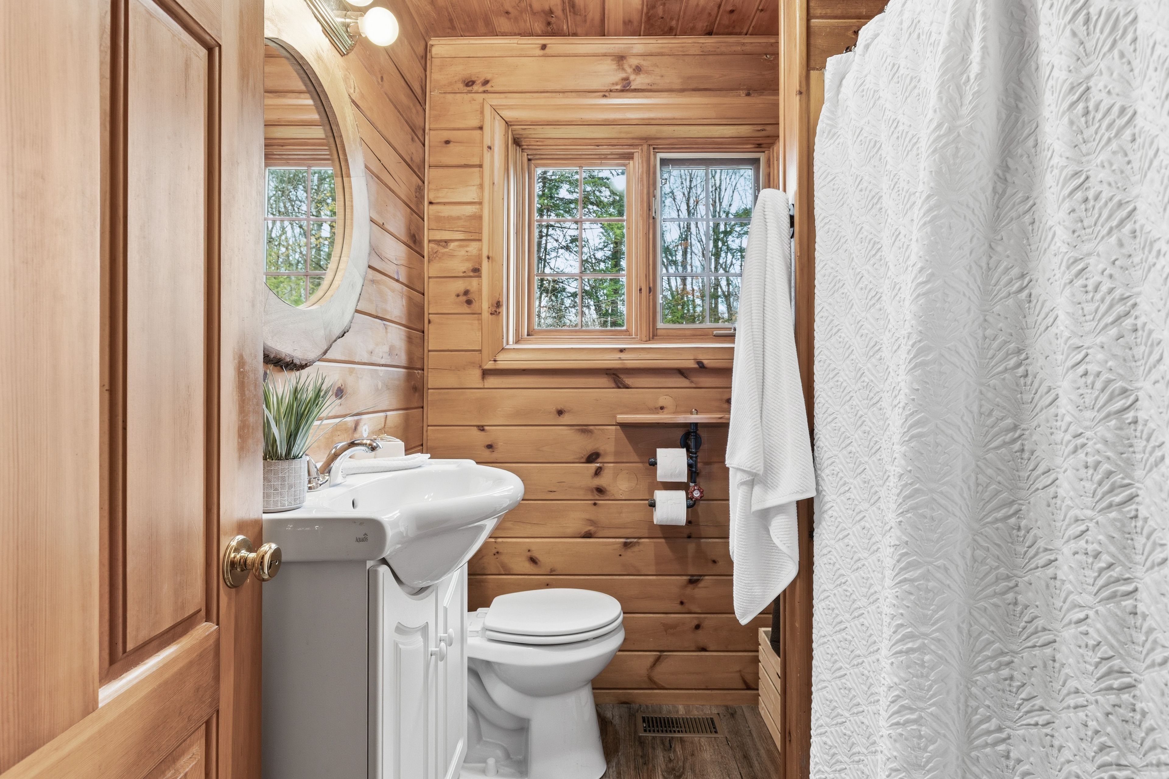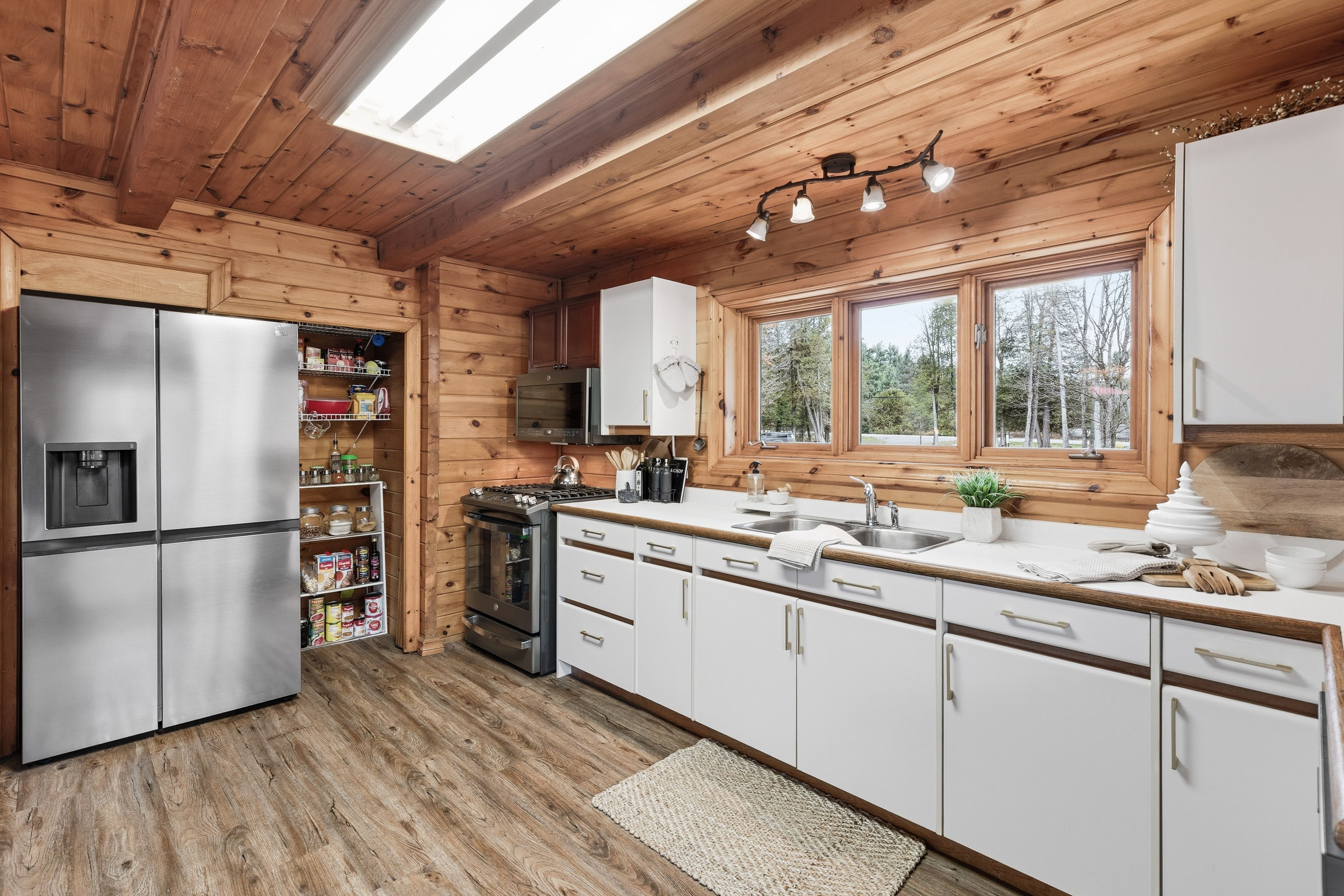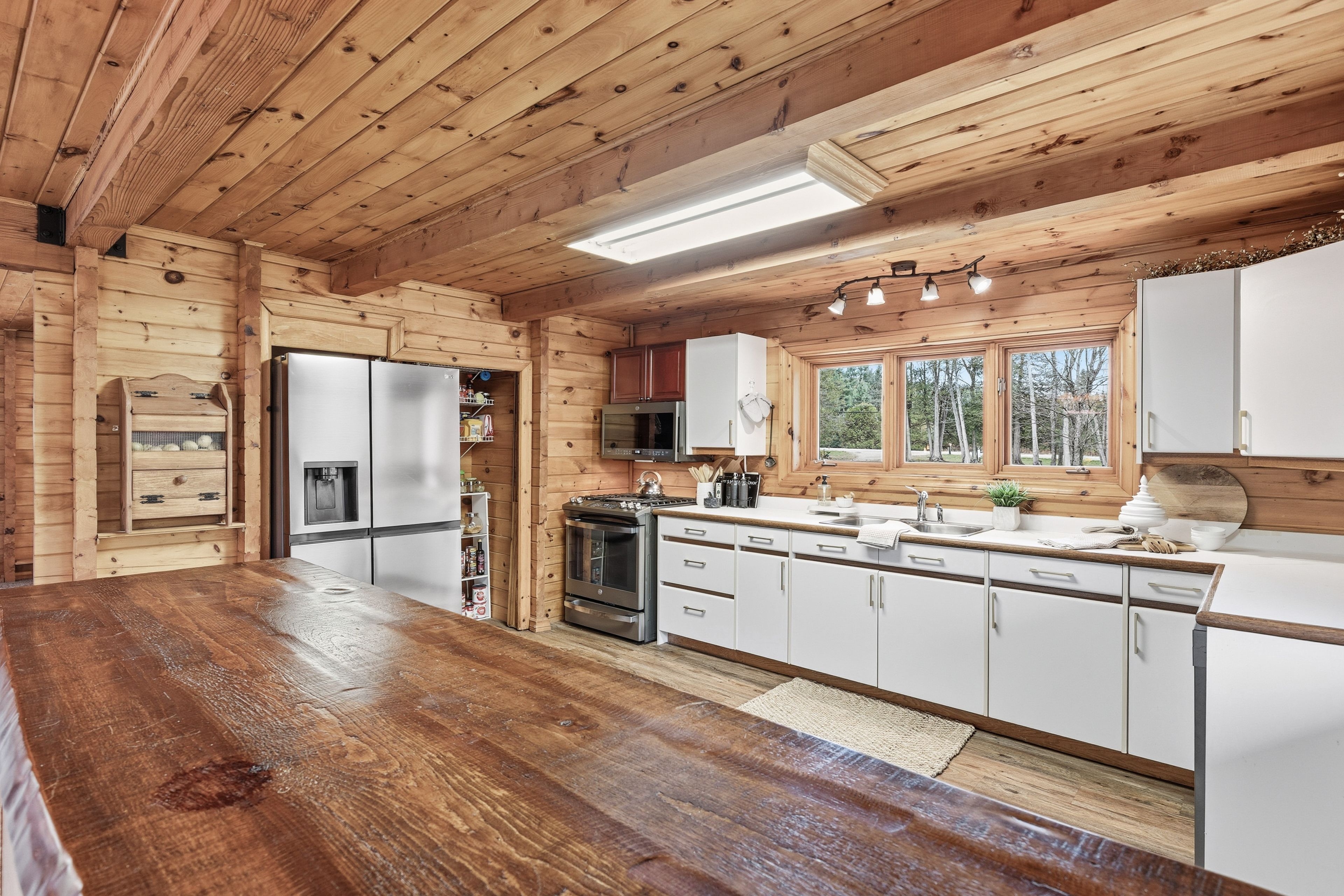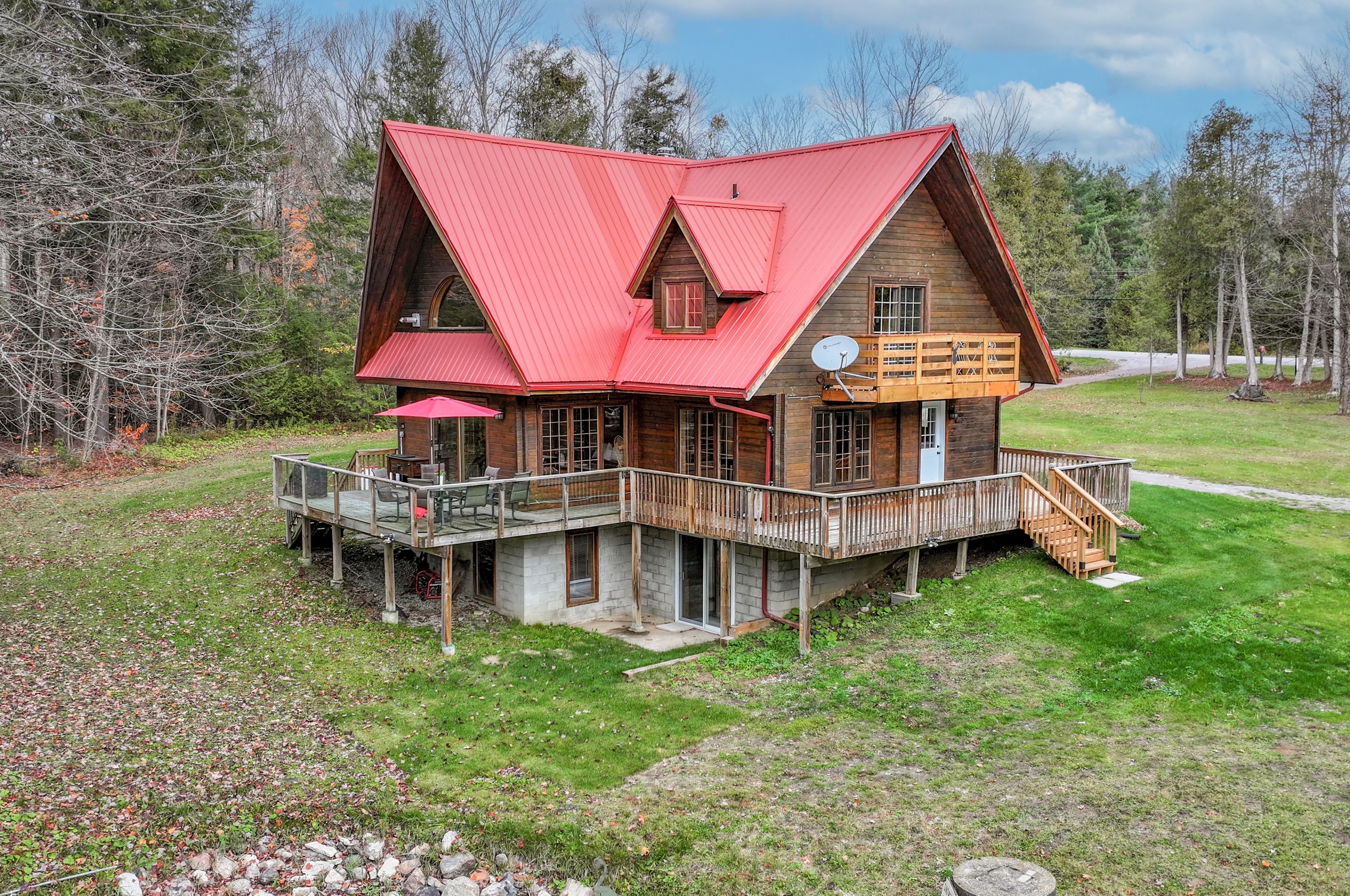 4+1 bedroom 3 bathroom log home with metal roof, offers the perfect balance of rustic charm and modern comfort. Walk in and be mesmerized by the grand foyer & living area, cathedral wood ceilings, cozy fireplace and abundant natural light from picturesque windows creating a warm and inviting atmosphere. The kitchen/dining combo is a cooking paradise, featuring newer appliances, propane stove, otr microwave, pantry and ideal for both daily living and entertaining. Gorgeous spiral natural wood staircase leading you to the upper level of the home with additional bedrooms, full bathroom and sitting area loft. Primary suite with walk out juliet deck. Lower level with full recreational room, laundry area, sauna, work out area, bathroom and walk out to yard. Step outside to the expansive wraparound deck with breathtaking views of the pond and surrounding 1. 89 acres of forest. Bonus three car detached garage with hydro. Fully furnished one year lease.