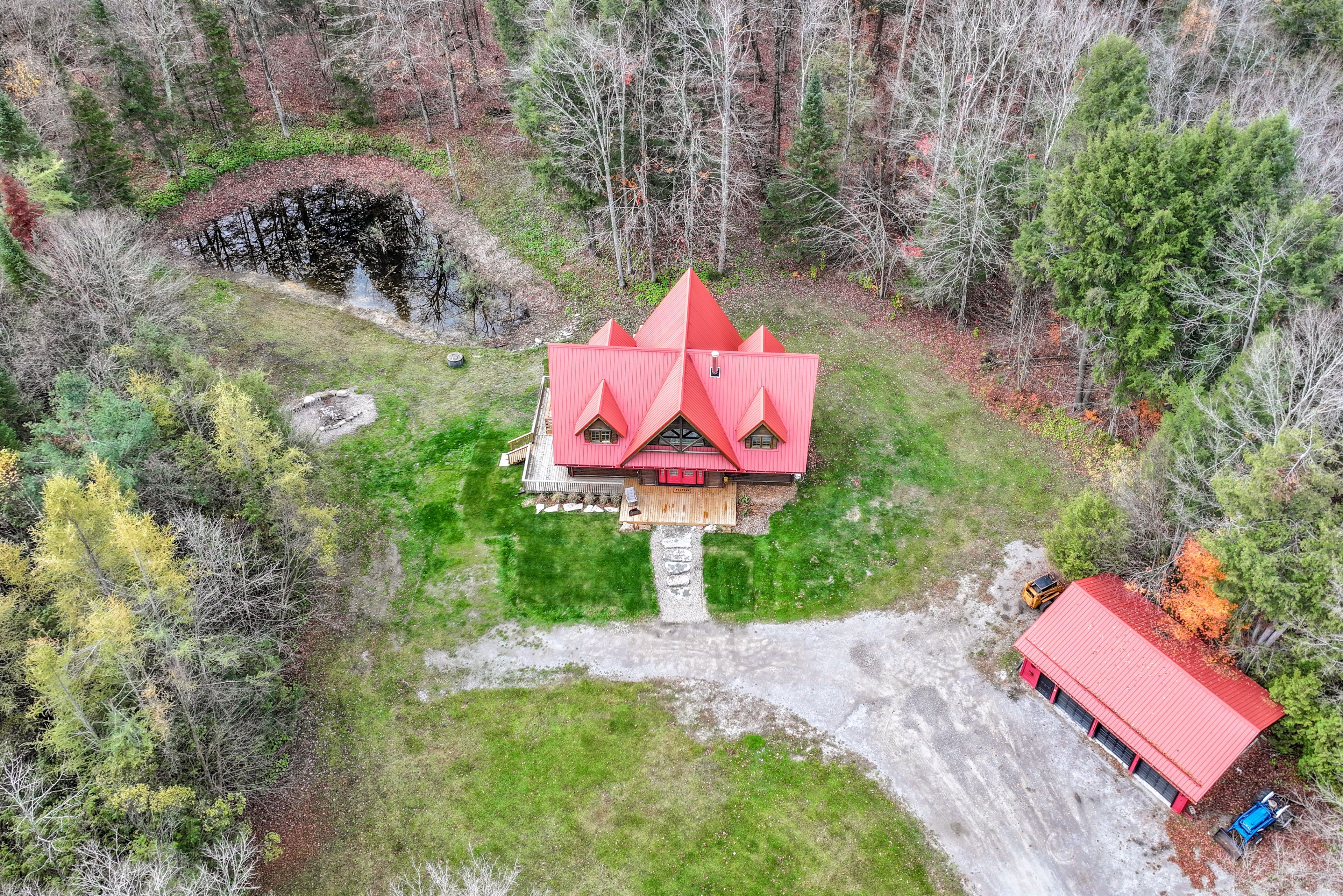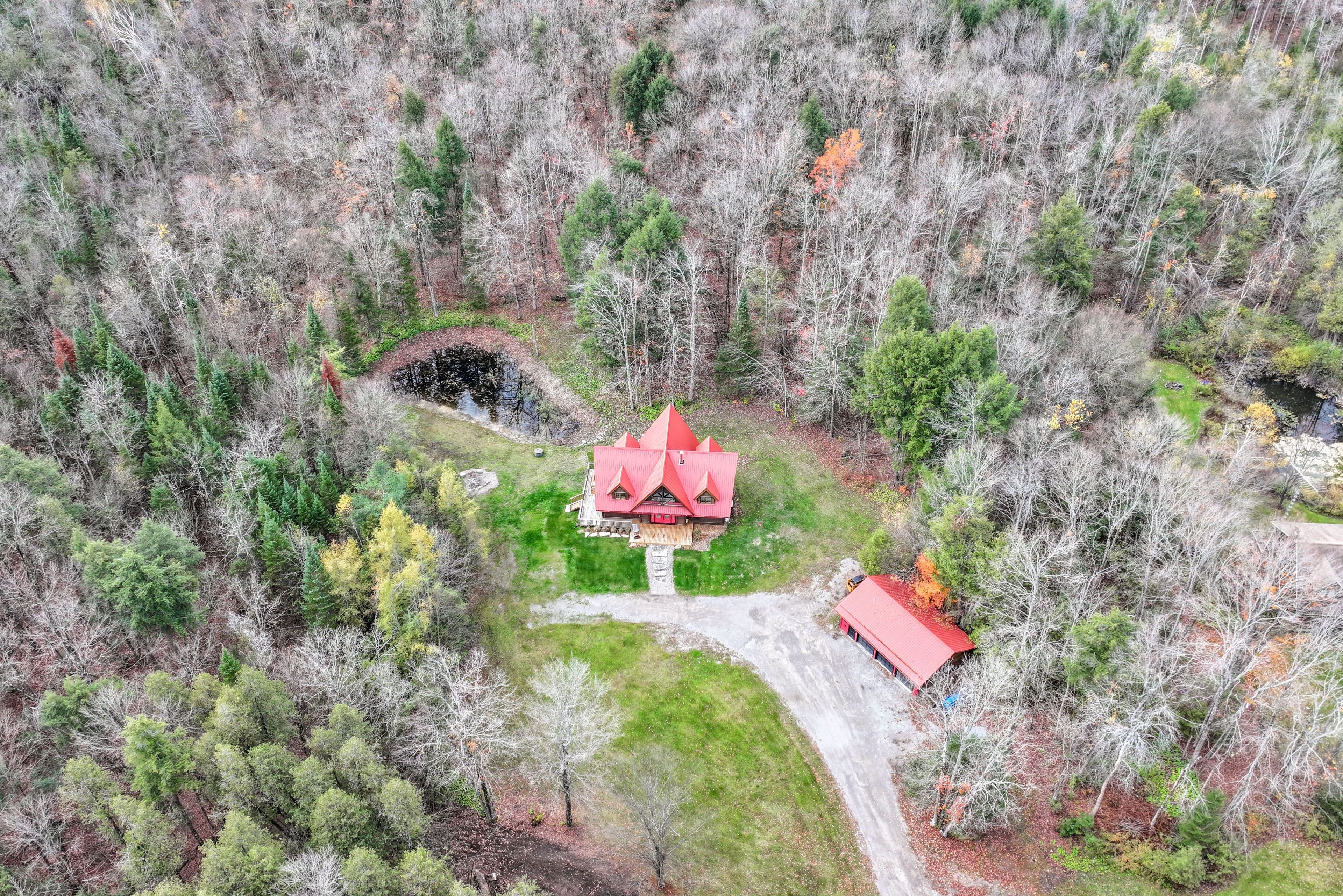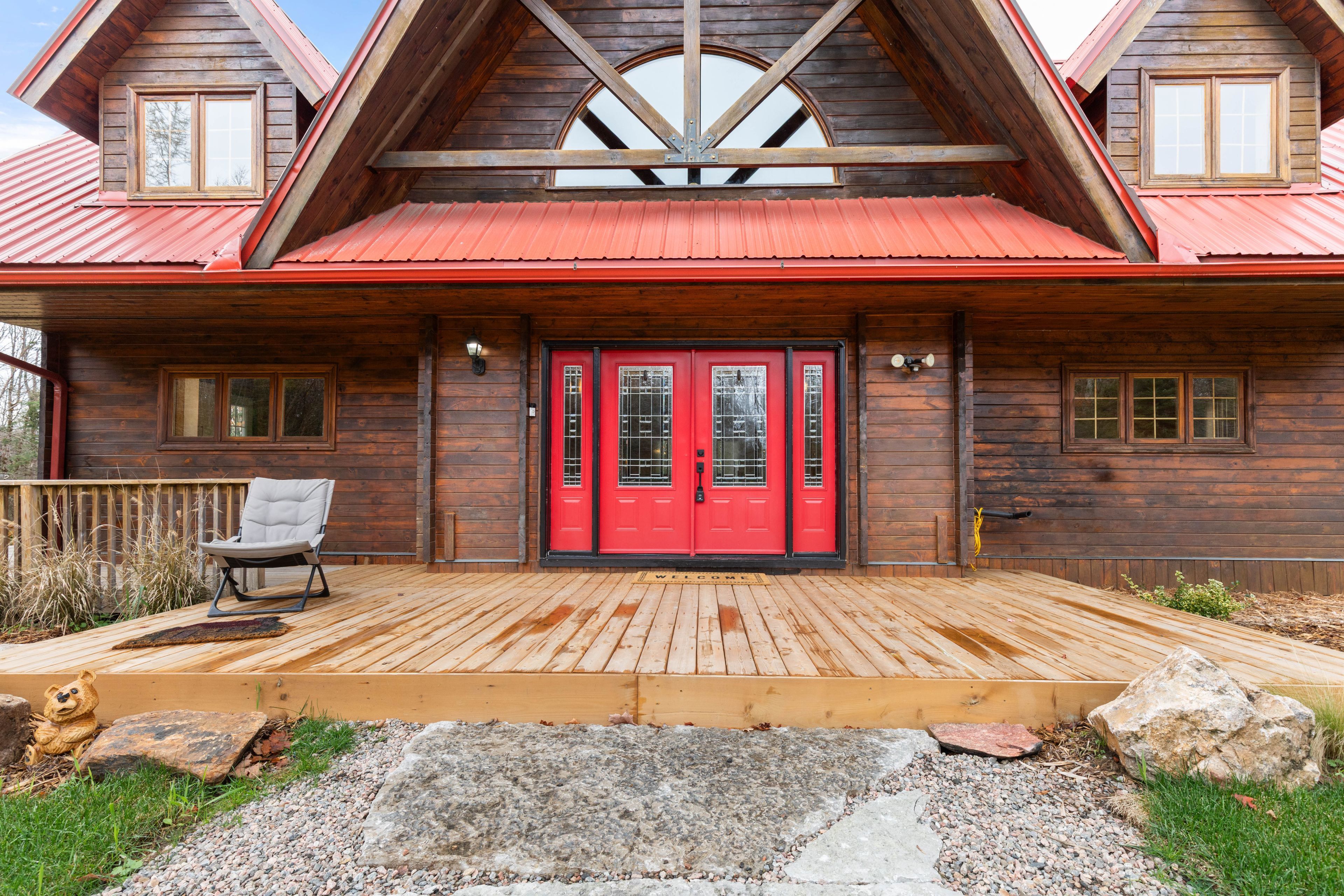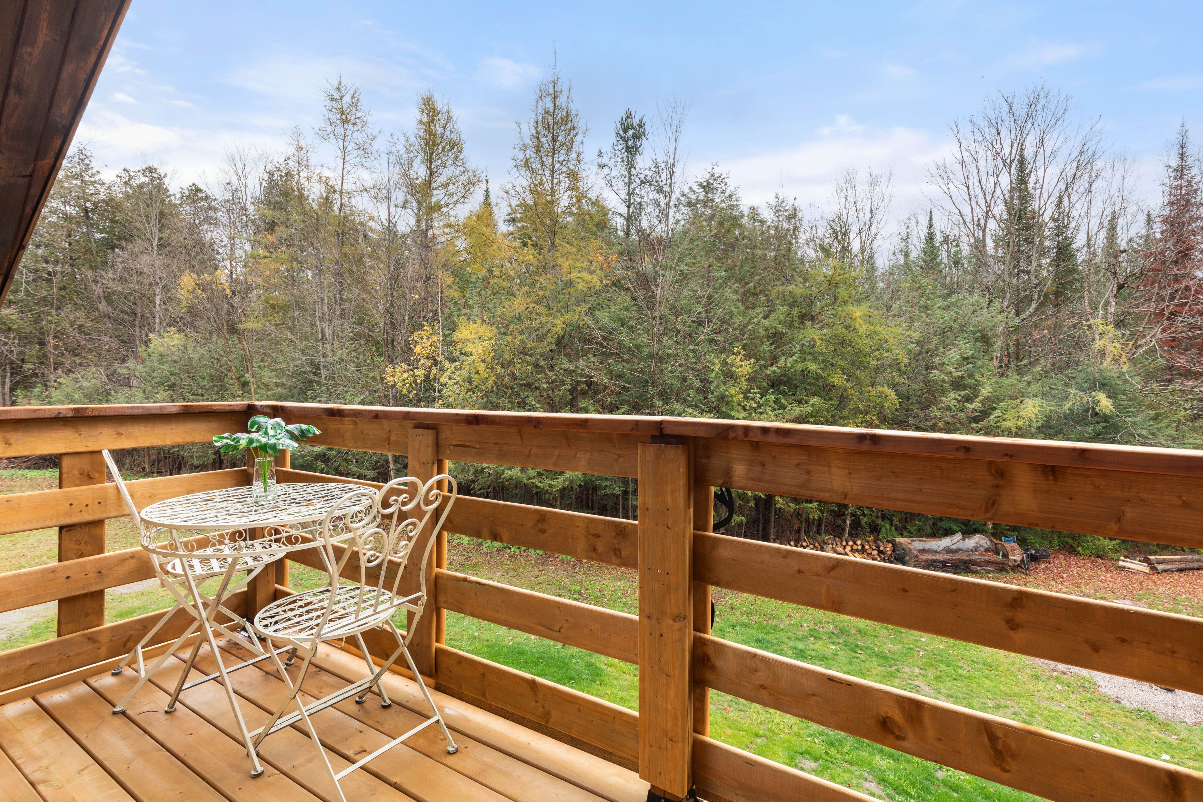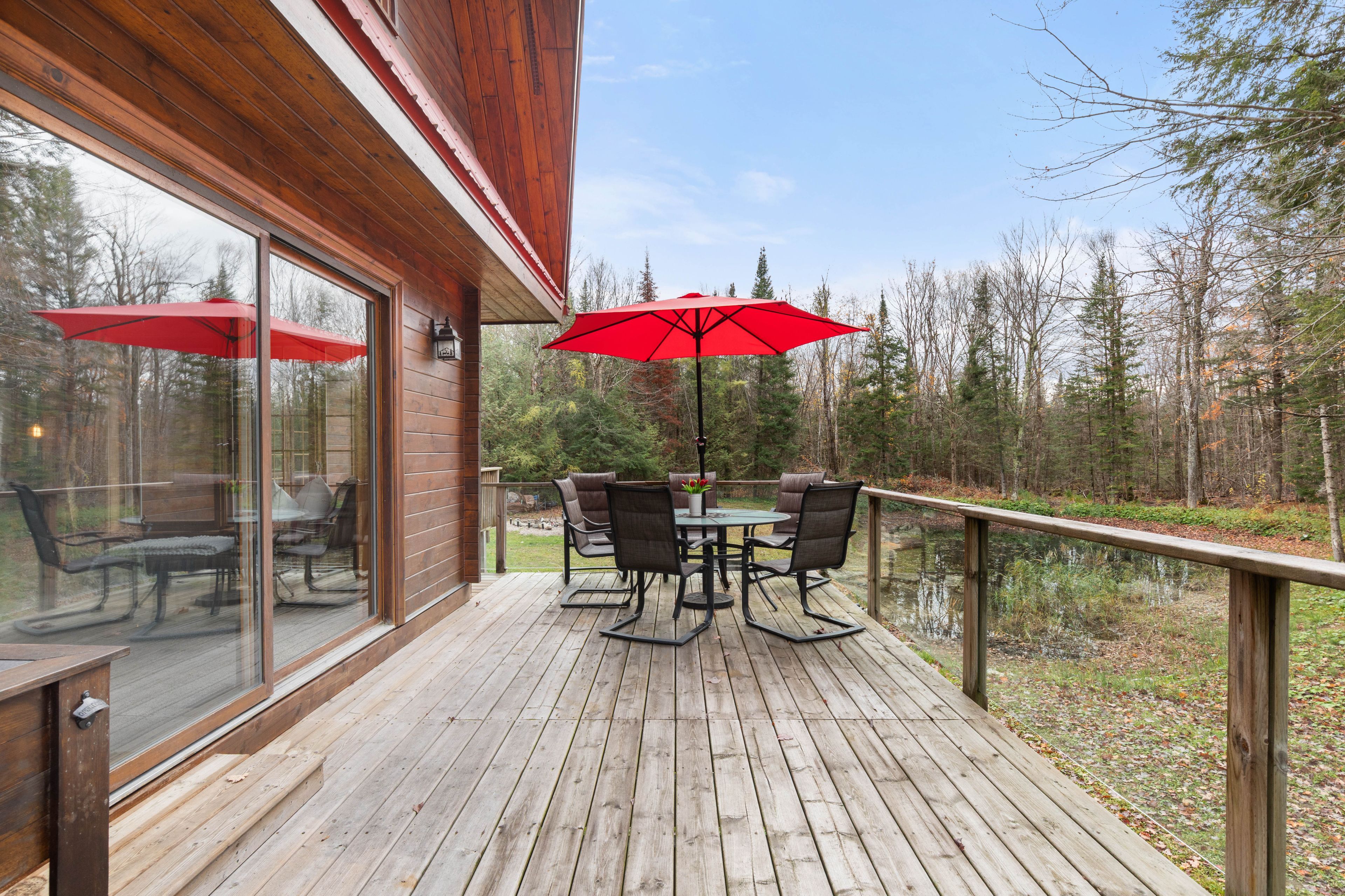 • Expansive wraparound deck with stunning views of the pond and forest.