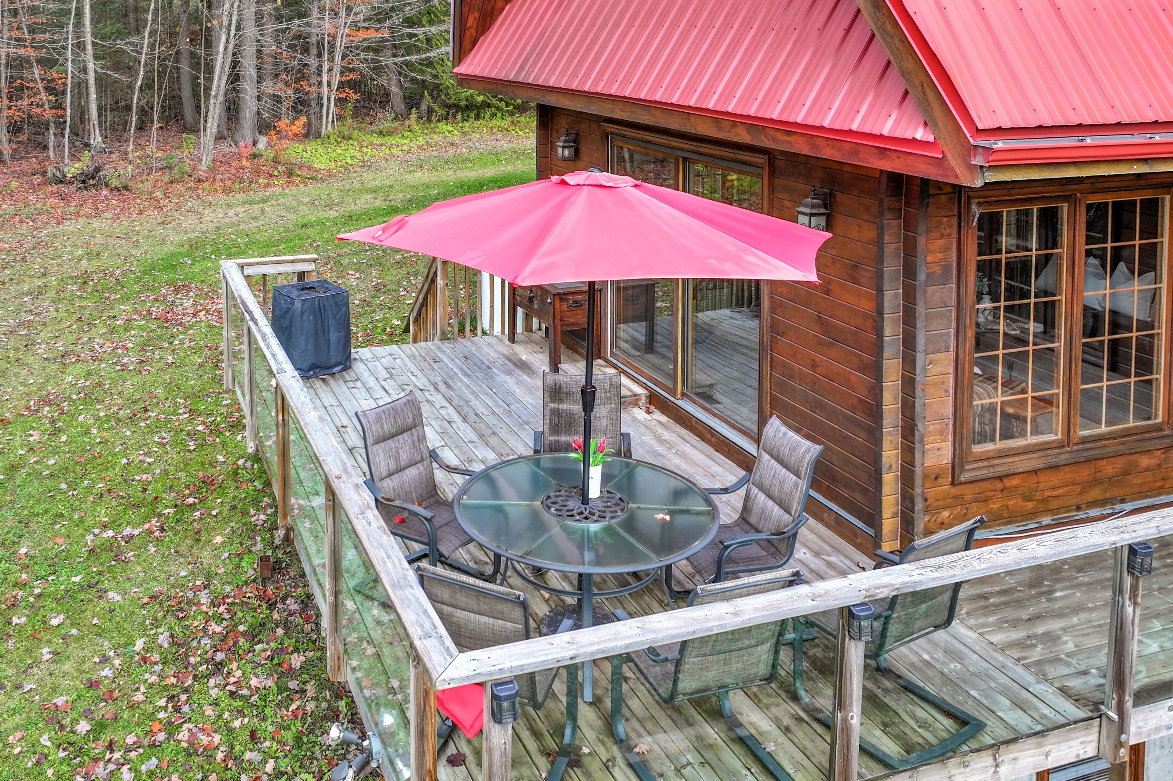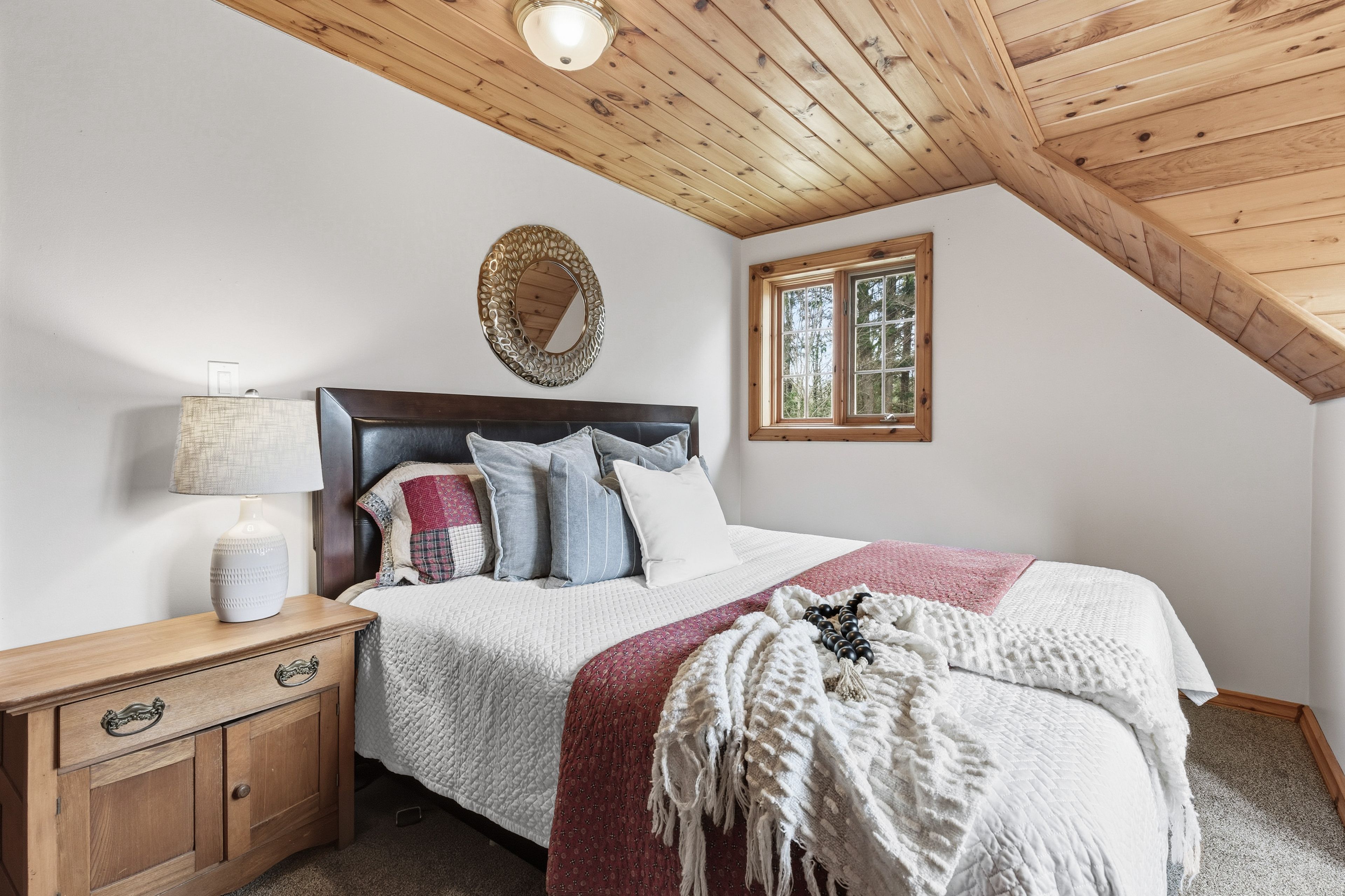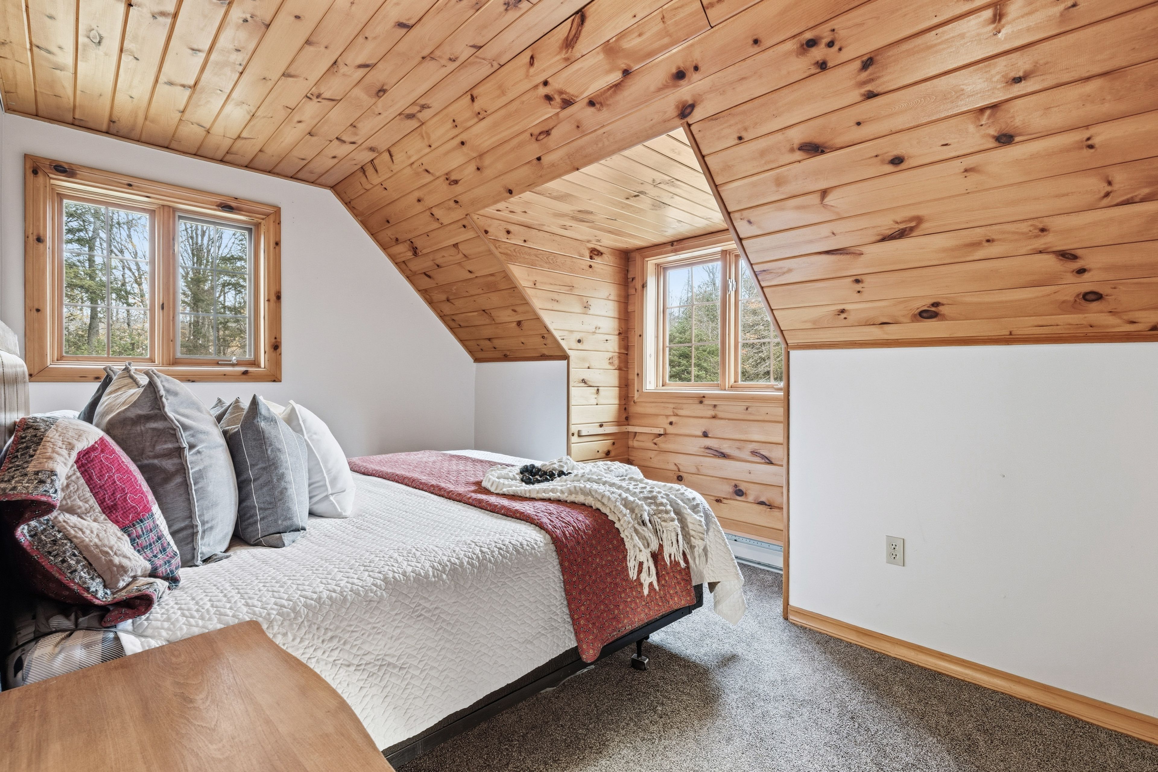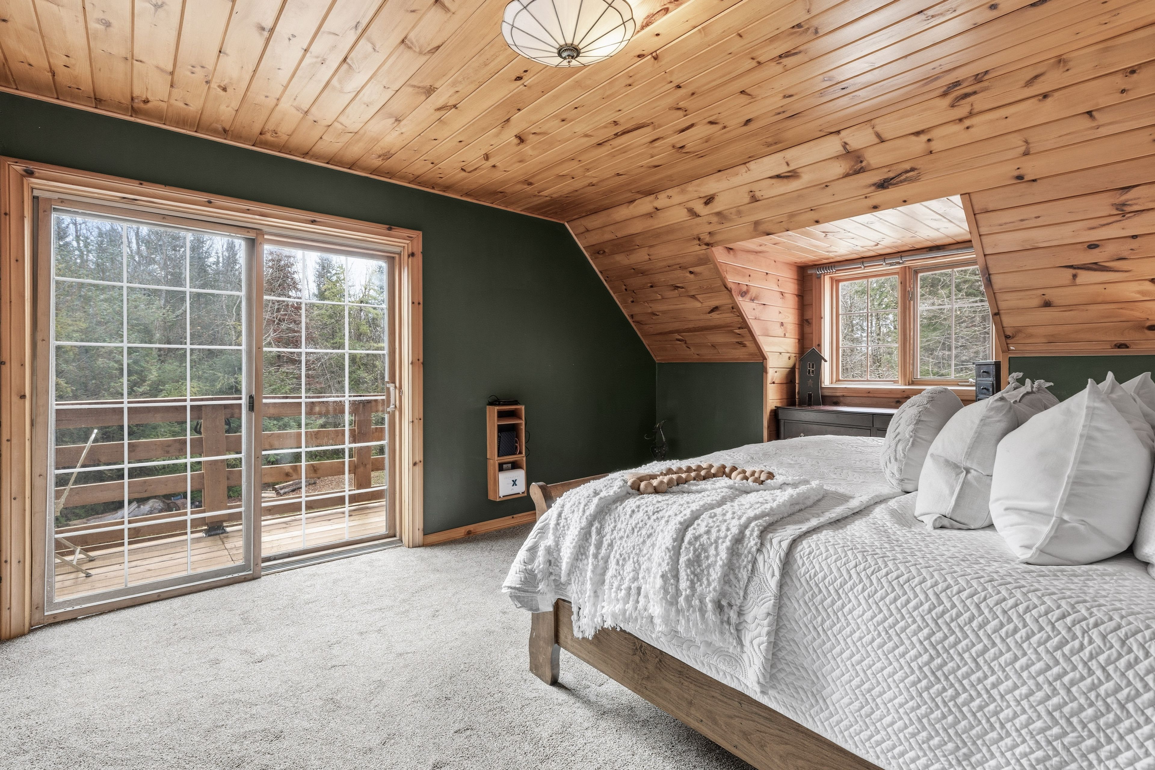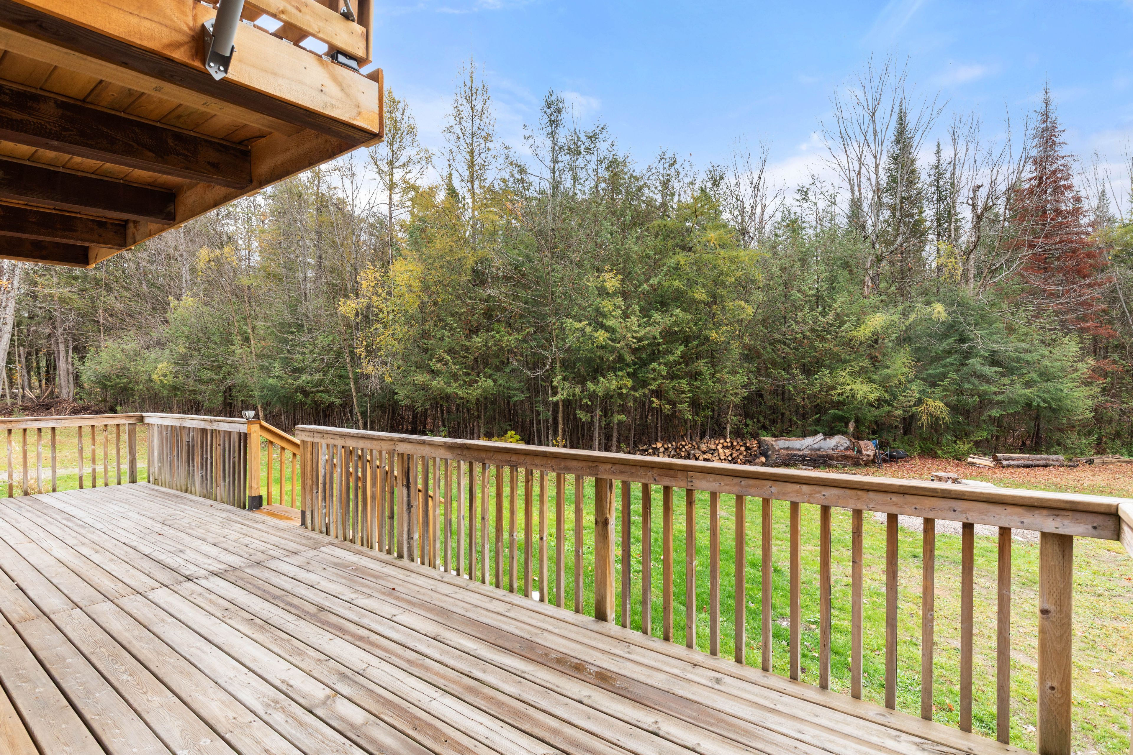 • Expansive wraparound deck with stunning views of the pond and forest.