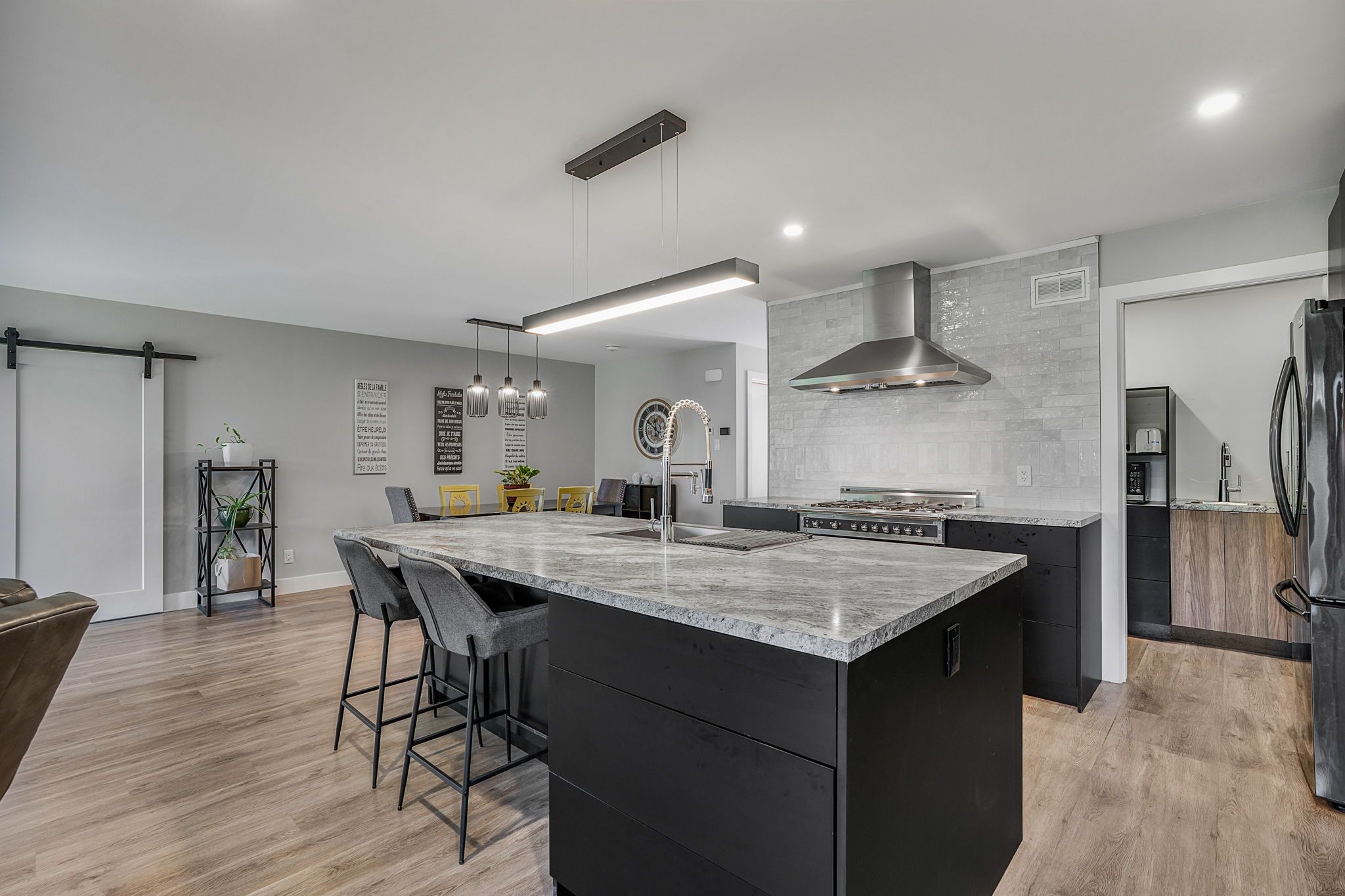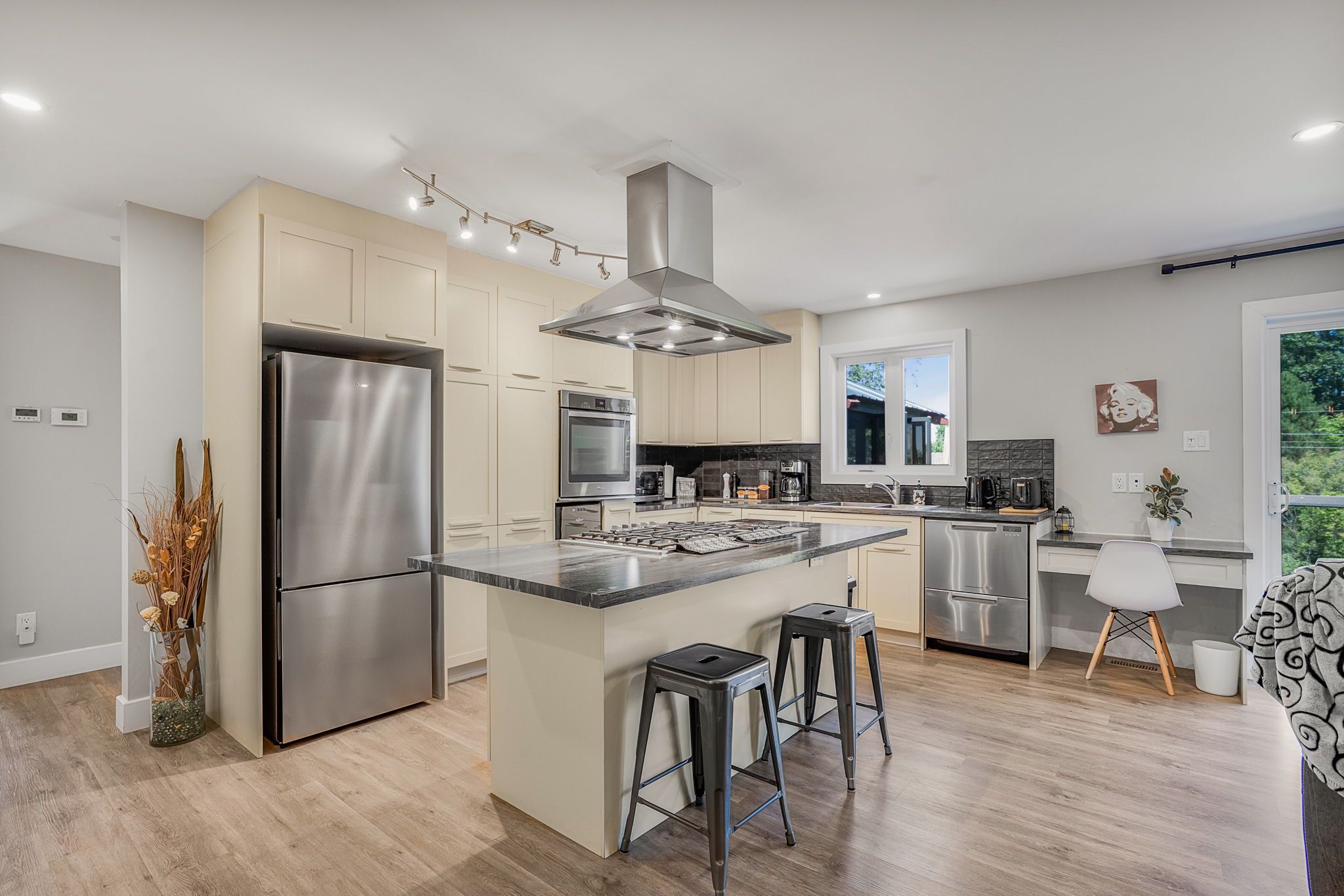 • Main unit features modern design, gourmet kitchen, and cozy wood-burning fireplace.
