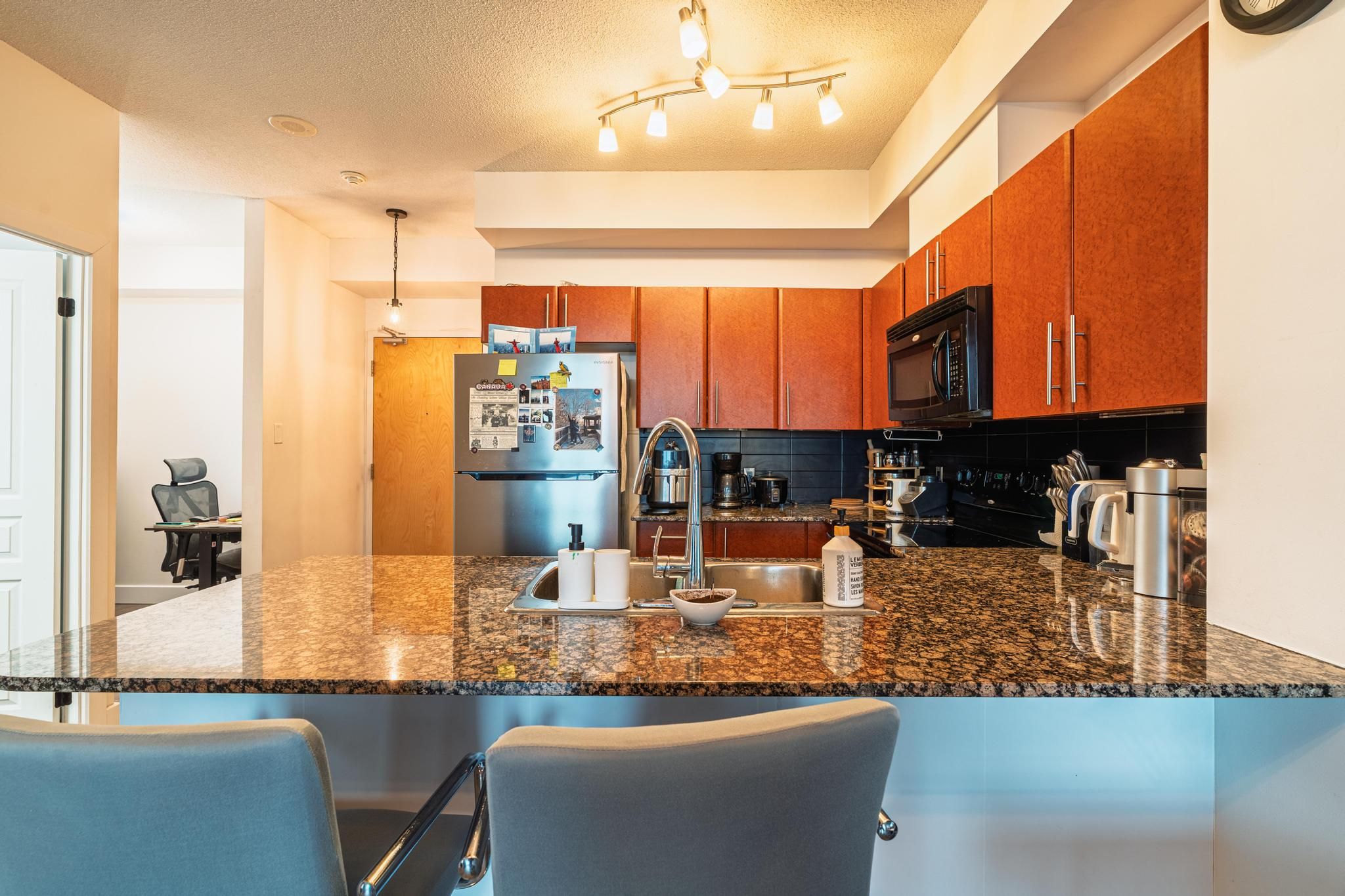 • Modern kitchen with granite countertops and stainless steel appliances.