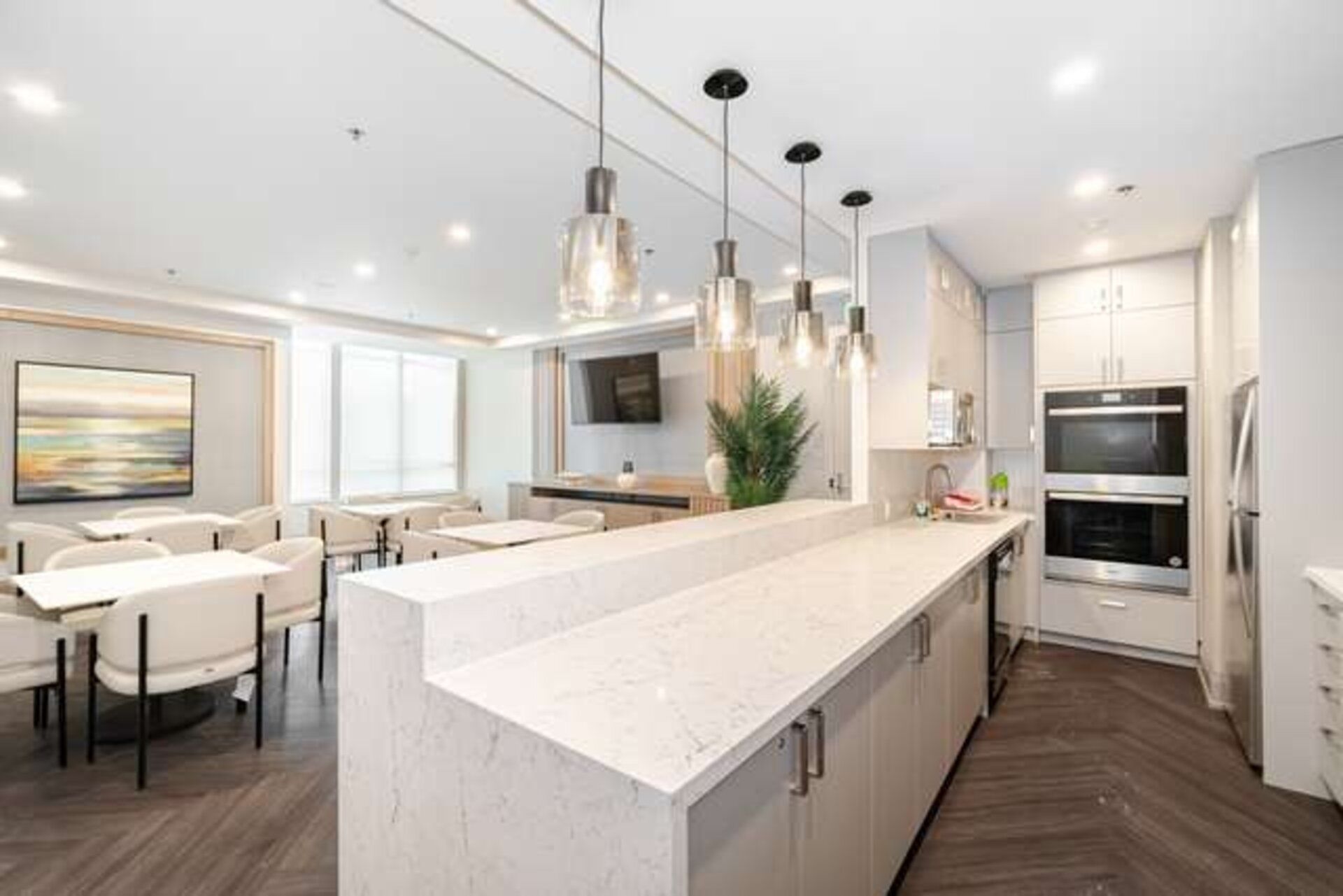 • Updated modern kitchen with stainless steel appliances and dining space.