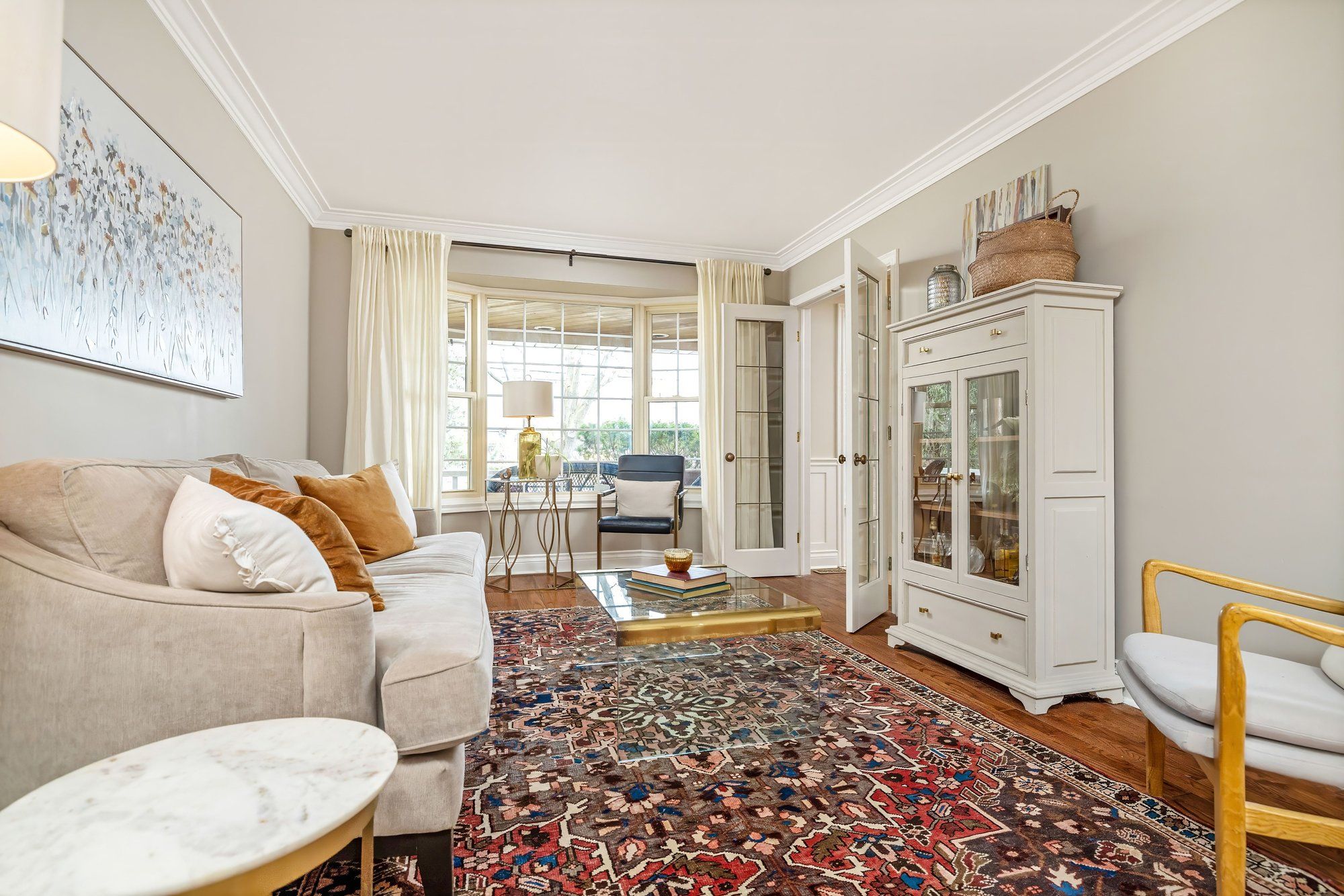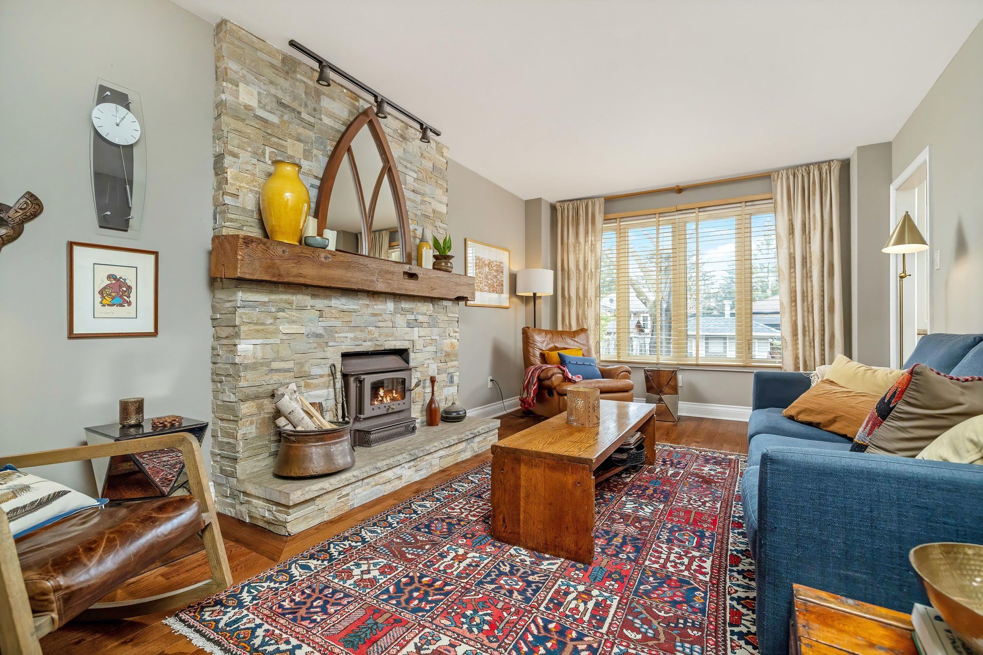 • Cozy family room with a wood-burning fireplace and built-in cabinetry.