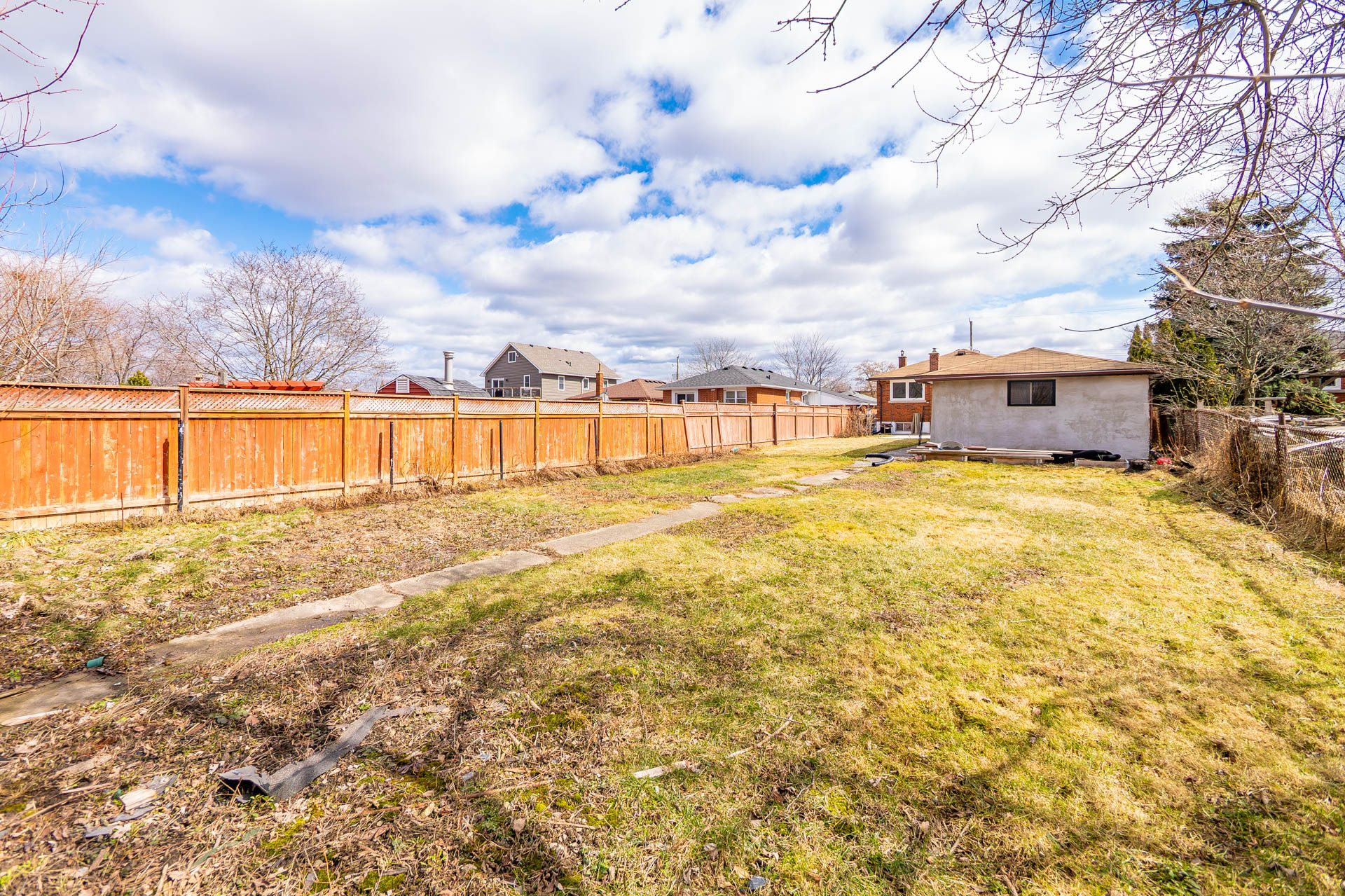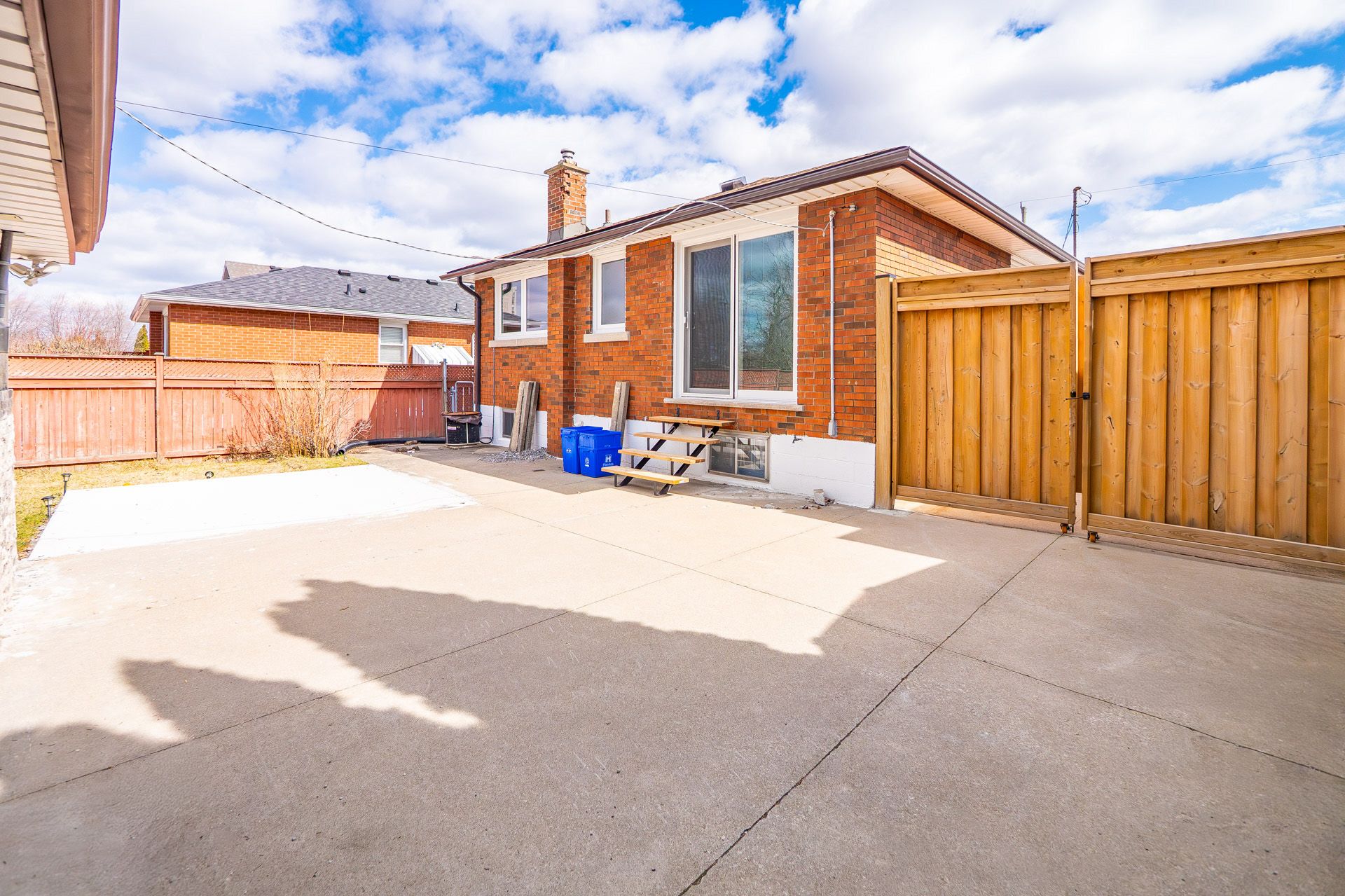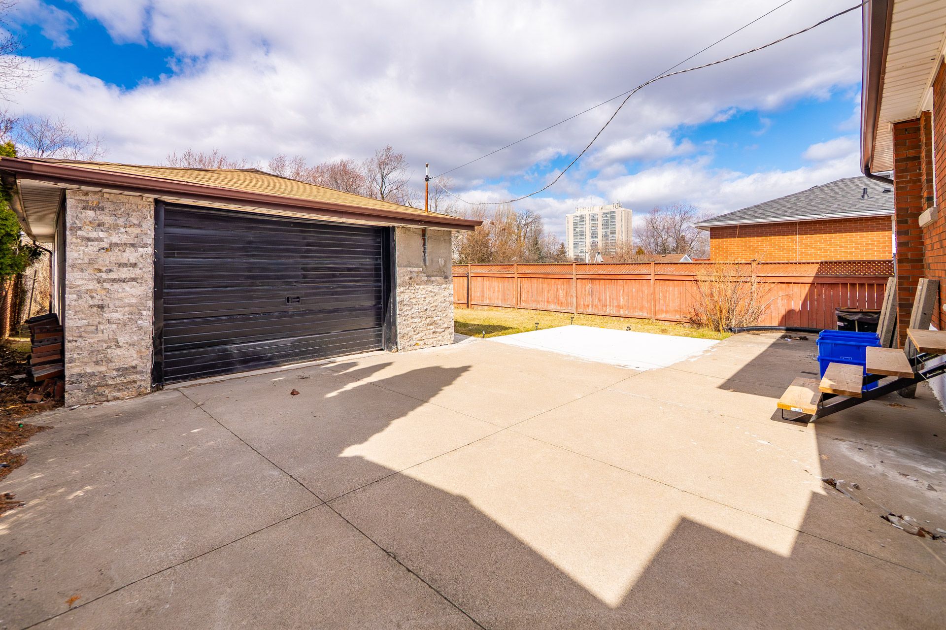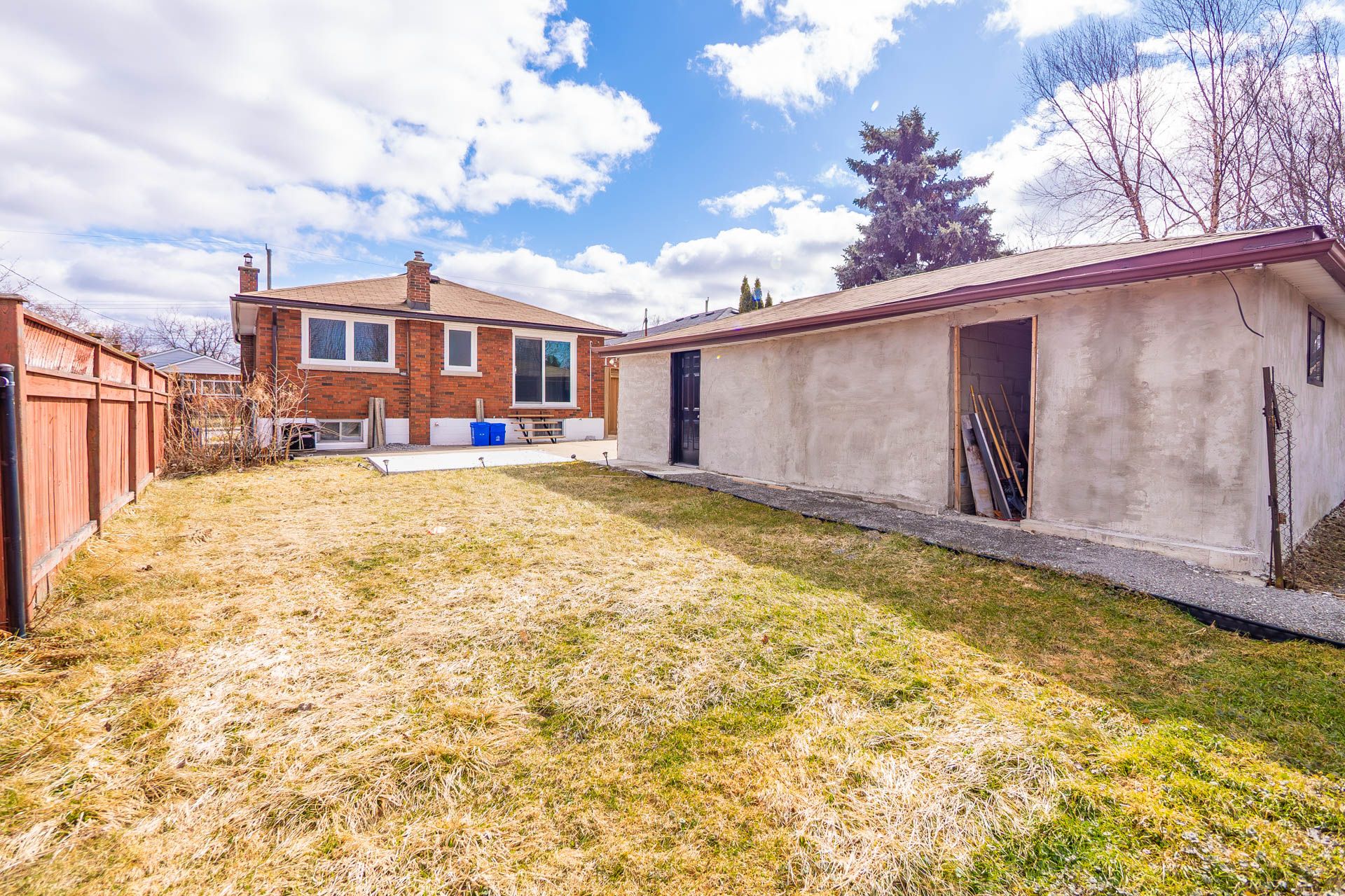 • Large fenced yard featuring a concrete patio and detached garage.