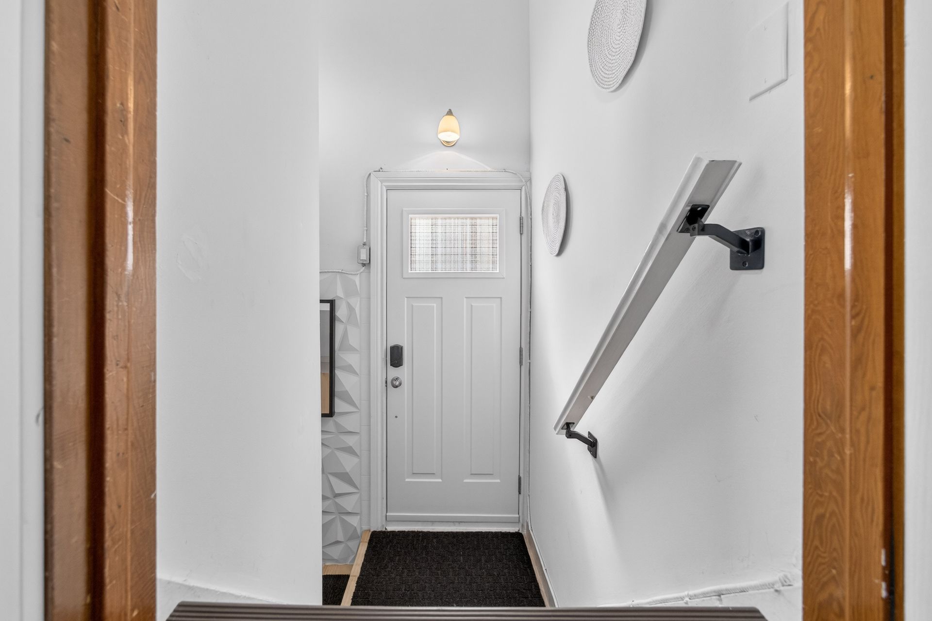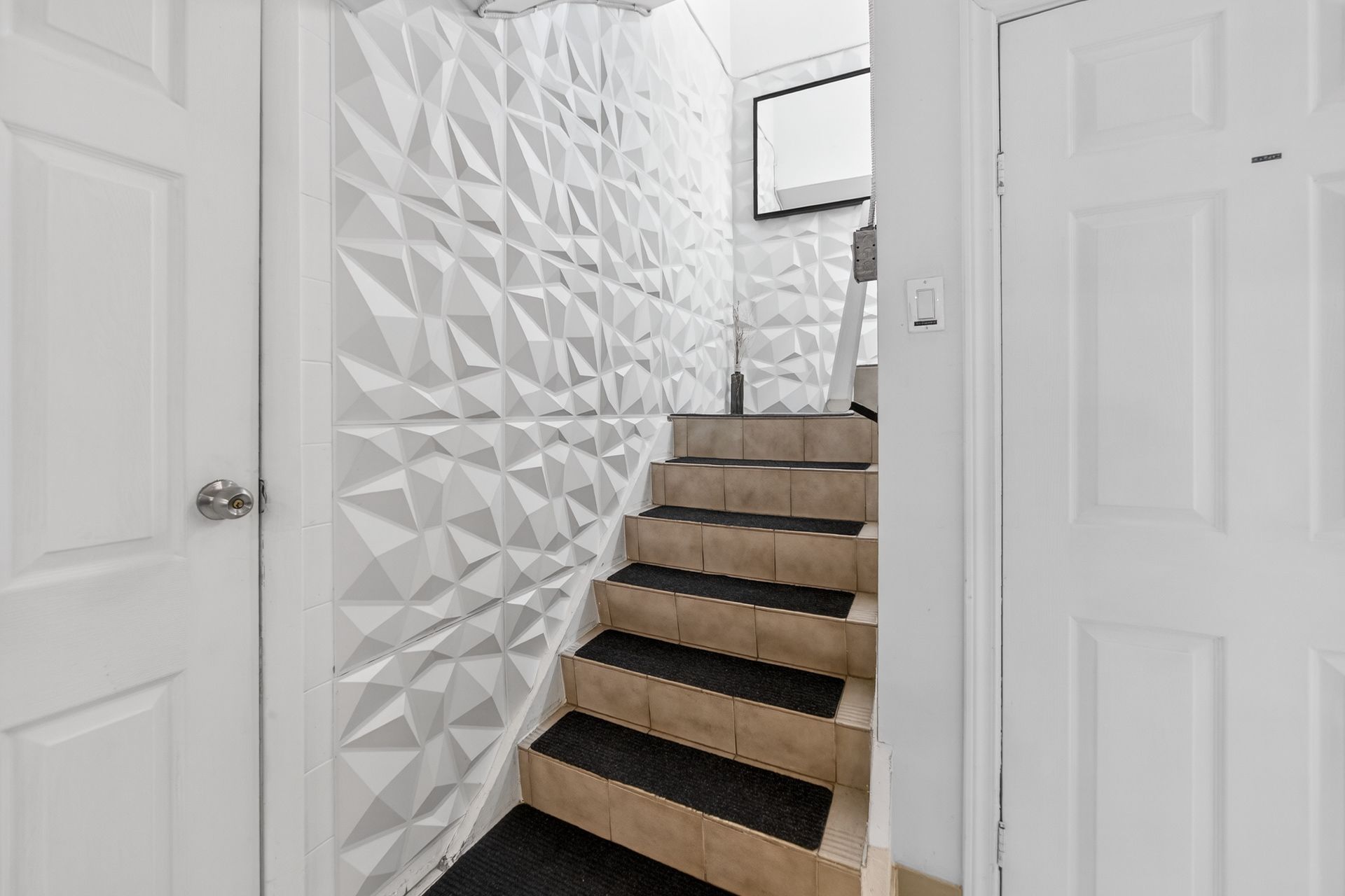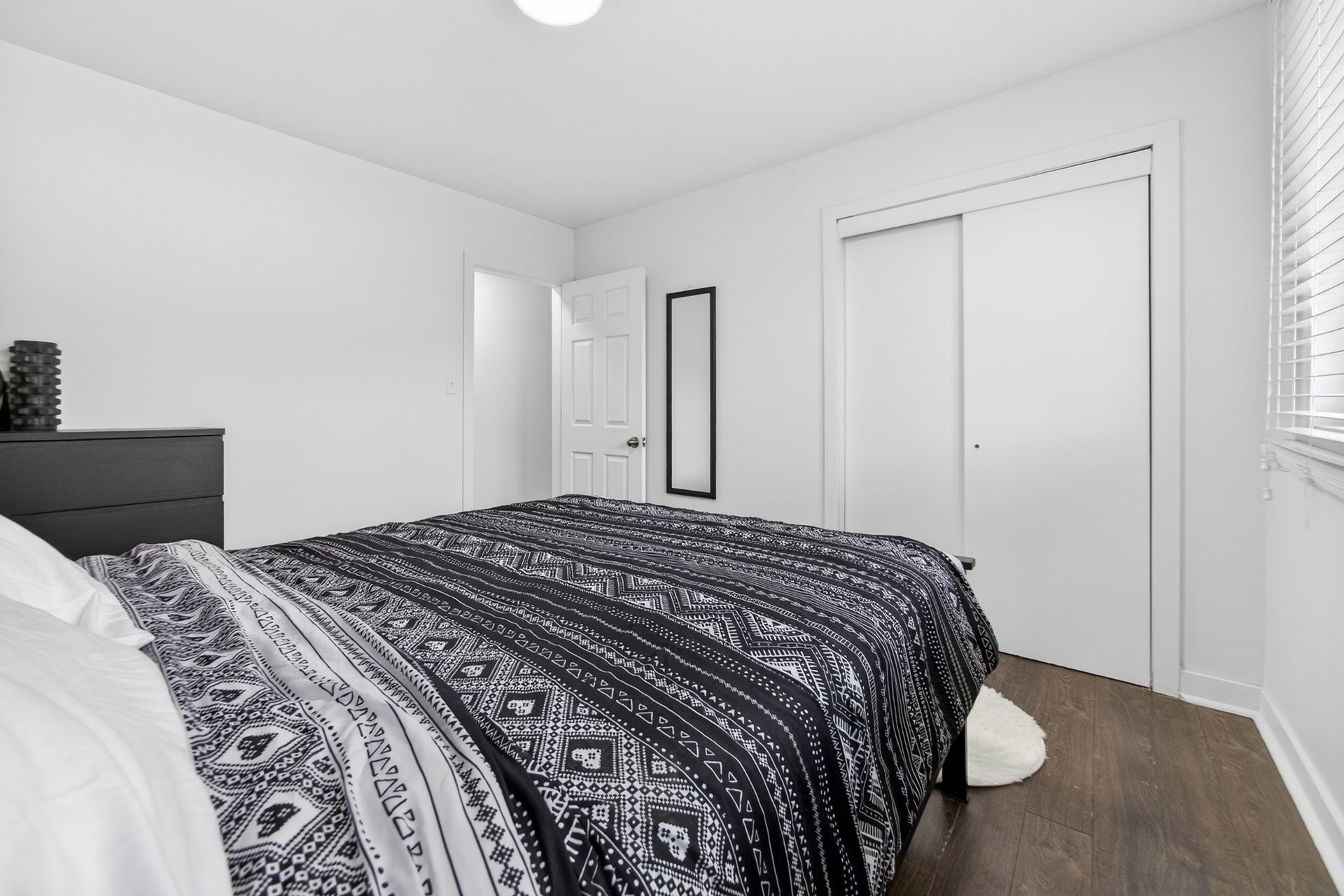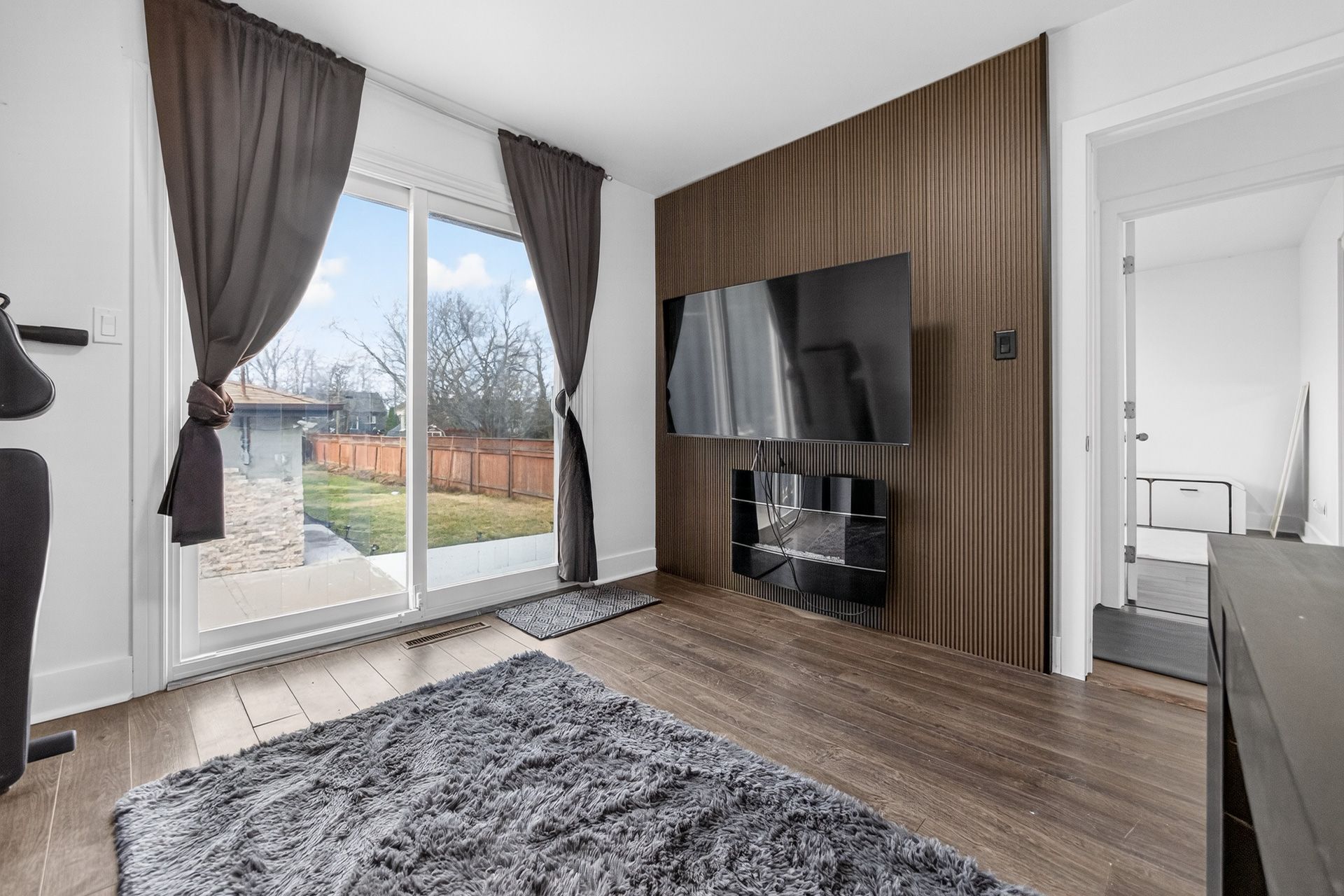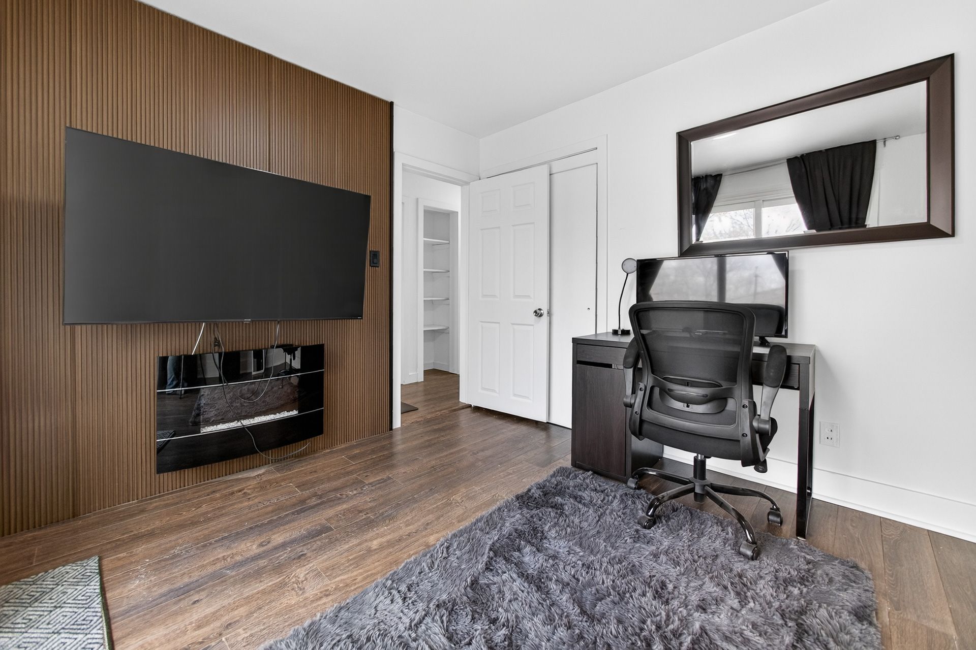 • Custom wood-slat accent wall in the unique third bedroom.