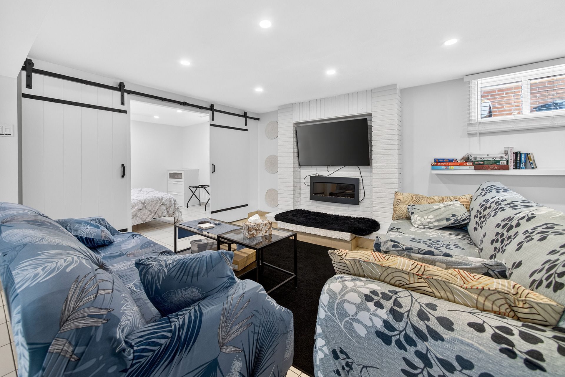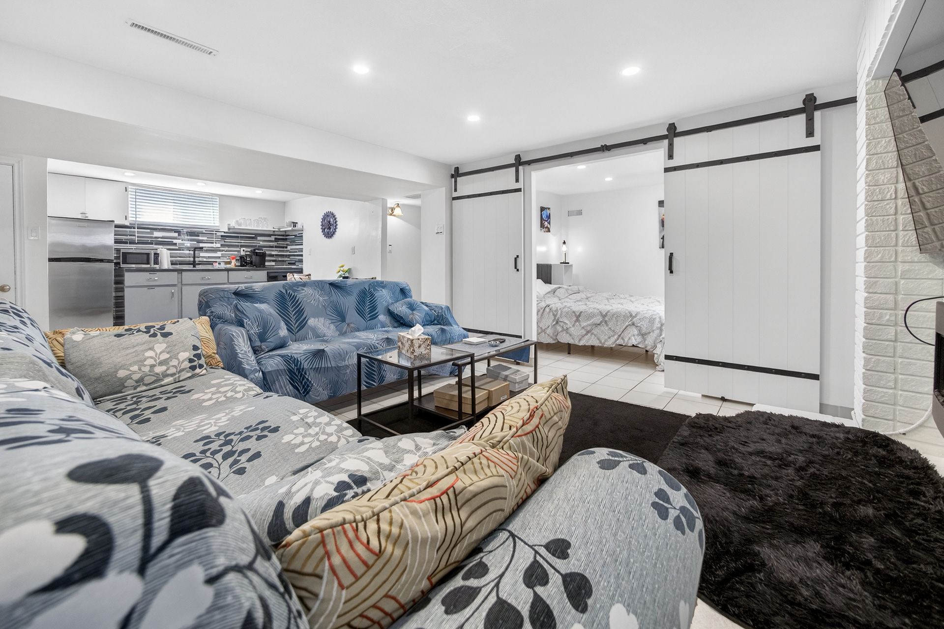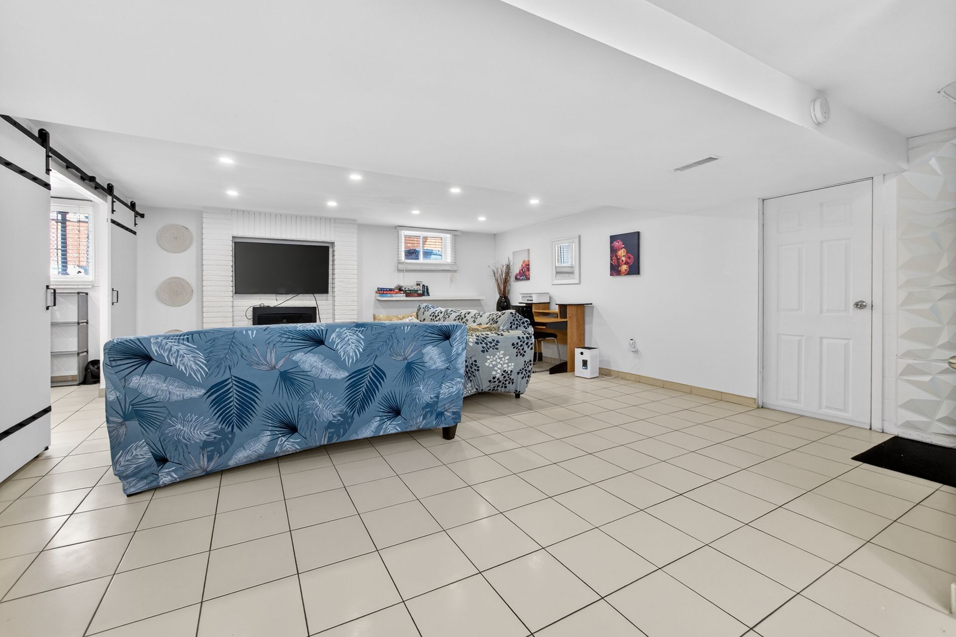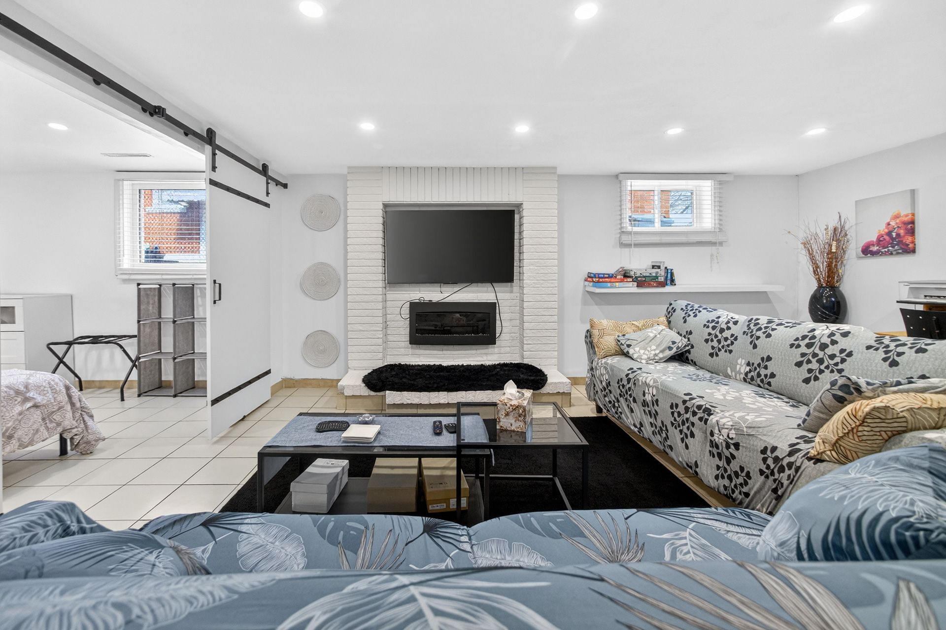 • Custom wood-slat accent wall in the unique third bedroom.