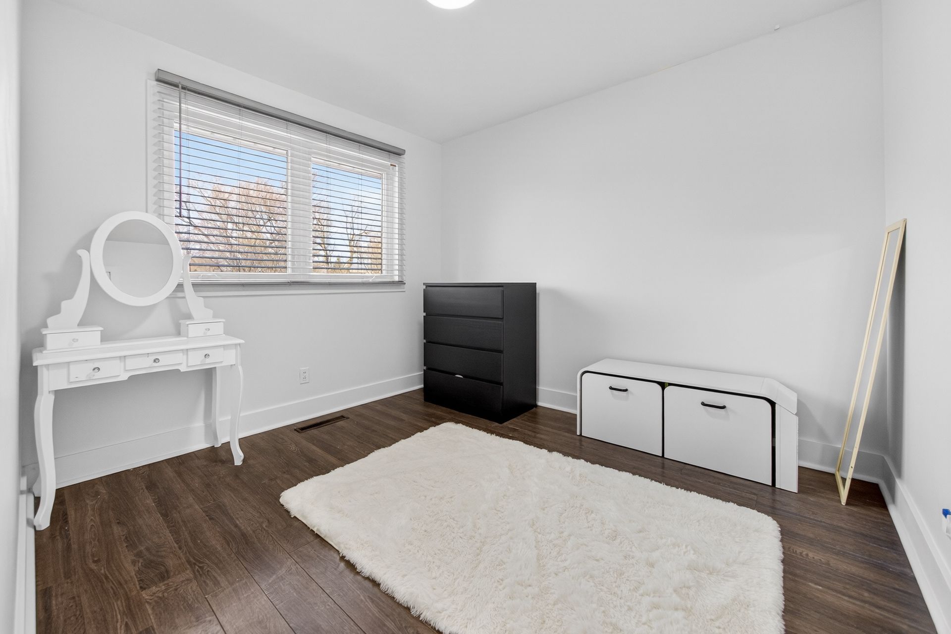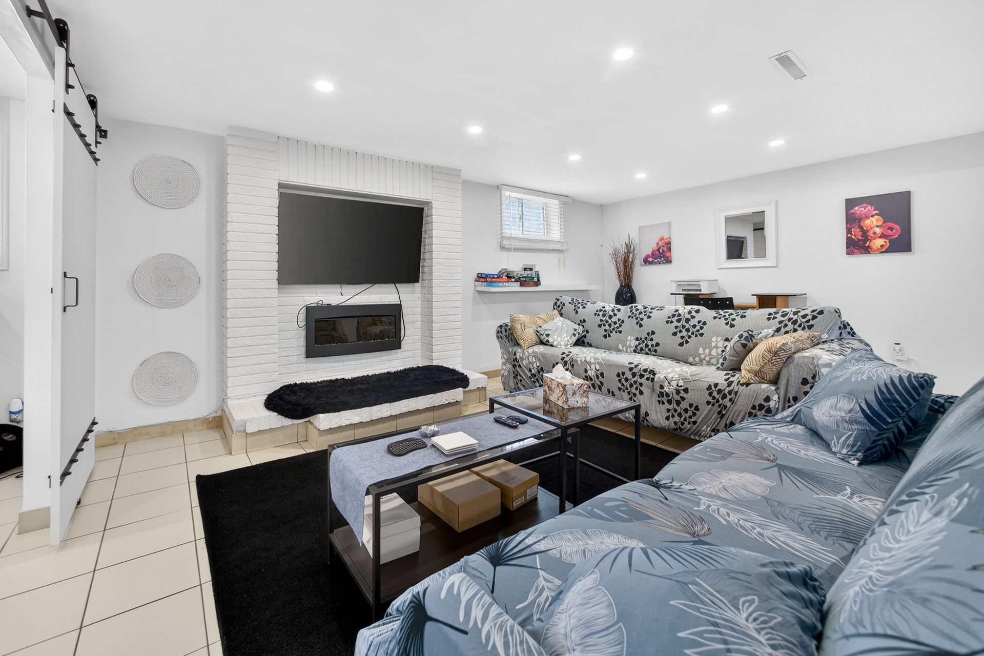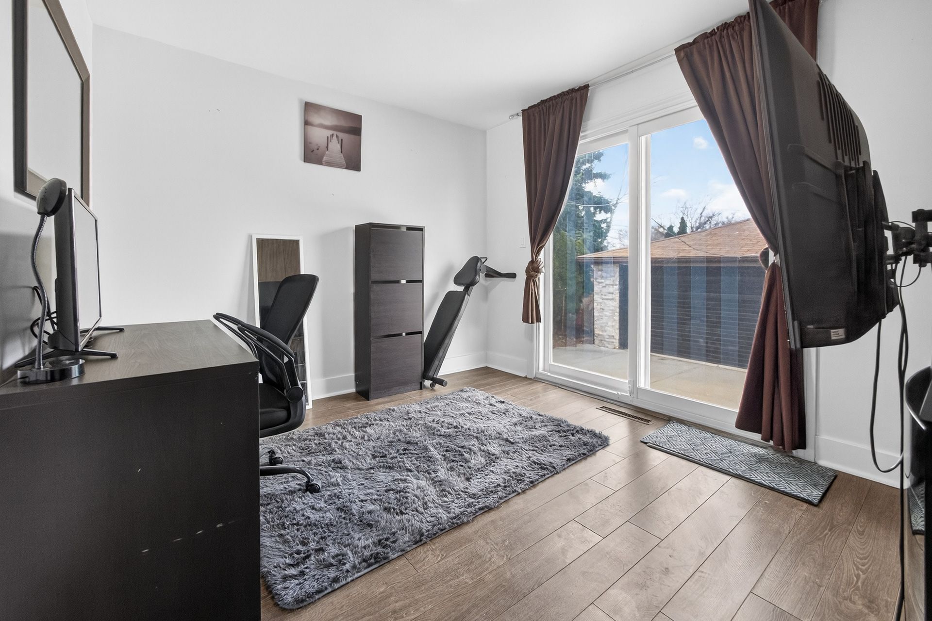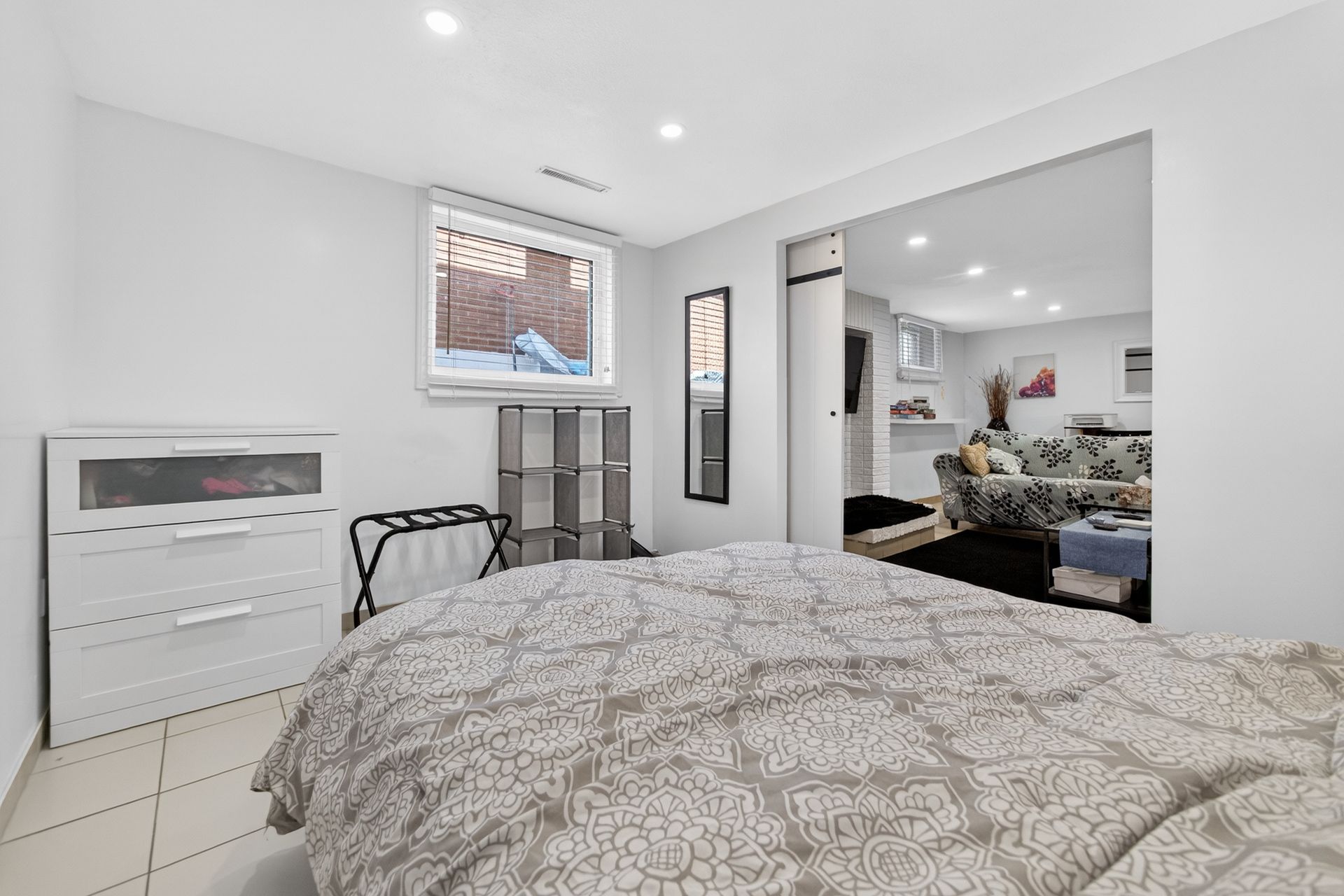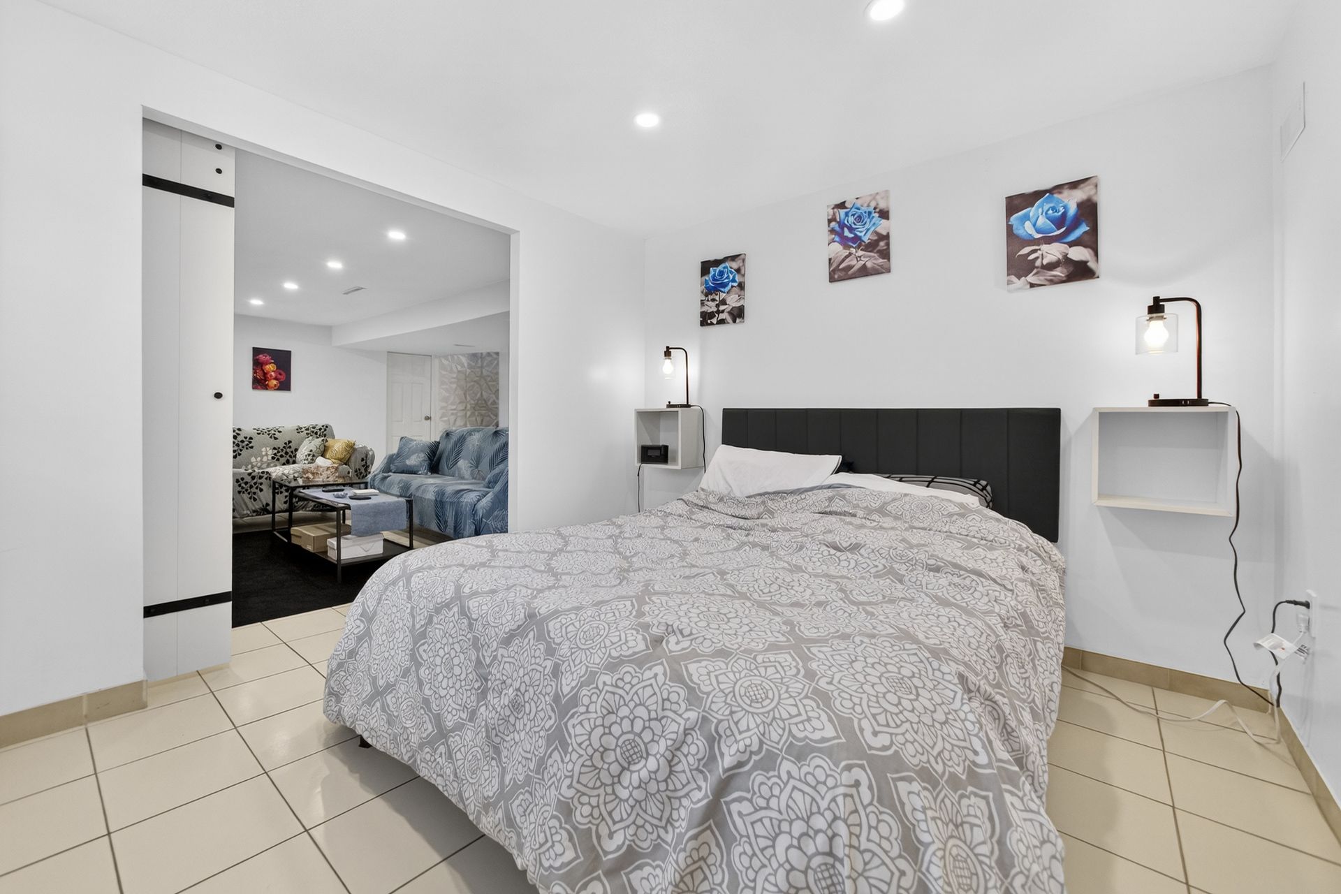 • Custom wood-slat accent wall in the unique third bedroom.