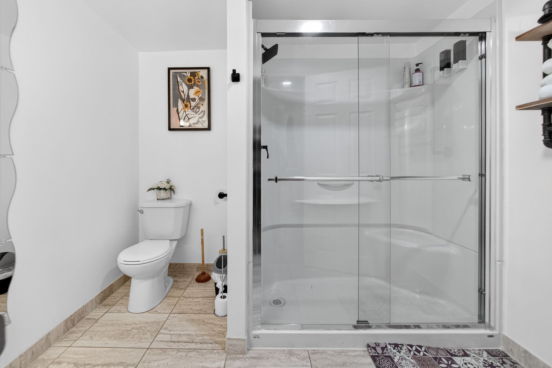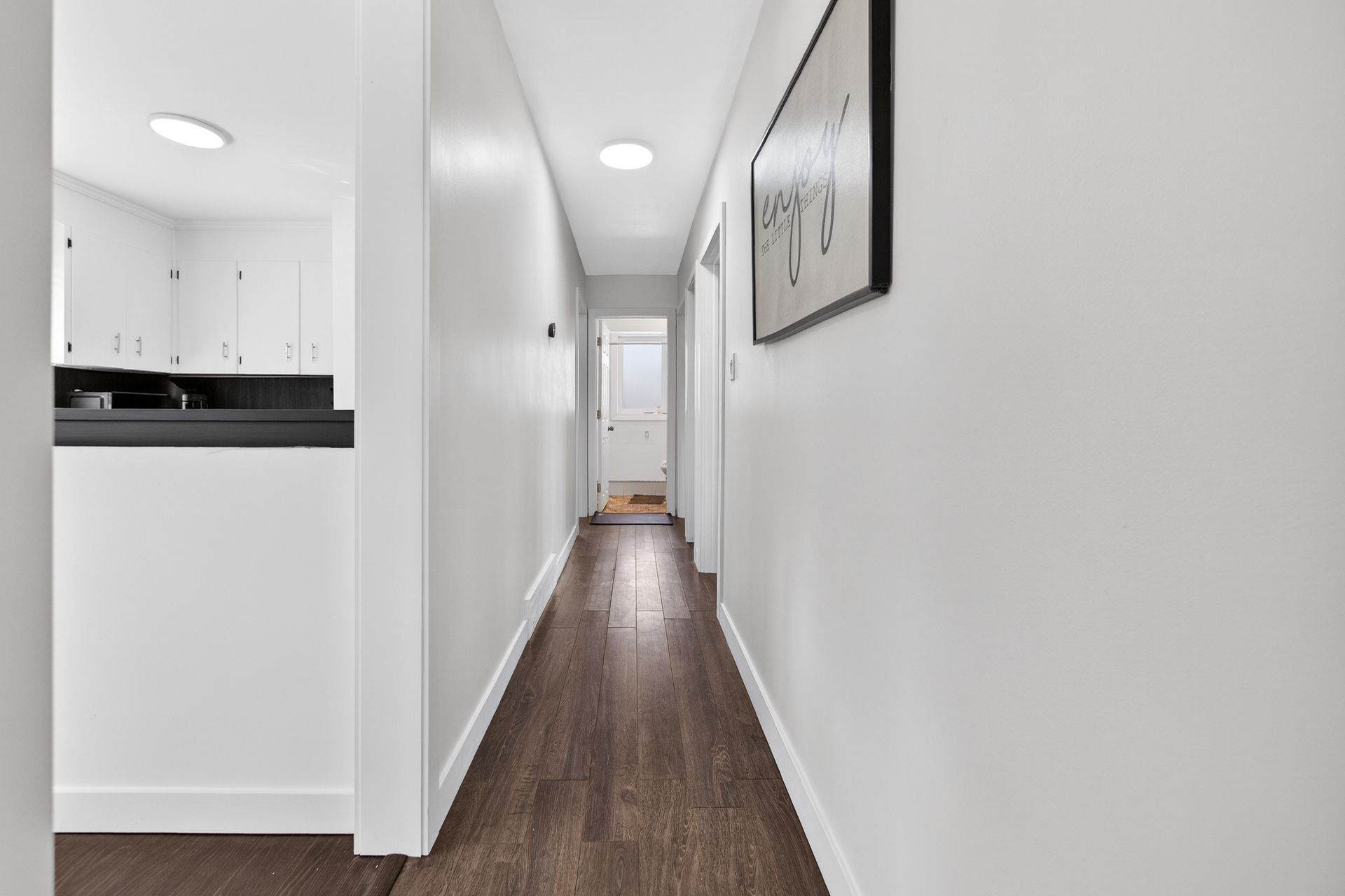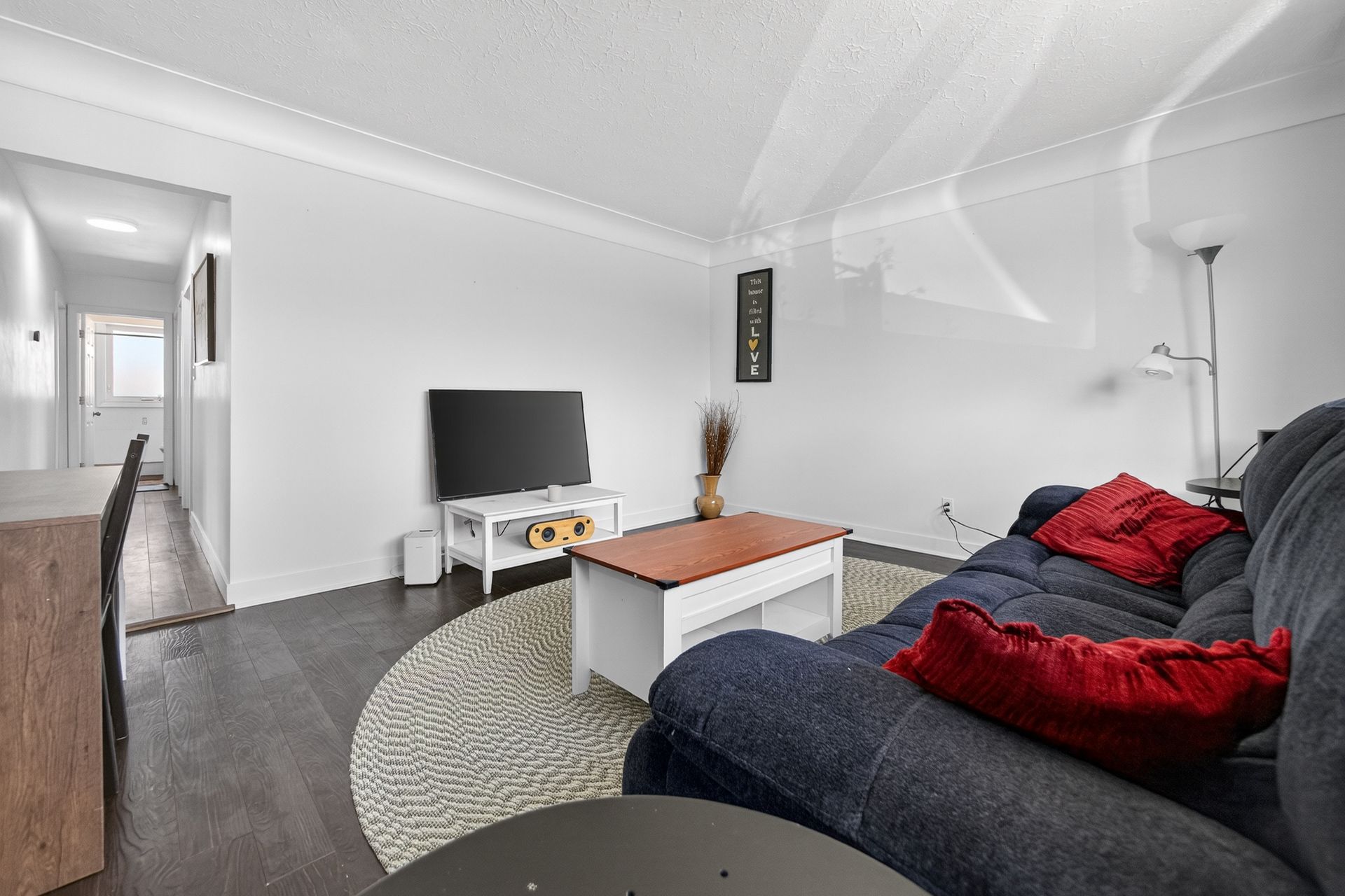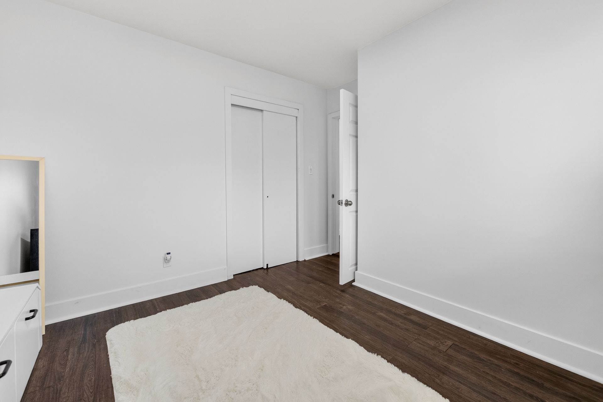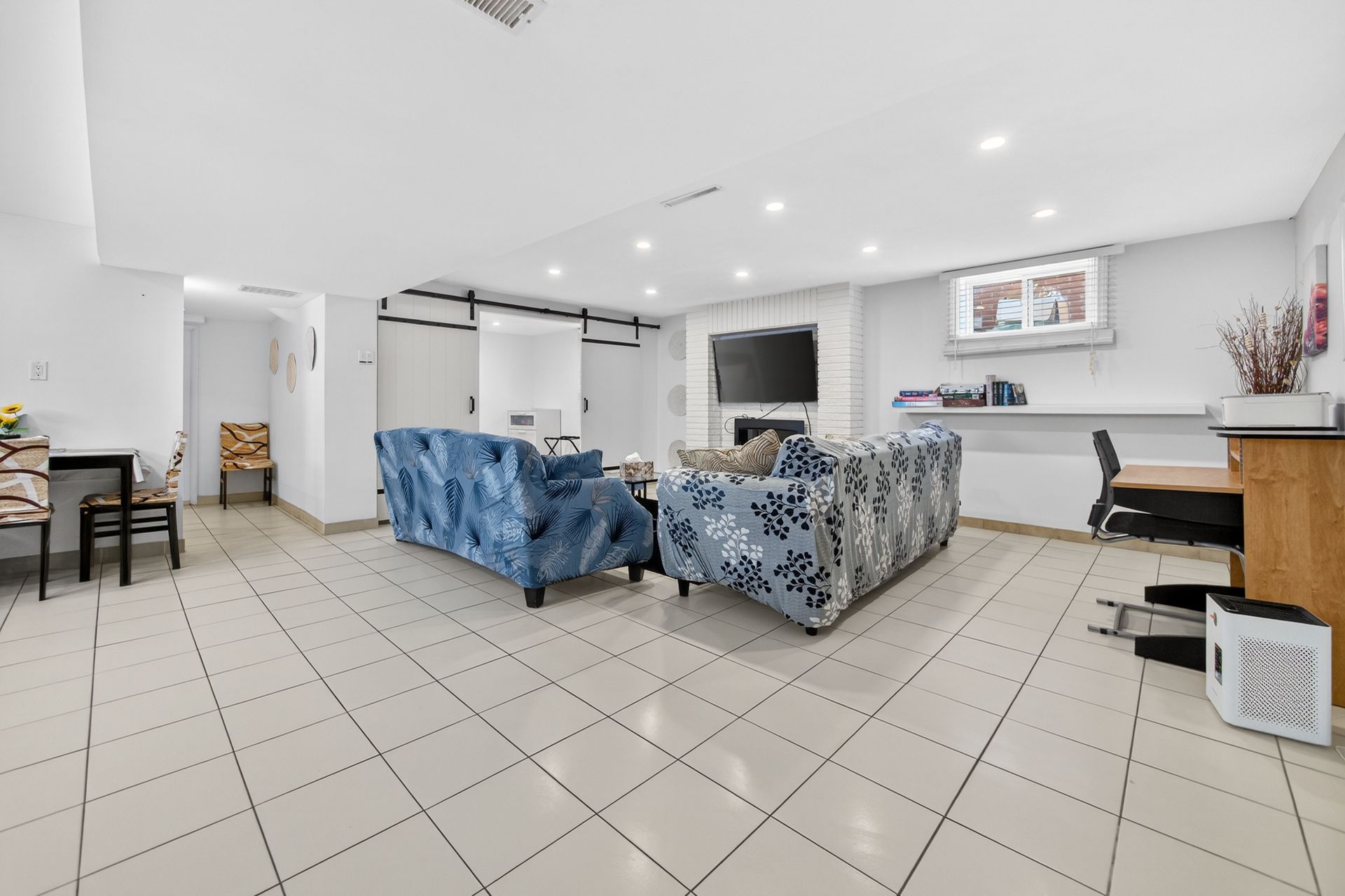 • Custom wood-slat accent wall in the unique third bedroom.