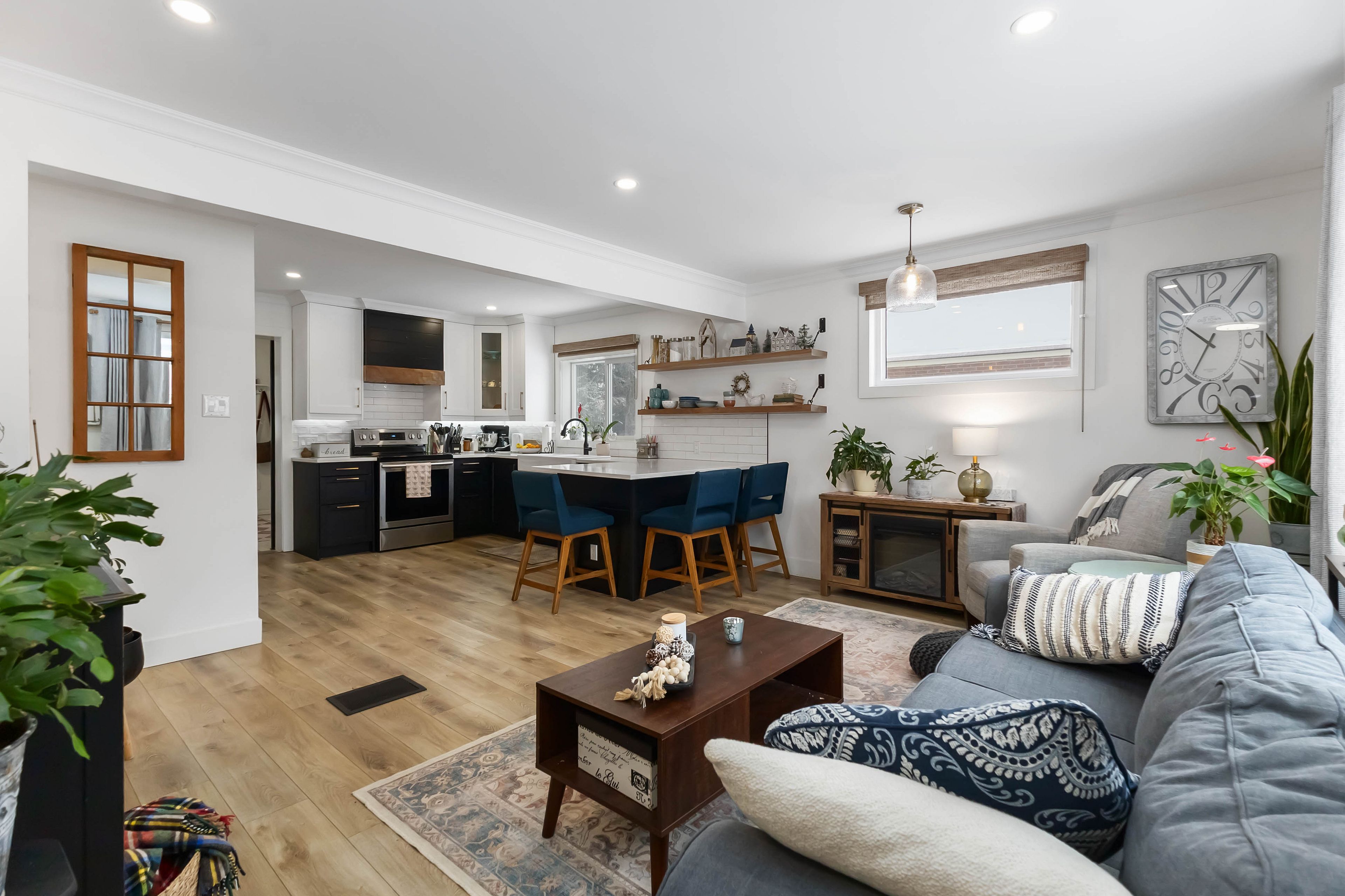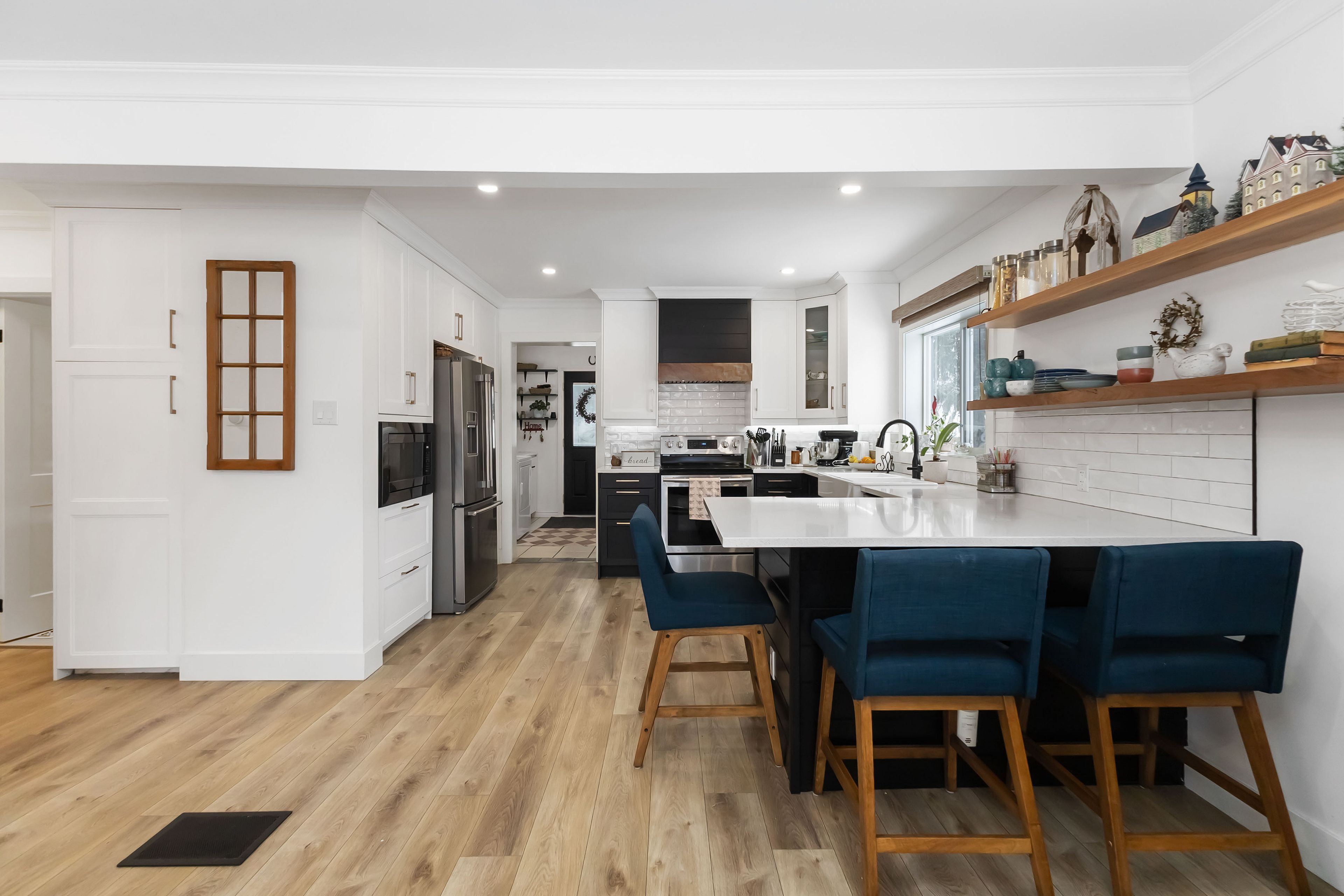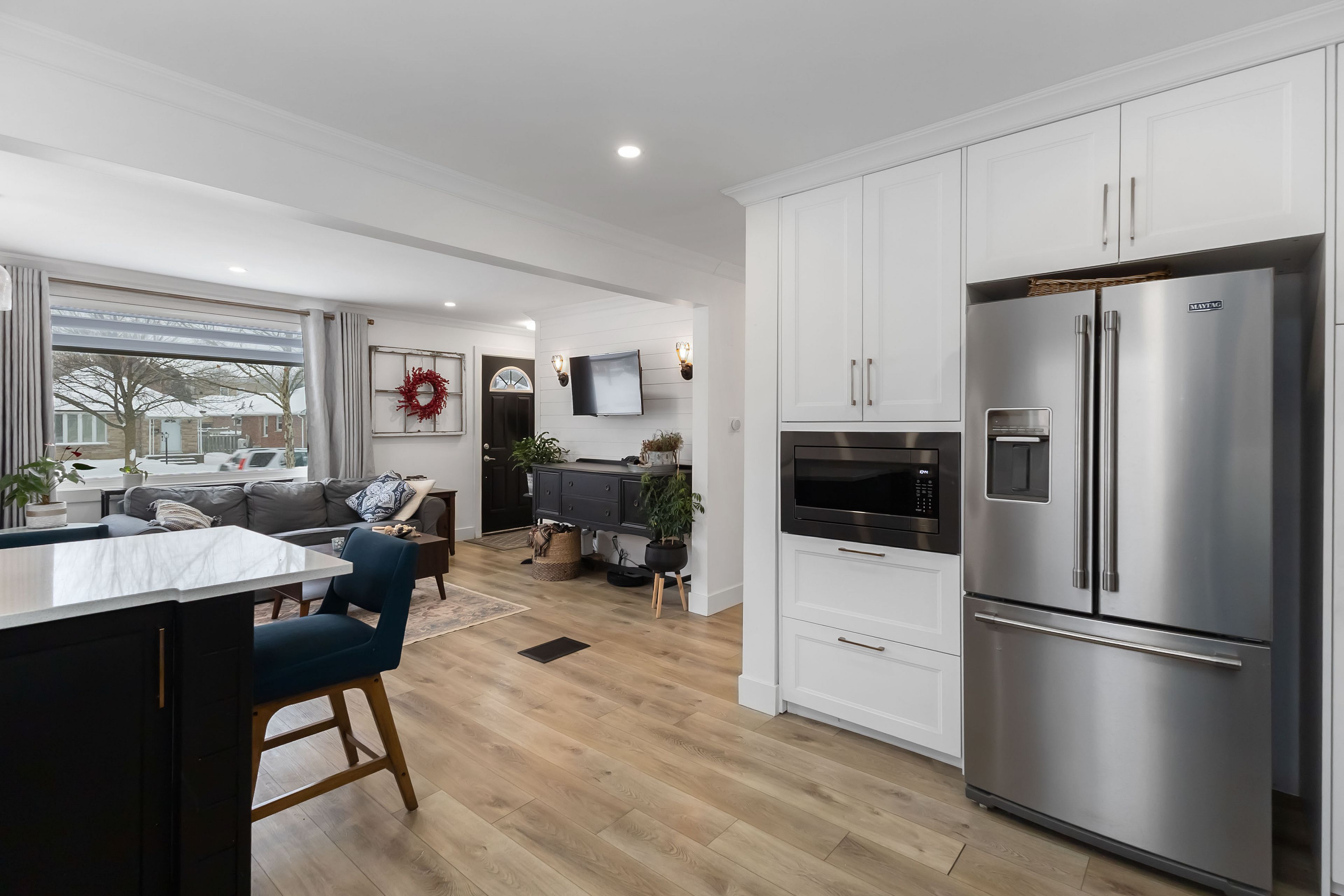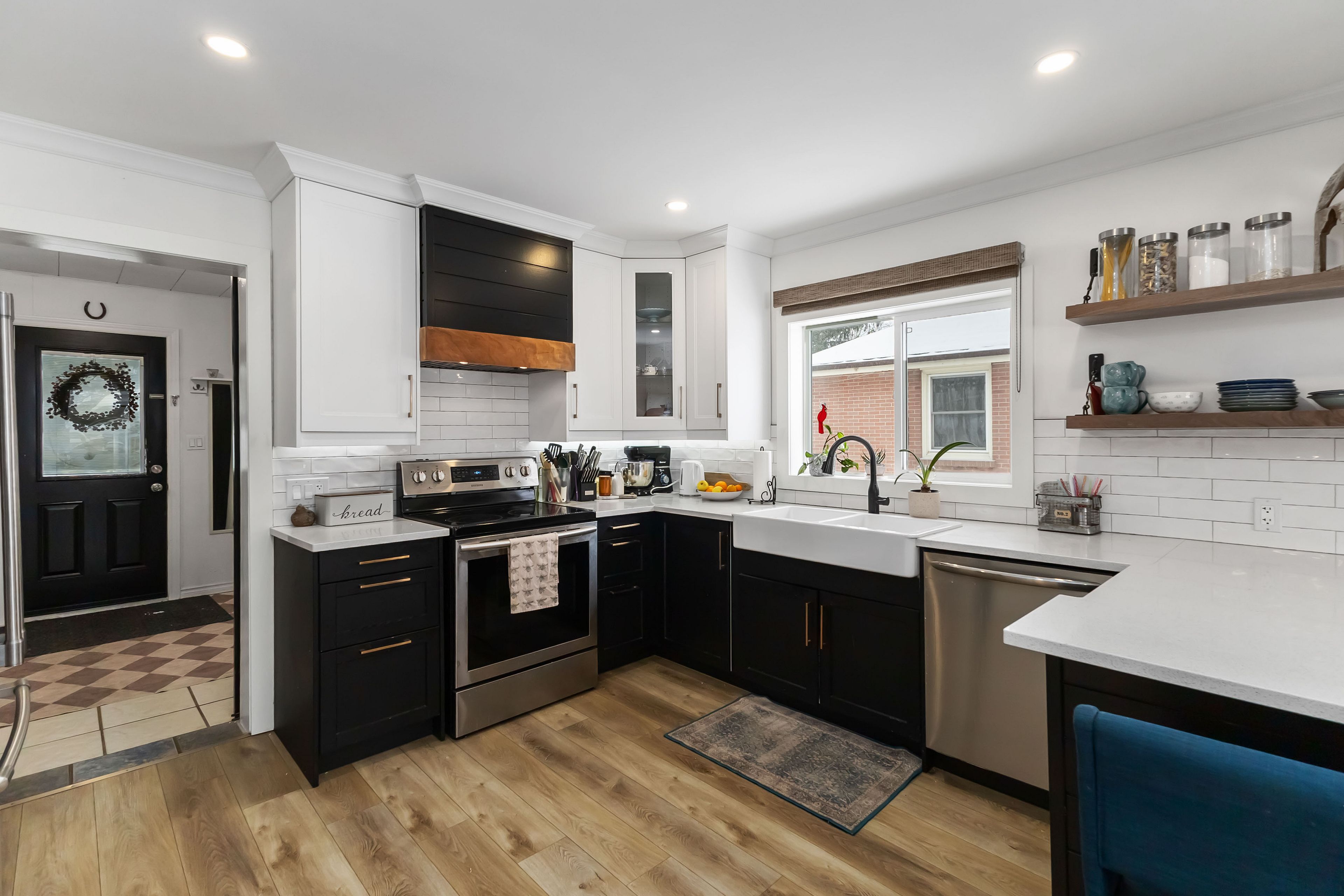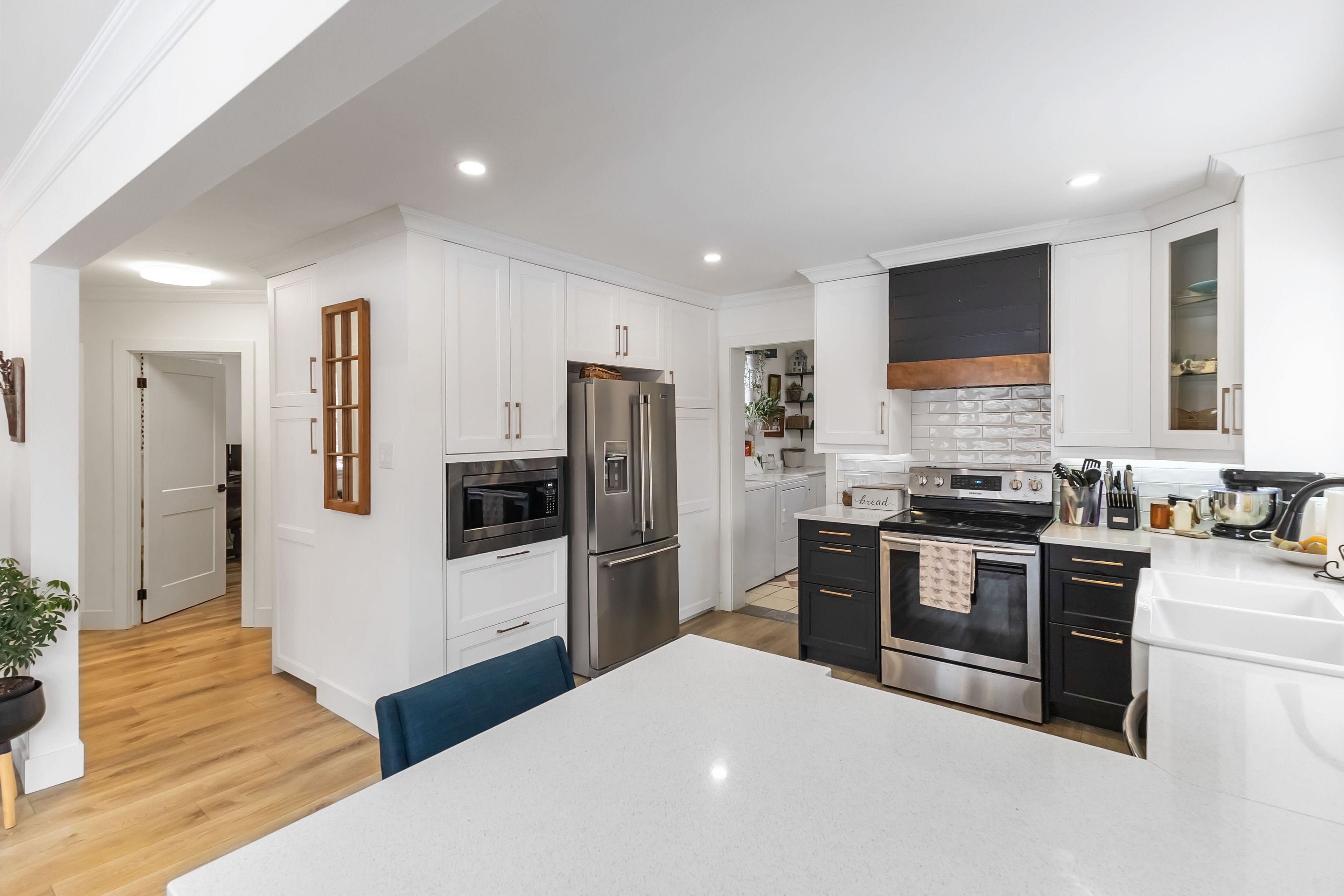 • Fully renovated kitchen with new cupboards and quartz countertop for modern cooking.