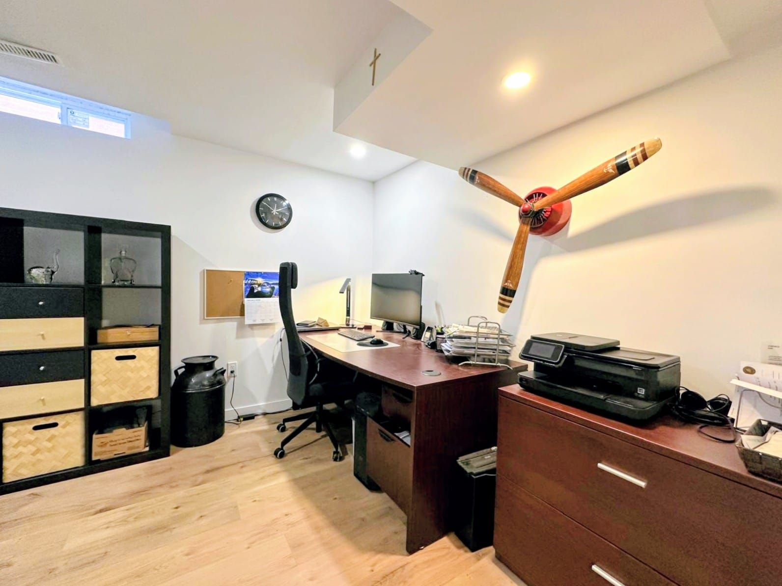 • Custom kitchen with quality appliances and a spacious island for cooking.