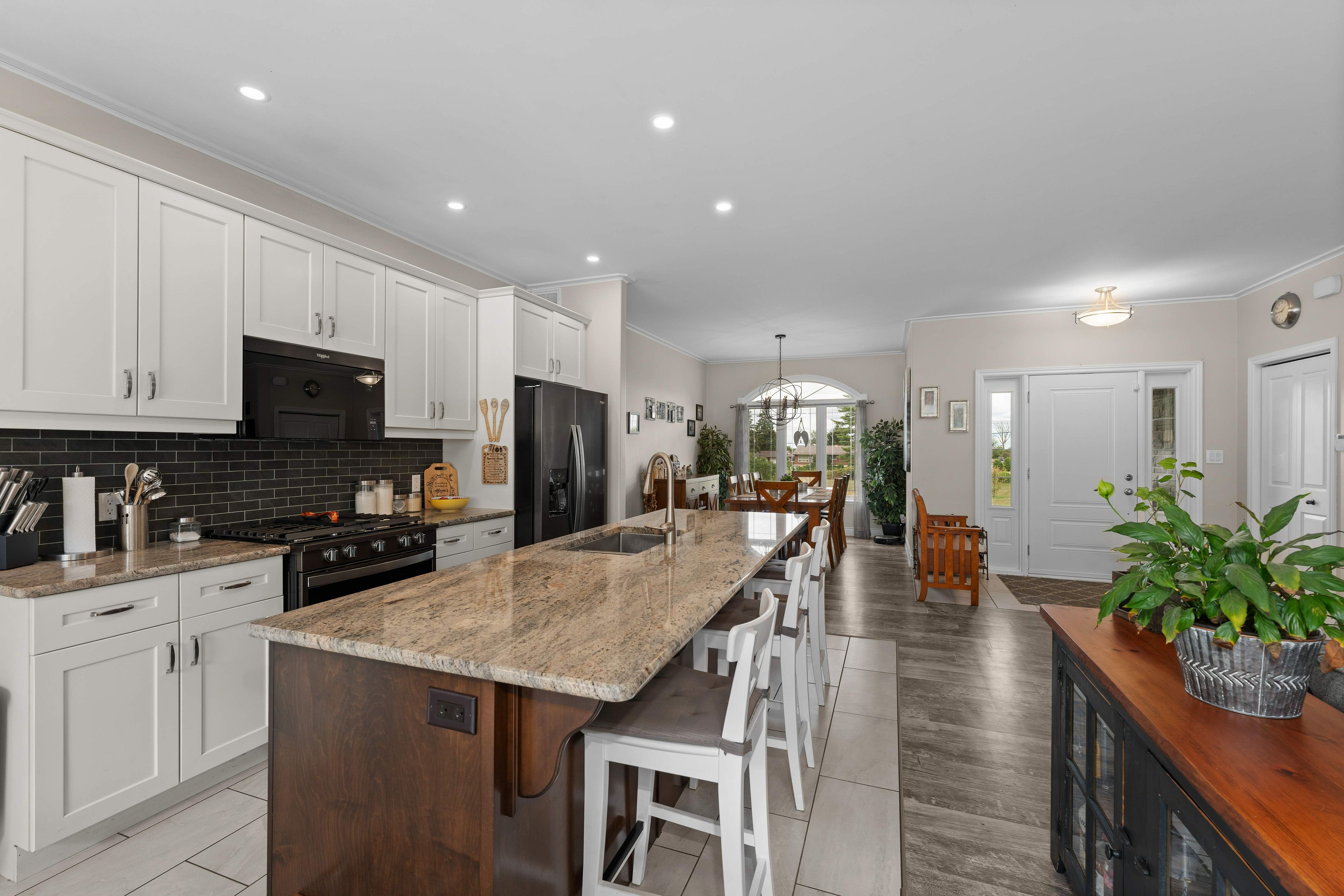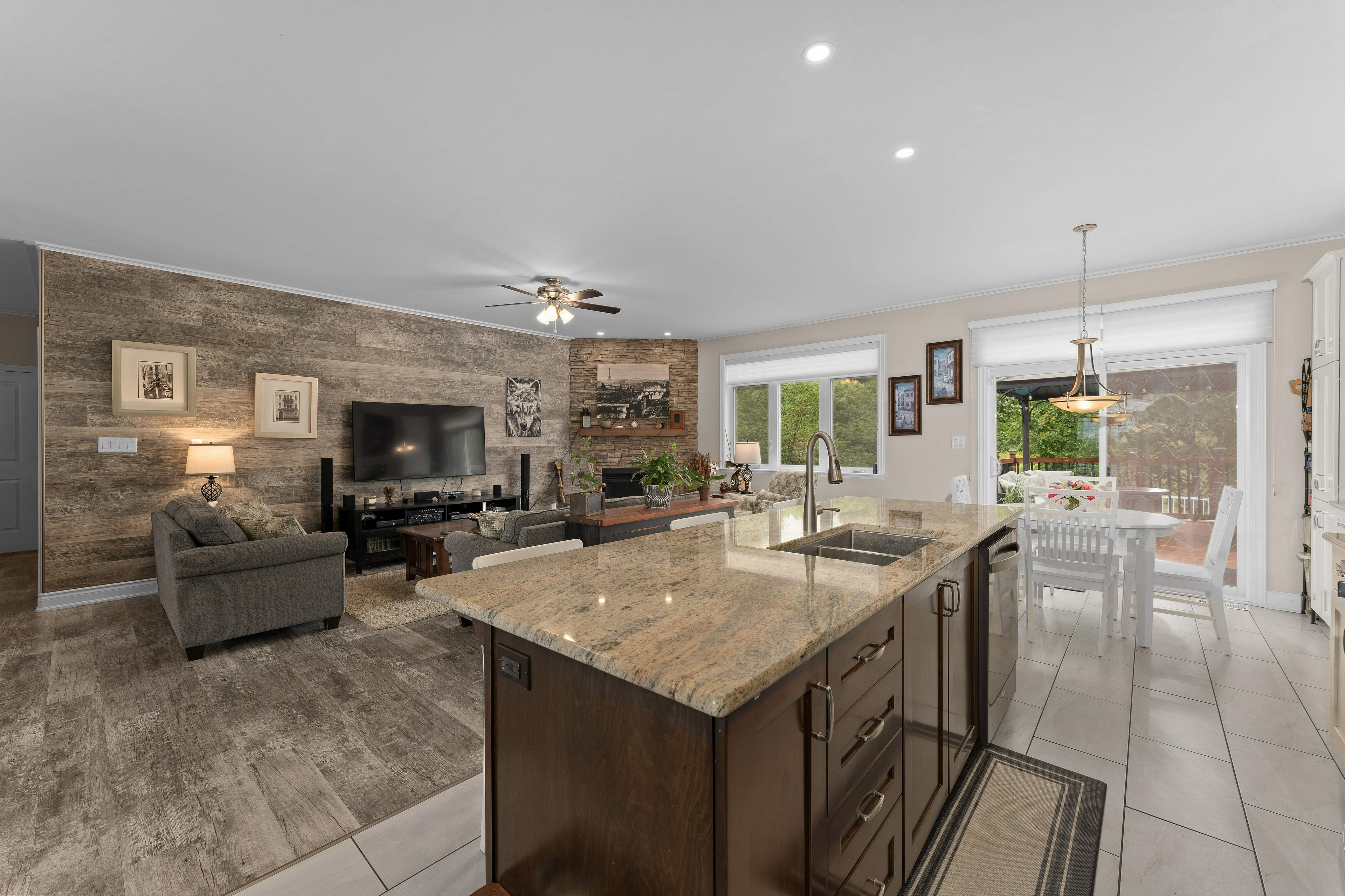 • Open concept main floor with a large kitchen and gas fireplace.