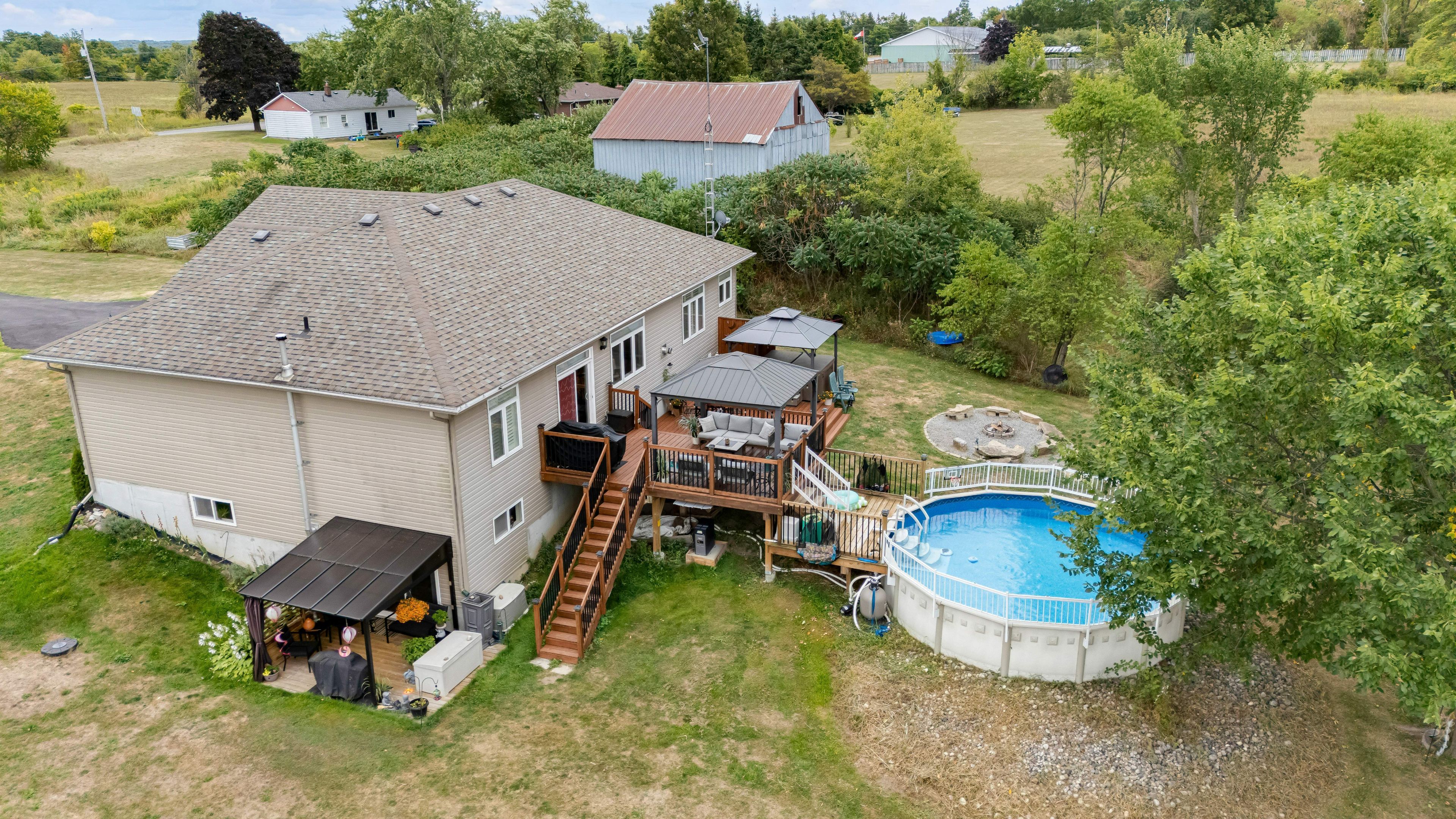 Wow!!! This absolutely loaded 4 bed 3 bath 2 kitchen custom built bungalow with apx 3000 sq' of finished living space on 3acres with walking/ atv trails, gardens and a pond, just 10 minutes from the 401, features a gorgeous open concept design on the main floor with a large and bright custom kitchen with granite countertops and brand new high end stainless steel appliances flowing to the living room with gas fireplace and back deck with gazebo overlooking the pool and quiet green space, 3 spacious bedrooms including a huge primary bedroom with luxury ensuite and walk in closet. The lower level offers an incredible fully loaded in-law suite with full height ceilings, a second large custom kitchen, pot lights, a ground level walkout to a private covered patio and side yard. Not to mention a loft in the fully insulated and heated garage, a cummins generator, 2 firepits, 2gazeb