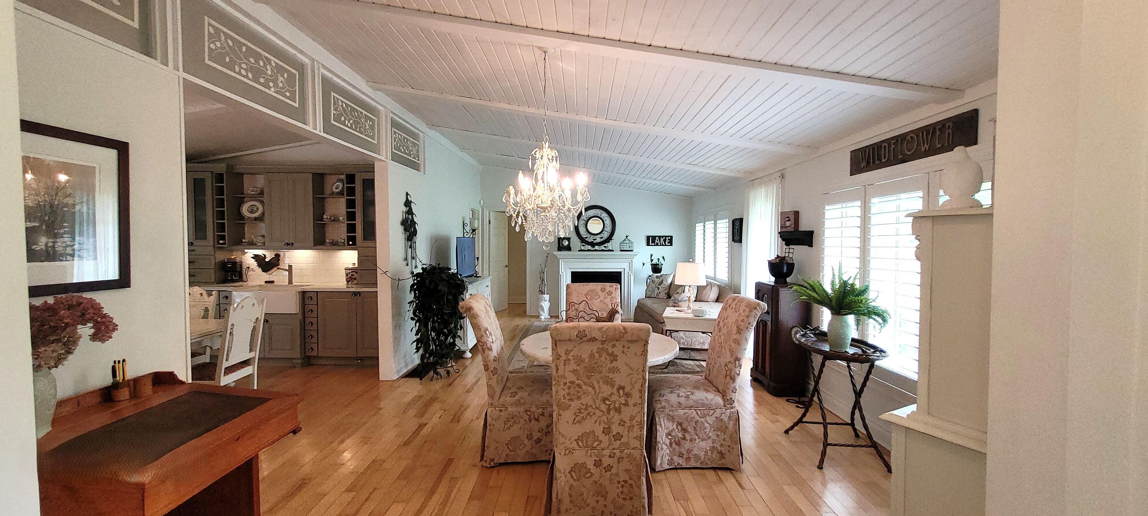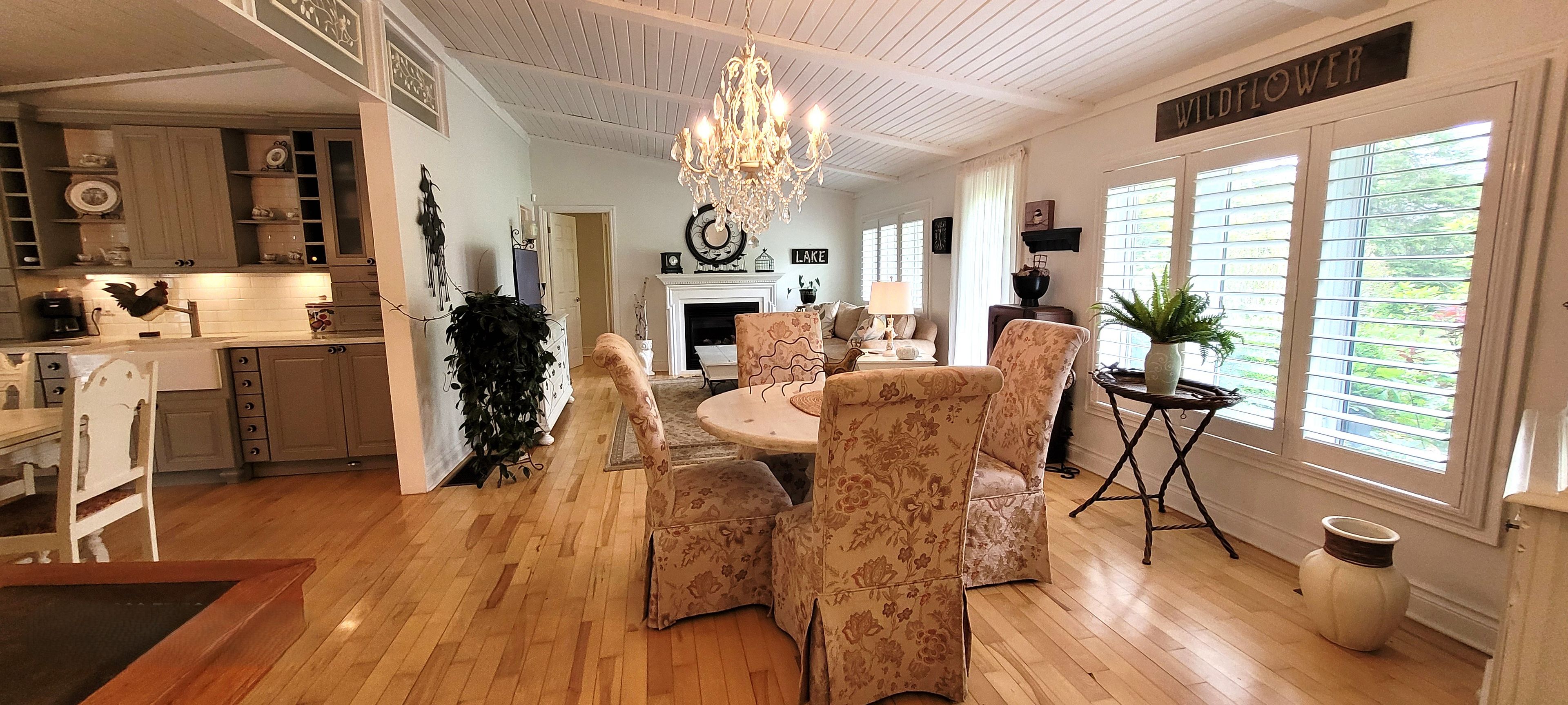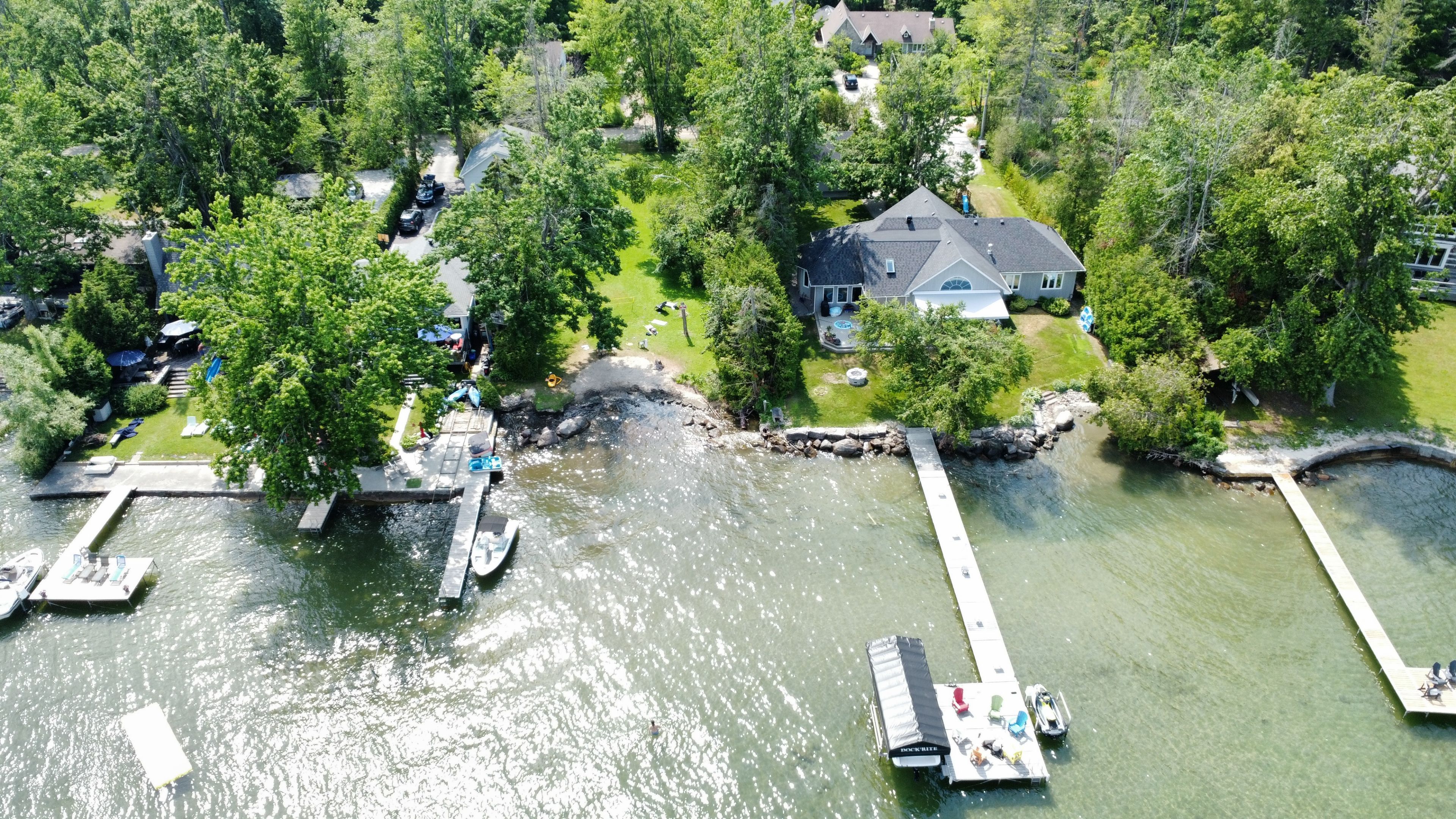 An absolutely charming home located in sought-after desirable area. A must see. With a deeded waterfront beach lot on lake simcoe. Located across the road from this completely transformed elegant bungalow. Access by a private road to glenhaven beach association community surrounded by 35 acres of forest and walking trails both owed by the association. Close access to friday harbor amenities including shops and restaurants. This home provides an abundance of natural light through the many front windows. Hardwood floors throughout. Home has 2 separate sleeping areas. Between the 2 wings is a martha stewart designer kitchen, dining and living room. Two of the bedrooms have ensuite baths one with heated floor and for comfort extra large custom shower & deep separate soaker tub. Both primary bedroom and kitchen have double door walk outs to the large deck. Living room has a cozy gas fireplace insert. Home heat by forced air gas. Outdoor 24 by 18 foot covered entertainment building. Close access to friday harbor amenities including shops and restaurants. The deeded access vacant beachfront lot is to the right of your view, and to the left while viewing the sunset, in the winter months without leaves filling out on the trees, there is a waterview!. This home is a rare find.