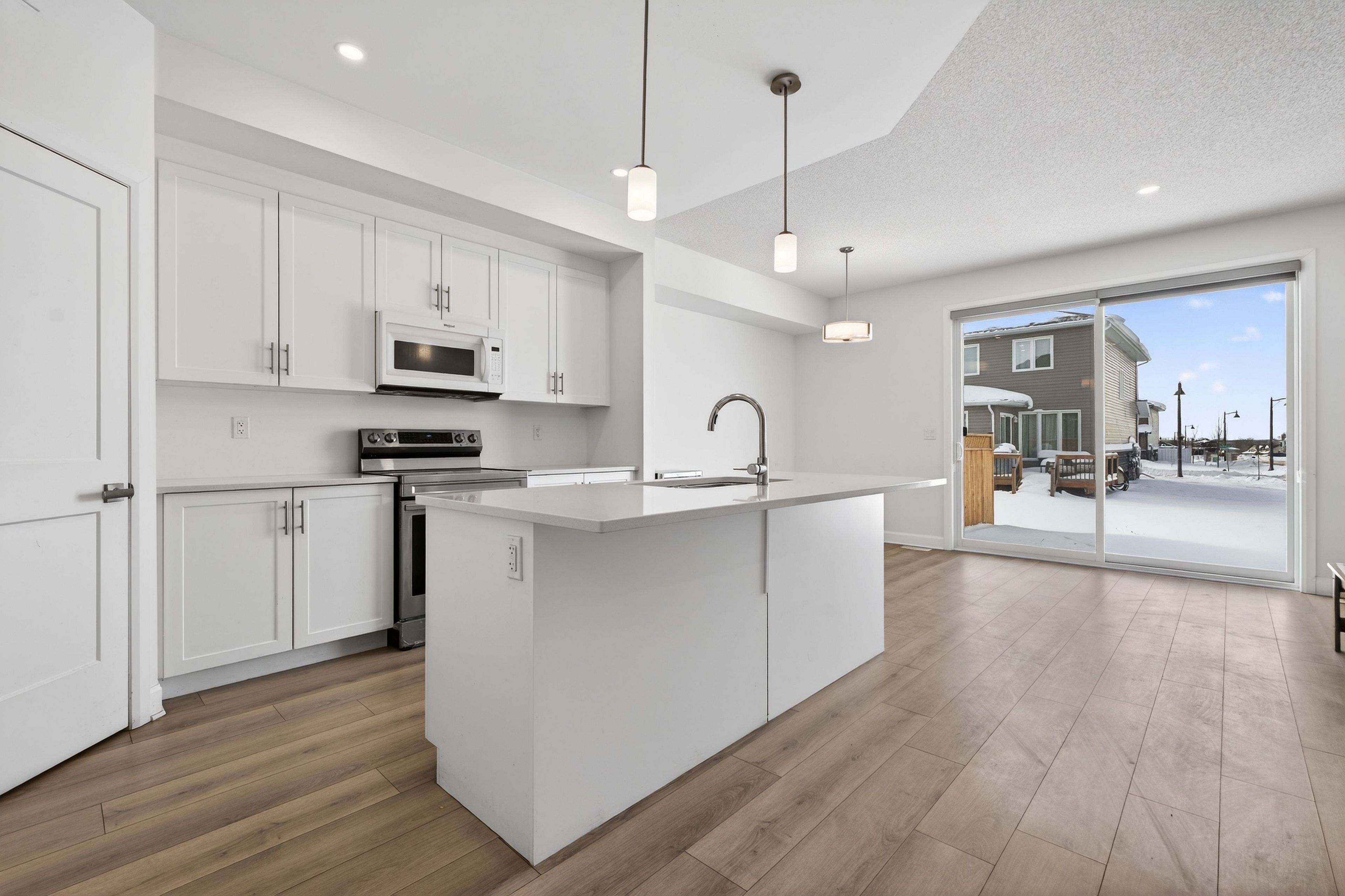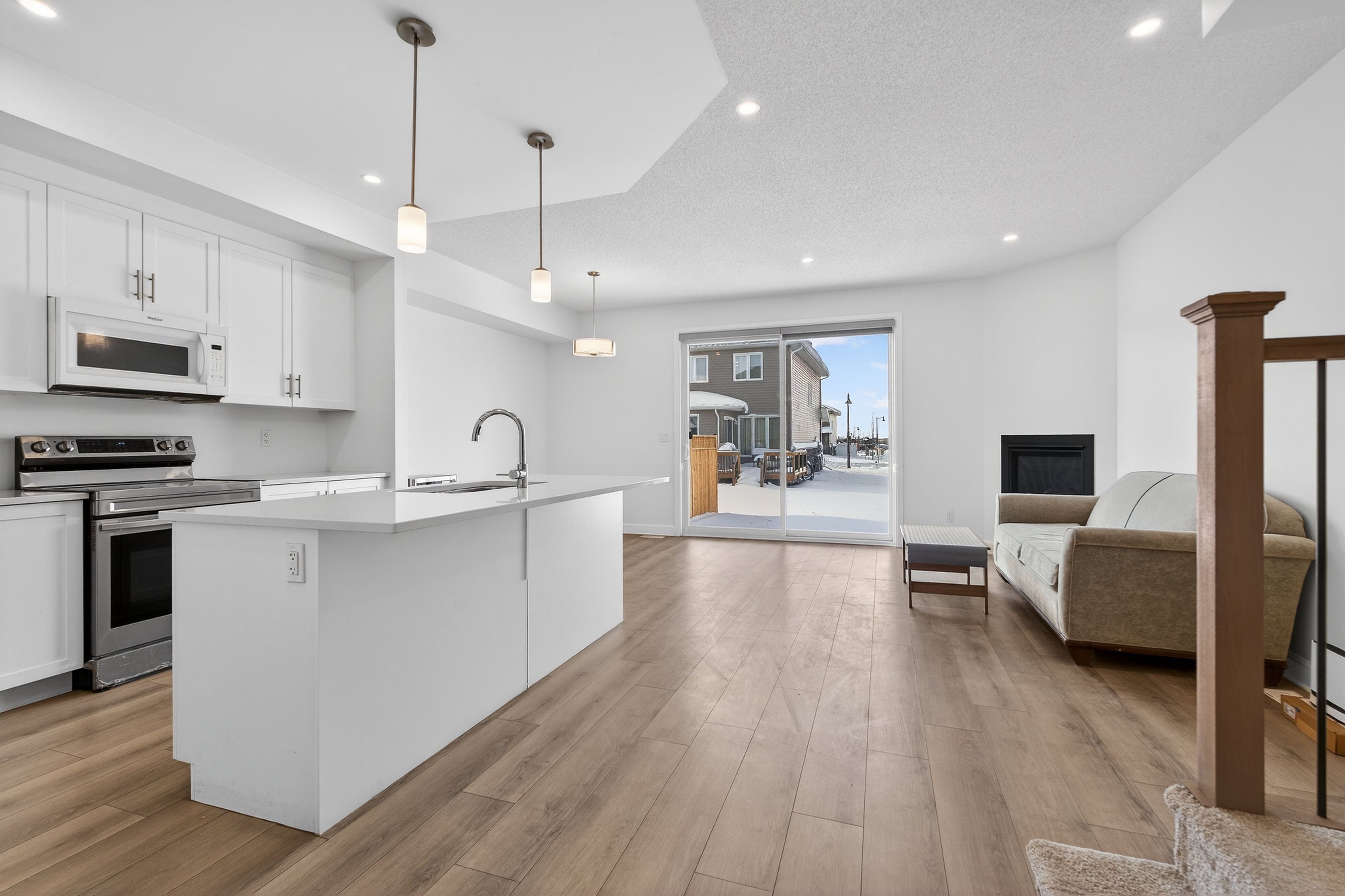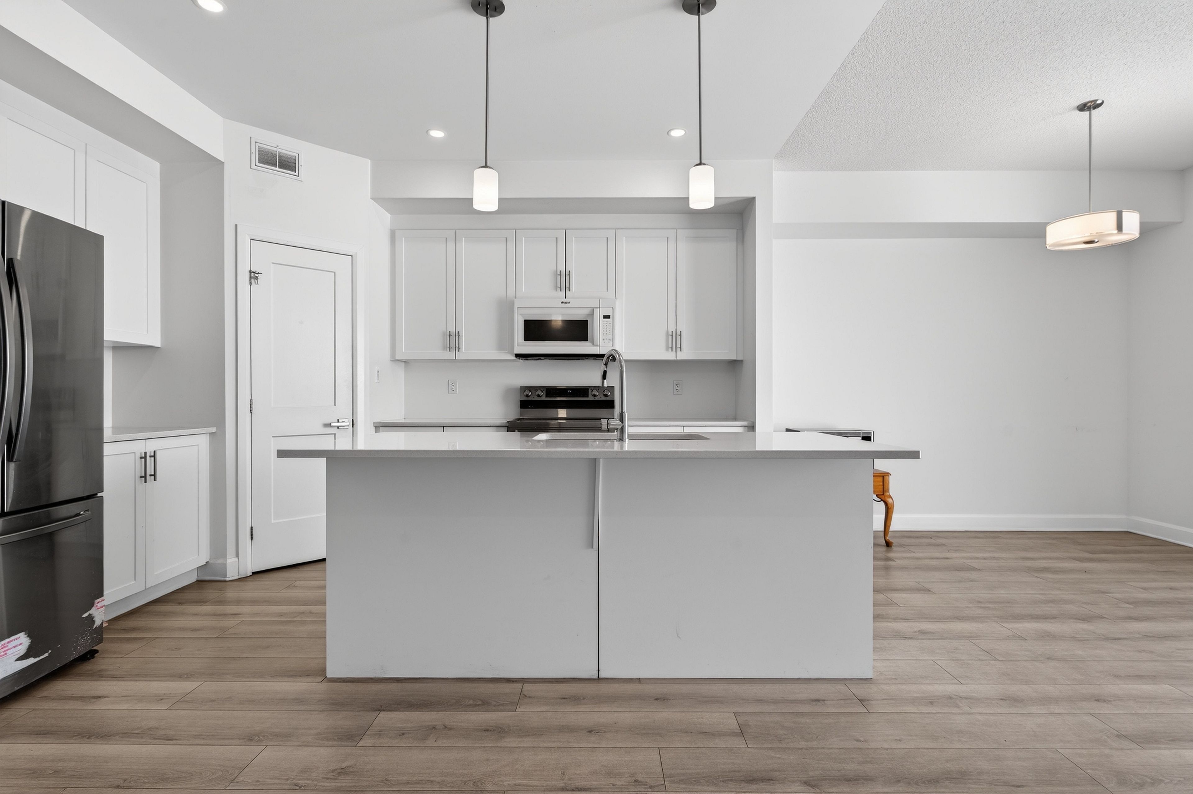 • Upgraded kitchen features a large island and quartz countertops.