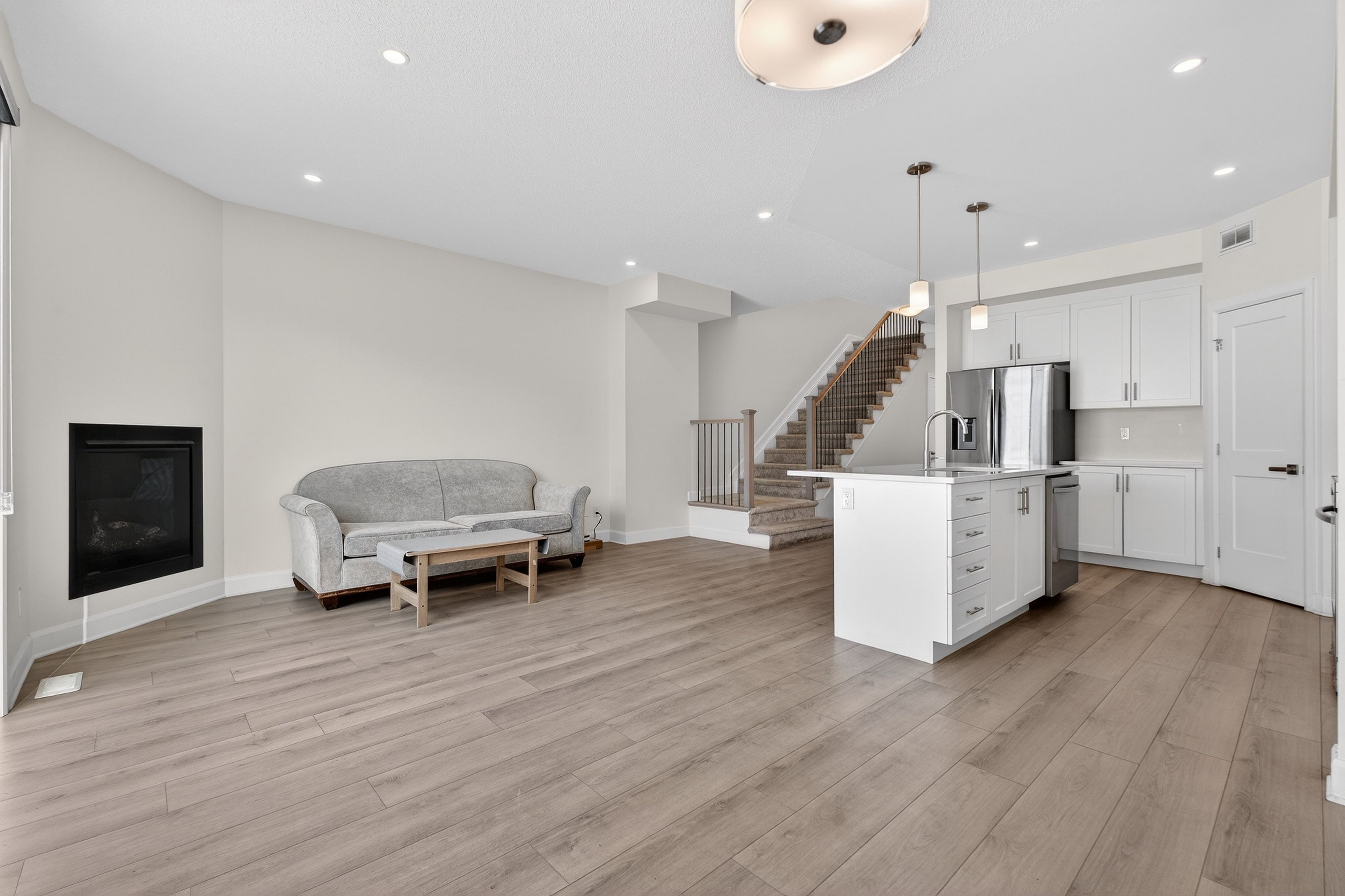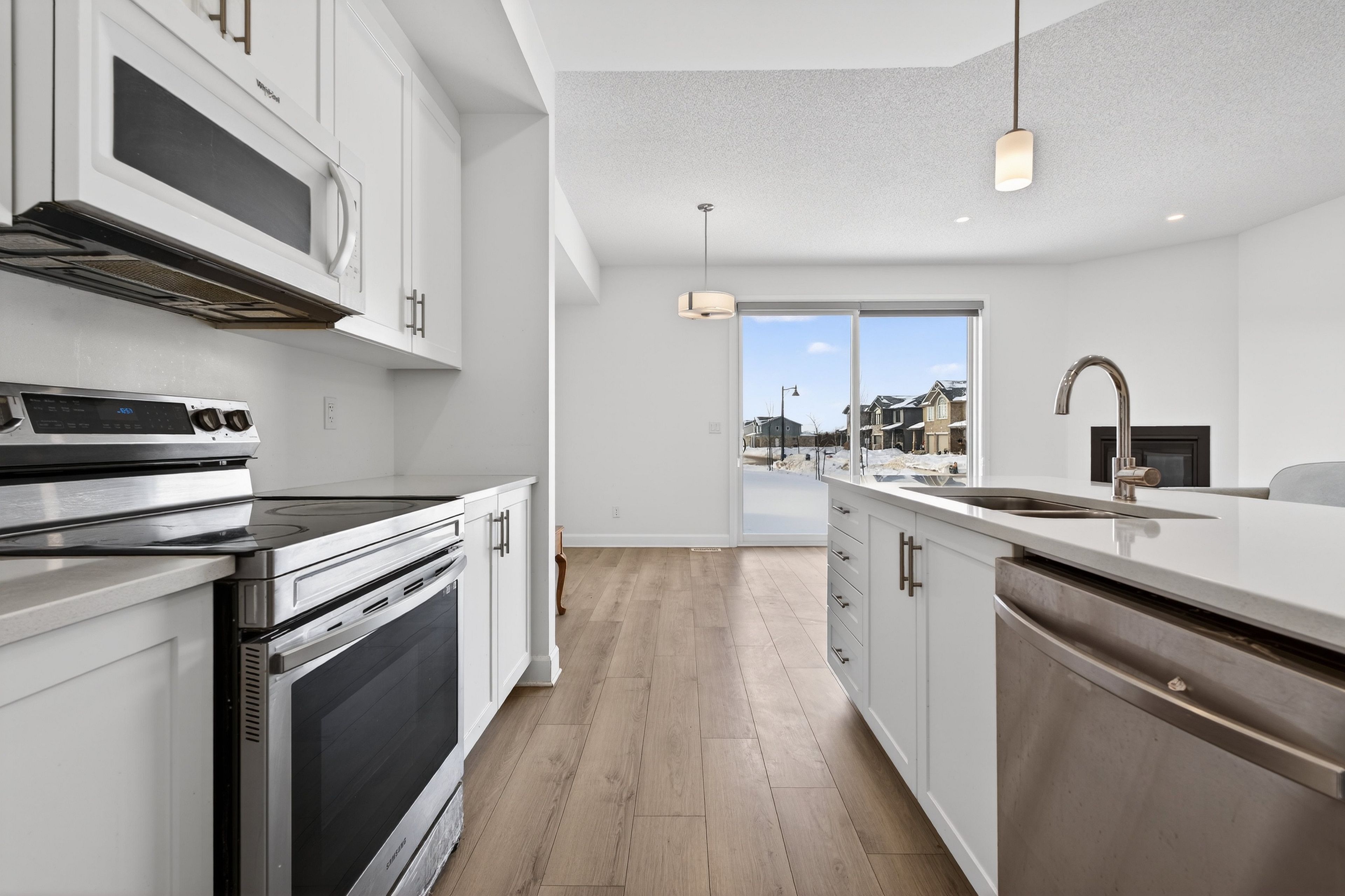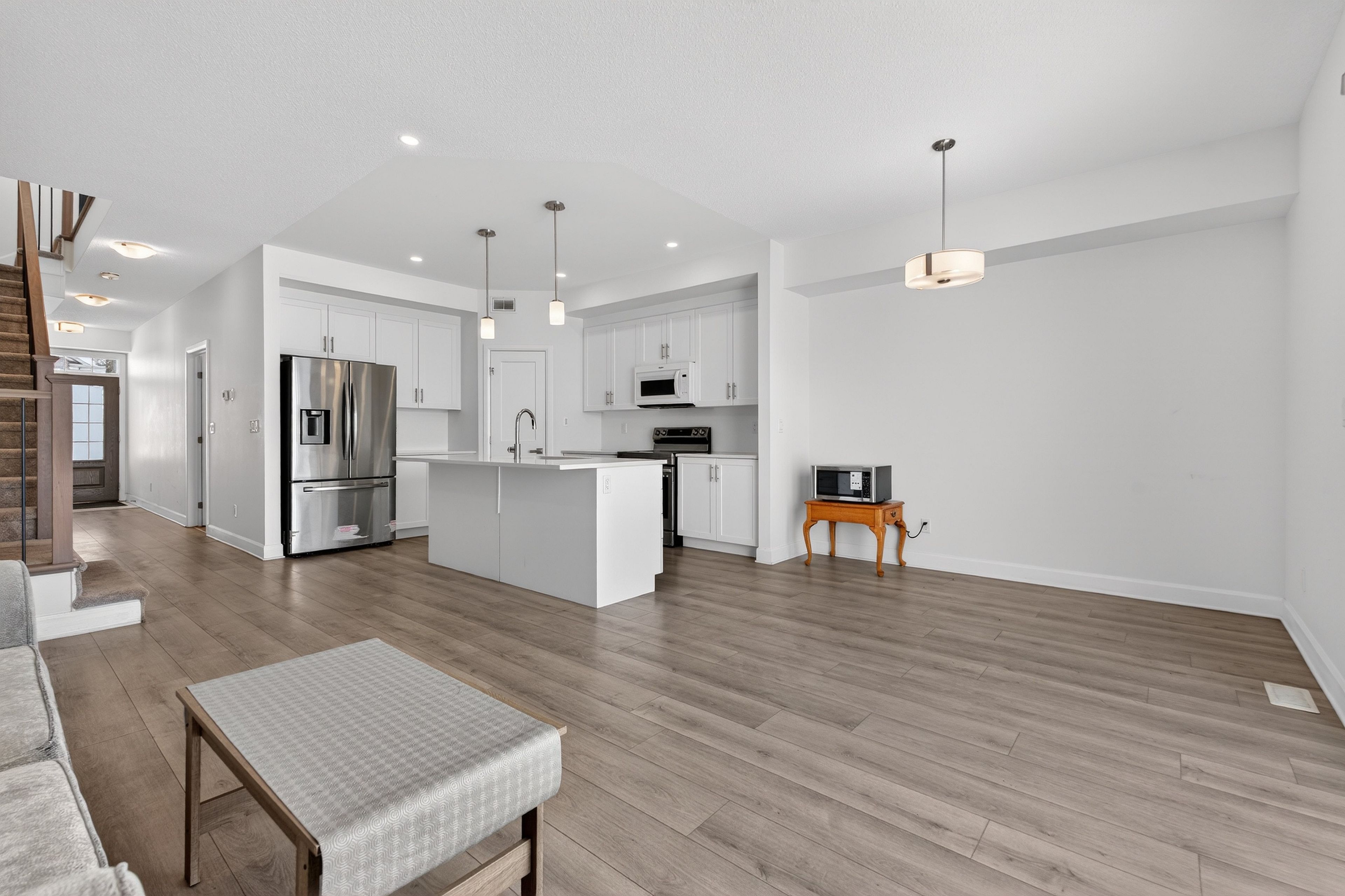 • Upgraded kitchen features a large island and quartz countertops.