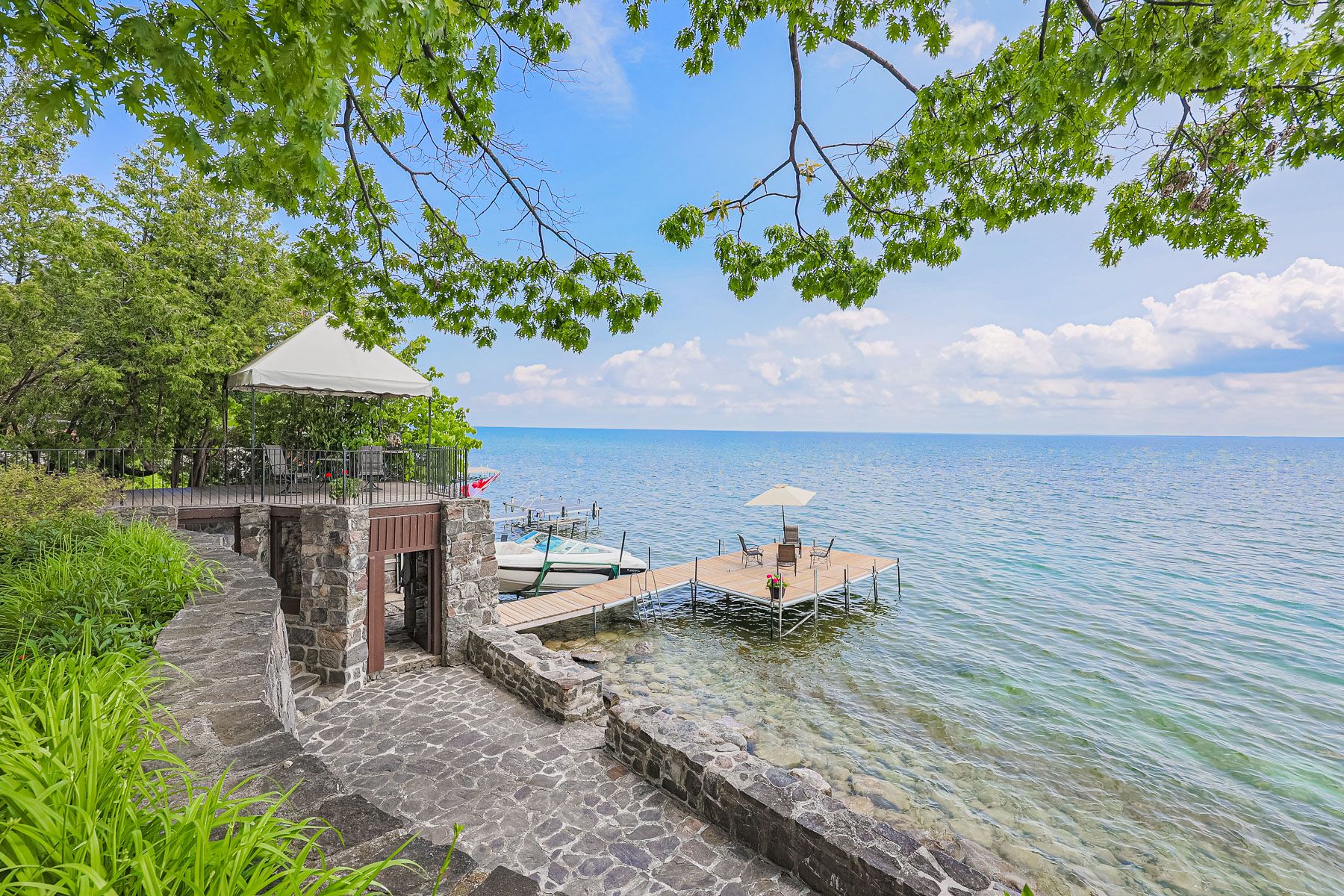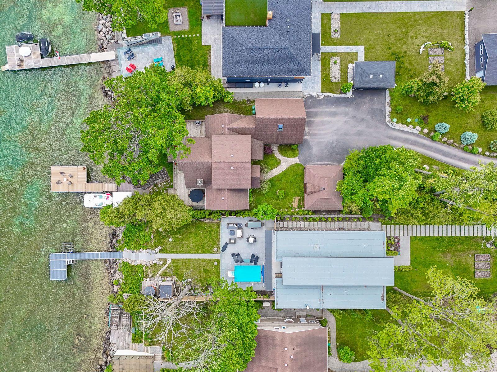 This exceptional 2011 custom-built home with over 3,000 sq ft of finished living space offers the perfect blend of modern luxury and classic cottage charm. Located just one hour north of toronto on a private road, this stunning property provides just shy of 75 feet of private shoreline and panoramic eastern views for unforgettable sunrises. Gaze out across the lake and catch sight of both fox and snake islands to the south. The waterfront is truly one-of-a-kind, featuring a beautifully crafted stone wall and patio that stretches across the entire frontage, creating an inviting space for entertaining, relaxing, or enjoying direct lake access - this is lakeside living at its finest. A custom-built boathouse with room for a 24-foot boat, a railway system, and a spacious dock make boating and waterfront activities effortless. Inside, the main floor is designed for comfort and connection, with an open-concept layout that includes a great room with a floor-to-ceiling stone wood-burning fireplace, a kitchen, and a main-floor primary bedroom that faces the water. Walk out to the expansive deck for seamless indoor-outdoor living. Upstairs, two more bedrooms and a full bath offer space for family or guests. The fully finished basement adds two additional bedrooms, a full bathroom, and a generous rec room perfect for movie nights, games, or cozy winter gatherings. An attached two-car garage provides direct access to the home, and above it, a partially finished bonus room offers additional square footage for a studio, office, or playroom. Outside, a paved driveway and a second detached two-car garage offer even more storage for recreational gear and vehicles. Low-maintenance landscaping means more time enjoying the lake and less time on upkeep. Whether you're looking for a summer escape or a four-season home, this property delivers the lifestyle you've been waiting for on beautiful lake simcoe.