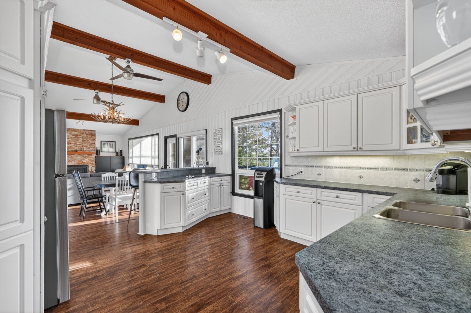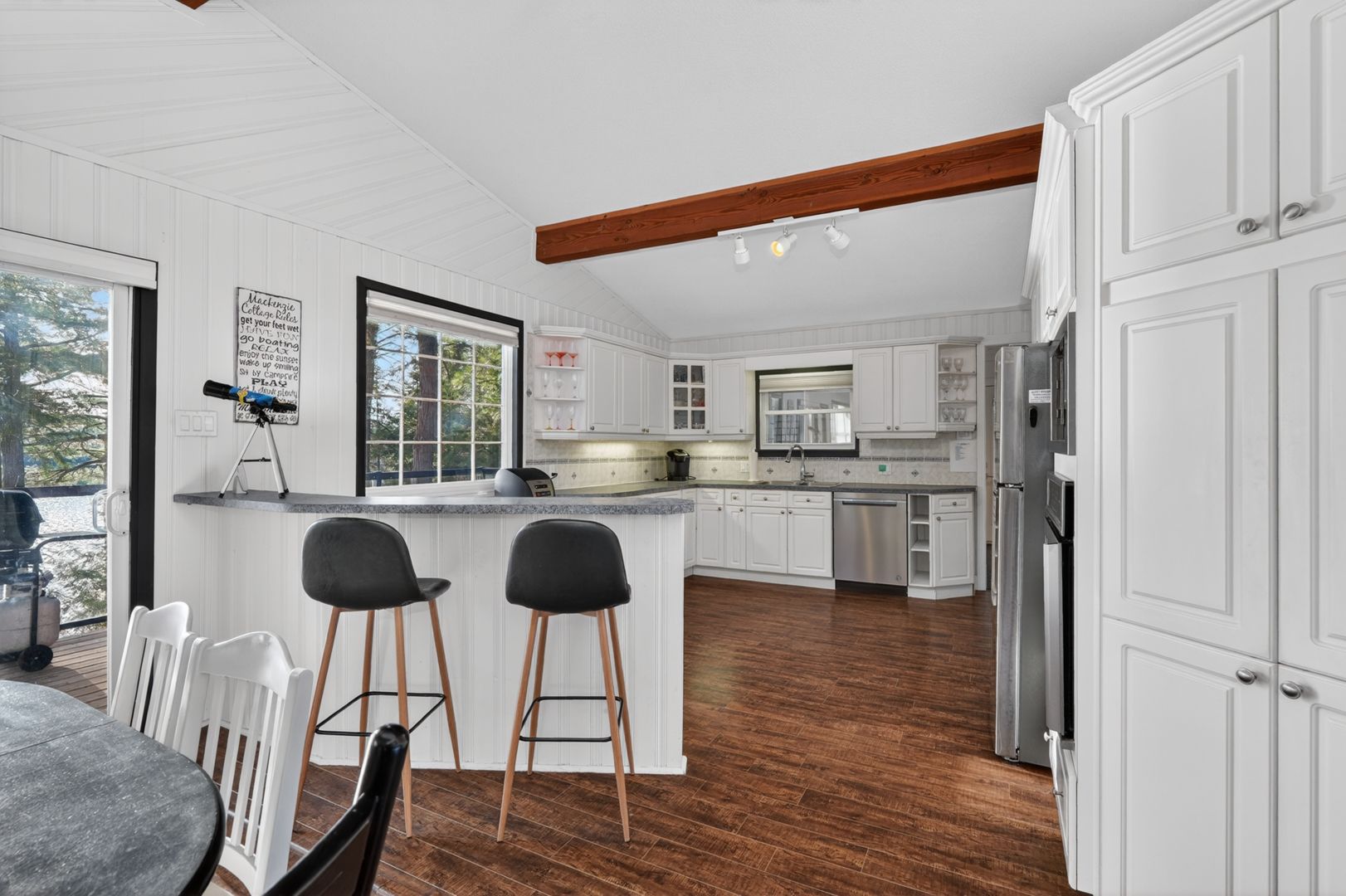 Absolutely breathtaking panoramic sunset views of sought after three mile lake. This deep clean healthy lake is one of the nicest in the almaguin area. This very attractive 3 bedroom, 2 bathroom year round home or cottage is a pleasure to view! Open concept kitchen, dining and living room all have spectacular view of the lake. Spacious and sunlit interior with up to the minute decor featuring ship lap, vaulted ceilings with exposed wood beams, propane fireplace, wood floors. Kitchen has ample cabinet space as well as a breakfast counter with seating. Dining is great for entertaining and living room is large enough for family movie nights and relaxing by the fireplace. 3 bedrooms including an ensuite priviledge to a newer 3 piece bathroom that includes glass shower. Family room area which has multi-uses as a 4th sleeping area with murphy bed (included) or can be repurposed to a family room, play area, you choose. The main 4 piece has been renovated and is very attractive. There is main level laundry in a closet. A quintessential muskoka room overlooking the lake accessed from glass patio door is a great 3 season space to enjoy the outdoors even when it is raining. The crawl space is clean and dry and houses the furnace and is a great storage area. Central air, generator, bunkie for the kids, single car garage with side shed for your toys. A newer shed close to the recreational residence plus a shed at the water's edge for your paddles, life jackets and potentially a fridge. The dock is large and spans along the lakefront so provides ample area for lounging as well as boat docking. The lakefront is gorgeous with rock and pines reminiscent of a group of 7 painting. Steps to the lake with a half way deck for another area to sit and read, have your morning coffee or your glass of wine in complete quiet and privacy from everyone. Firepit patio. Comes equipped and ready to enjoy. There is also a portable garage close to the road to store more toys.