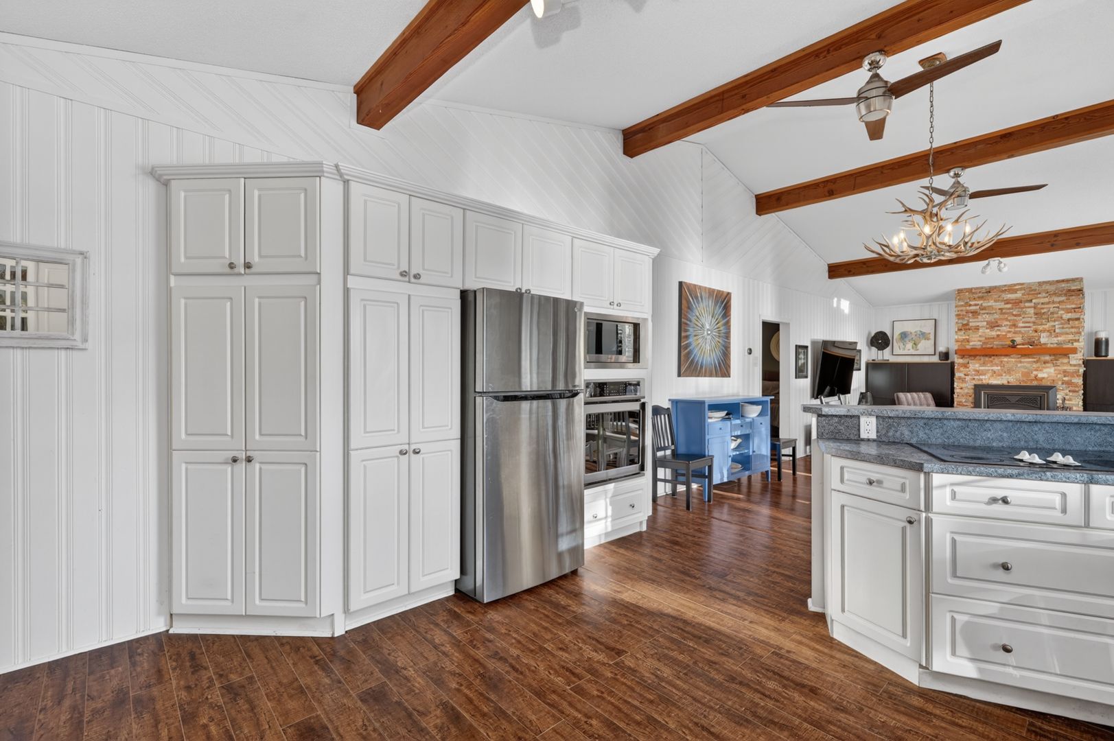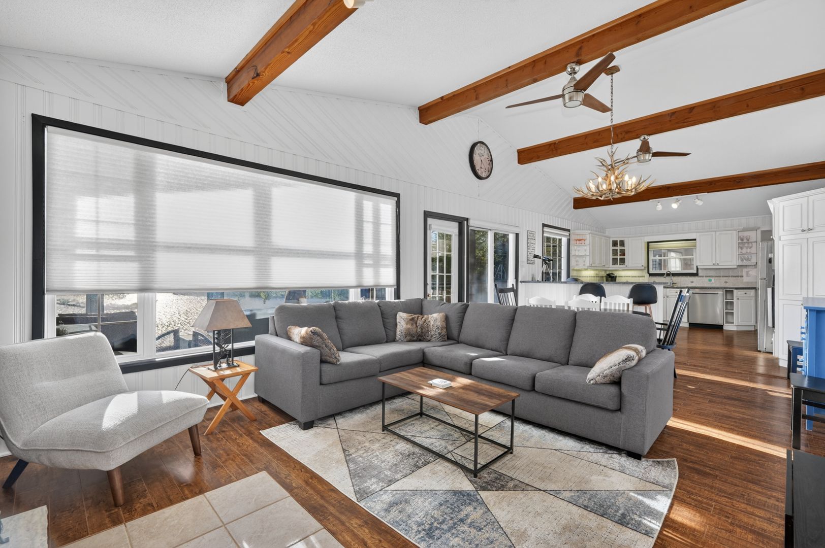 • Open concept layout with a spacious kitchen, dining, and living area.