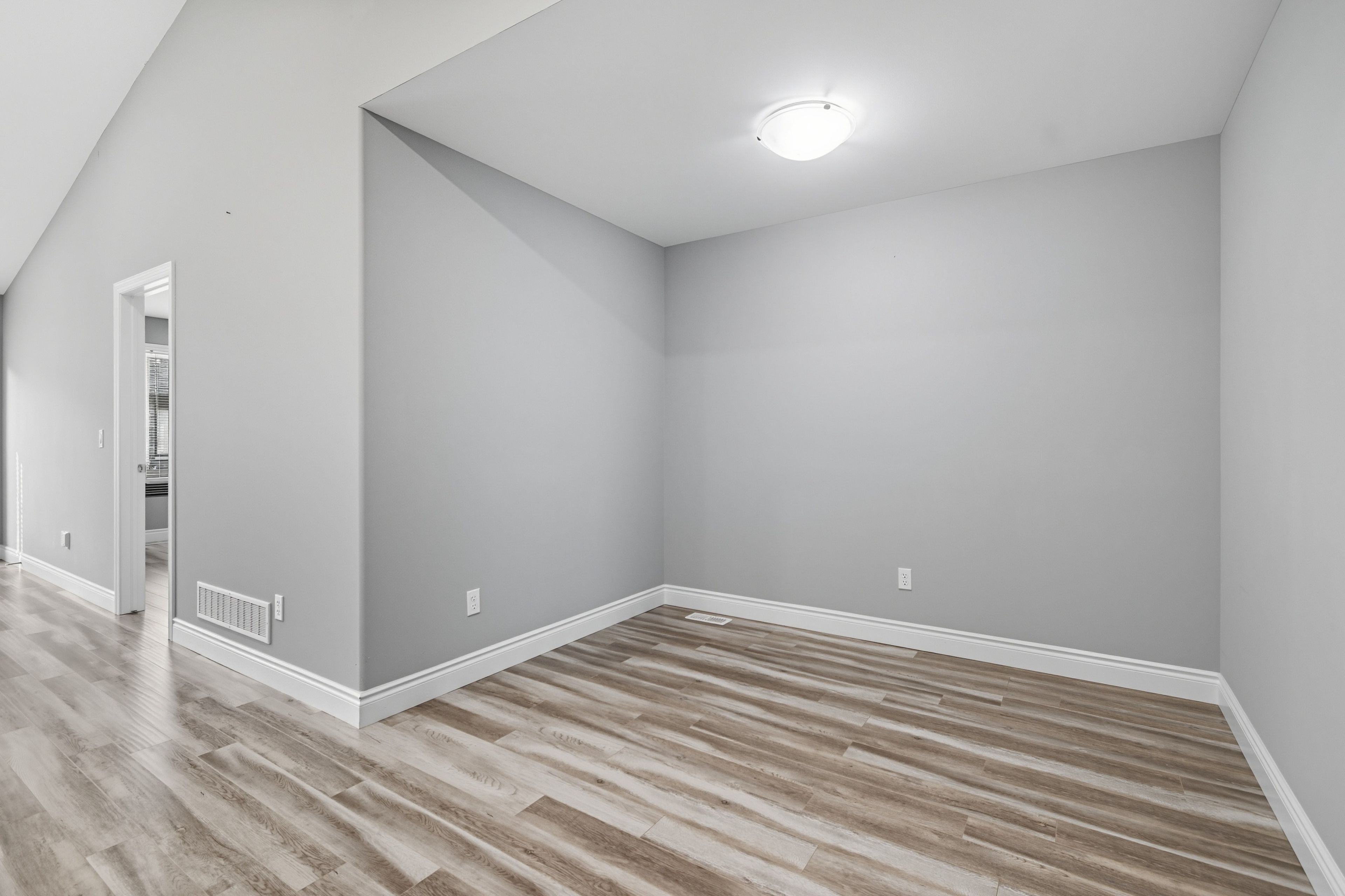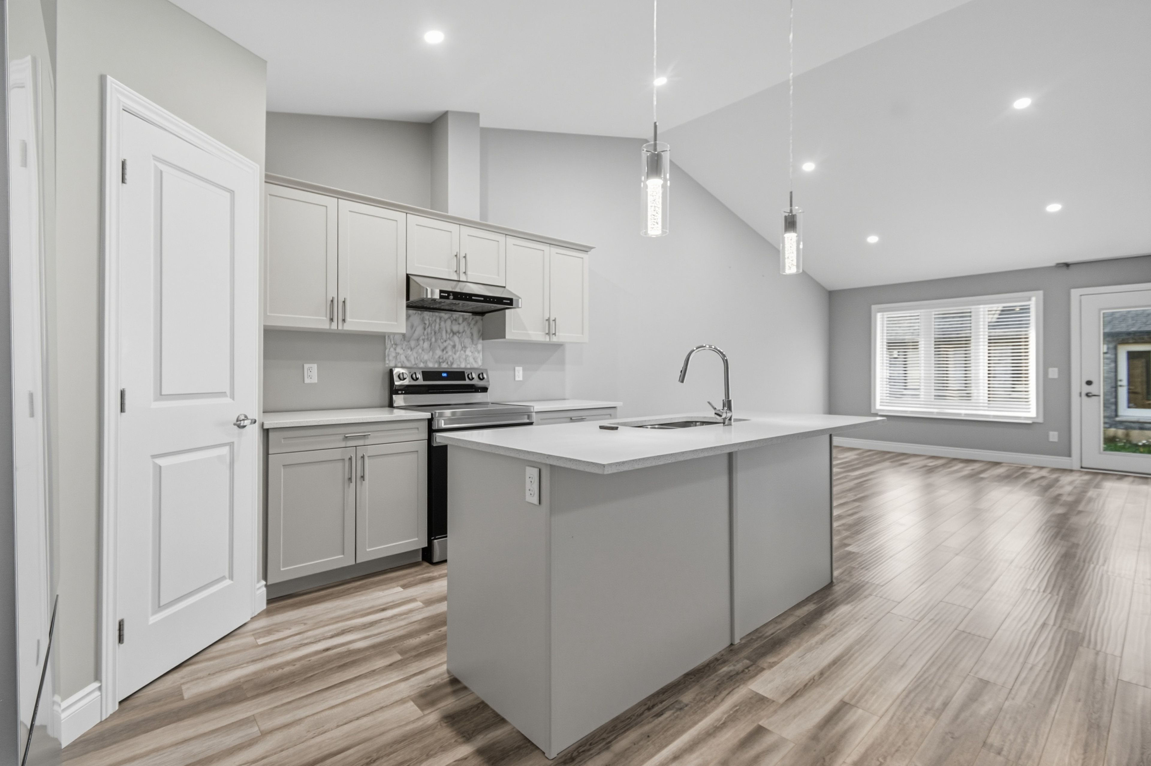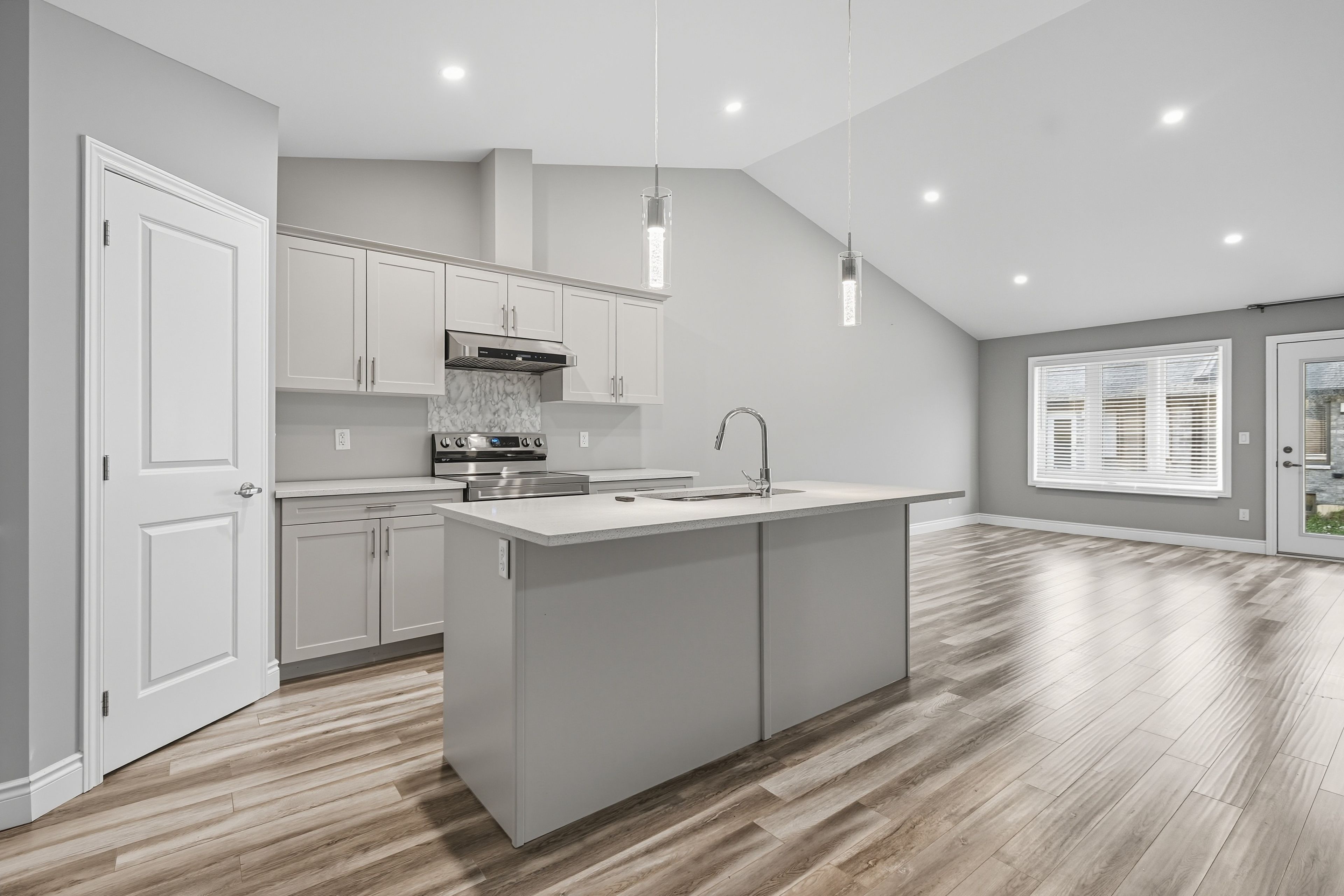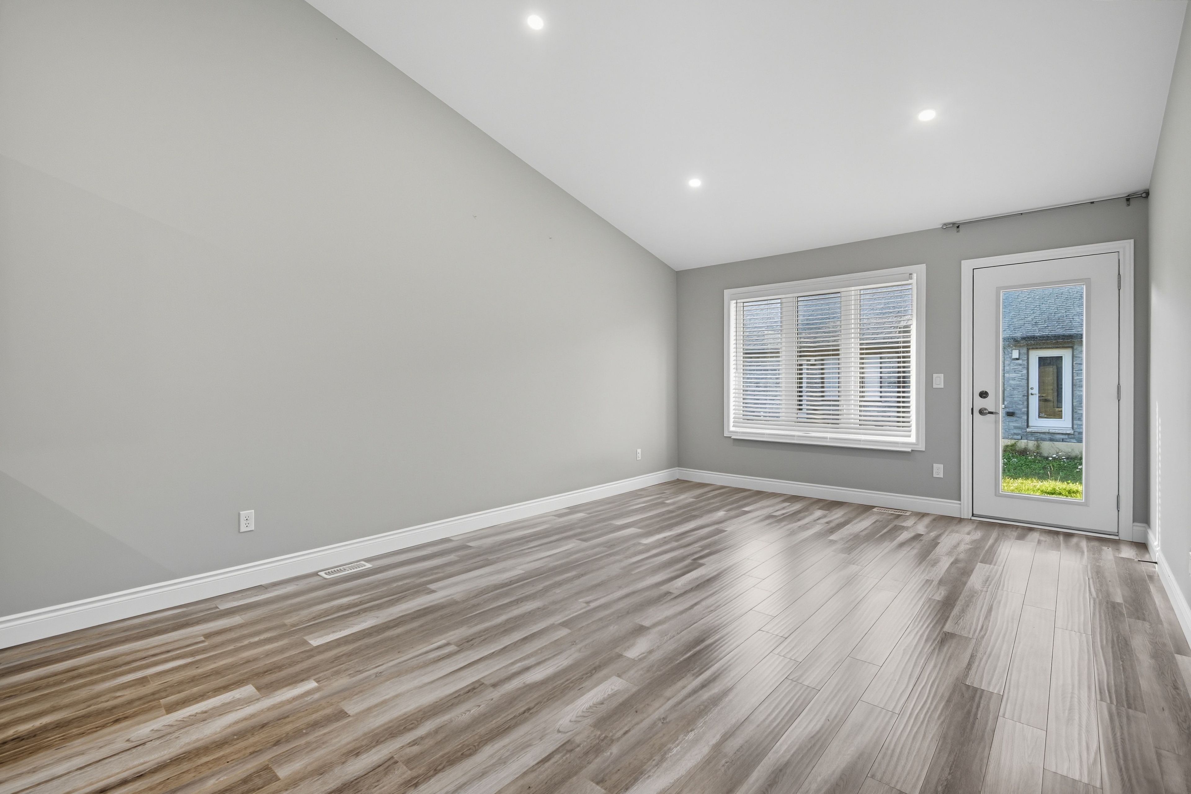 • Bright living room with a vaulted ceiling enhances the airy feel.