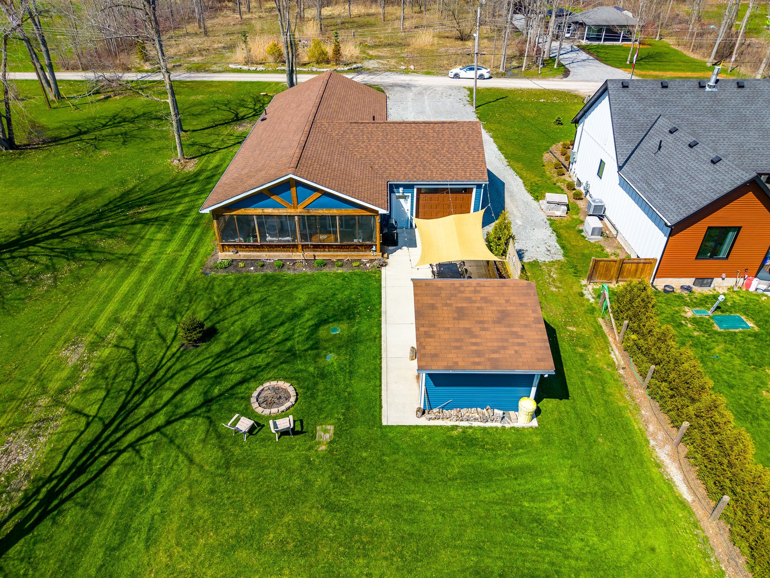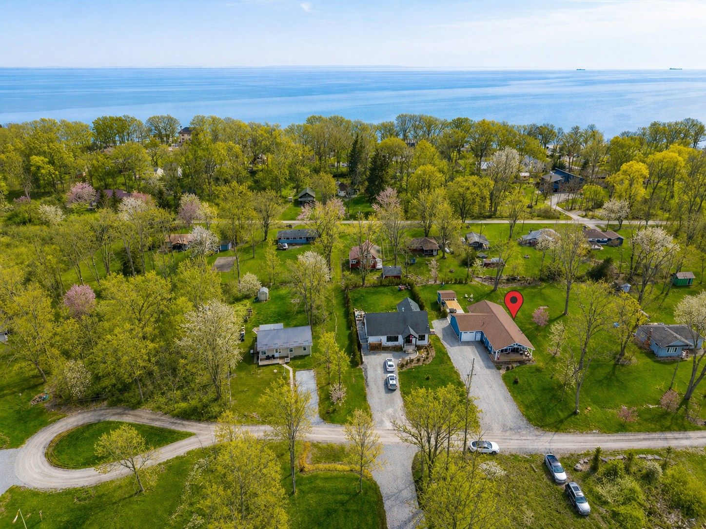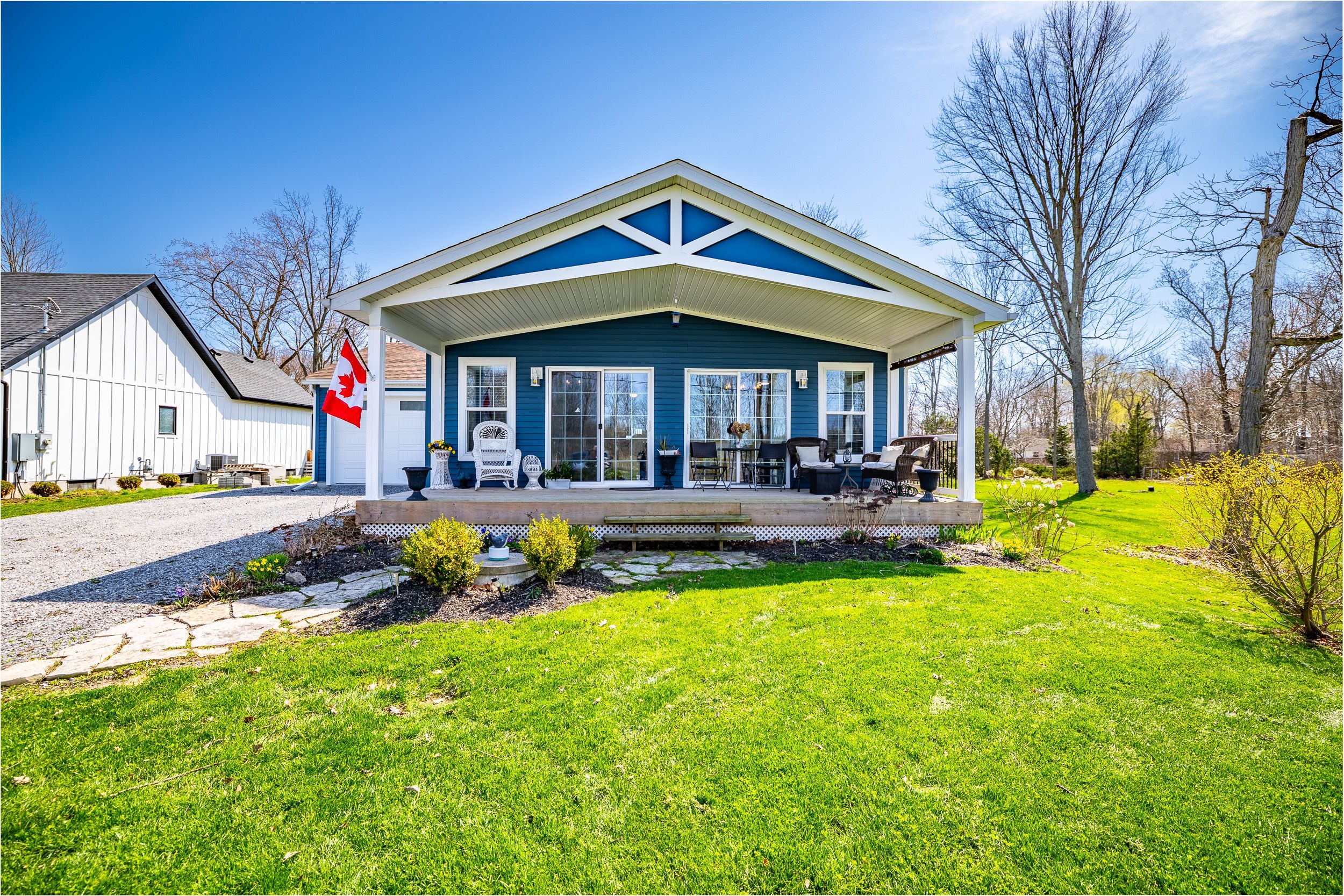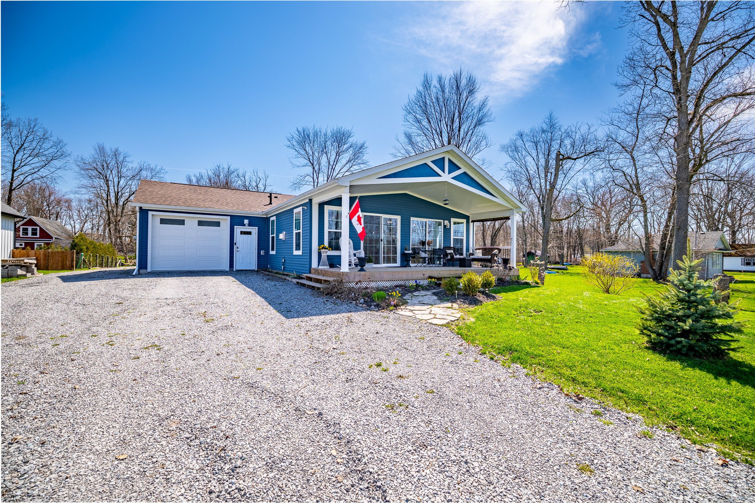Relaxed lakeside living in the heart of niagara's wine & golf country. Welcome to silver bay, a sought-after community along the shores of lake erie, where beach days, sunsets, and easy living define the lifestyle. This 6-year-old bungalow offers a deeded access to a private sandy beach, just a short stroll down a scenic, tree-lined sand path. Set on a generous quarter-acre lot, the home welcomes you with a spacious covered front porch showcasing post & beam-inspired design - an ideal place to unwind and take in the evening air. Inside, thoughtfully designed open living space blends a warm and summer vibe. Double sliding doors extend the living area to the front sitting porch, enhancing seamless indoor-outdoor flow. The open-concept layout features a cozy gas fireplace and a stylish white kitchen with a centre wood plank island, adding a touch of rustic charm - perfect for entertaining and gatherings alike. At the rear of the home, an expansive screened-in room off the primary bedroom creates a peaceful extension of the home-ideal for summer evenings and morning long coffees. The main floor offers a primary suite which includes a walk-in closet, 4-piece ensuite, and direct access to the screened-in rear room. The main floor also boasts 2 extra bedrooms for family and fiends overnight stays. One is currently set up as an office. The partially finished lower level adds versatility with recreational space and bedroom space - yours to define. A 3-piece bathroom is all finished. Outside, enjoy a large concrete patio with sun sail, landscaped gardens, raised beds, and a timed irrigation system. A matching shed with power and lighting adds convenience. The insulated, heated garage features a drive through front and rear doors for easy access or workshop use. Additional features include seasonal silver bay water, a 5,500-gallon cistern, generator-ready hookup, and bell fibe. A turnkey opportunity to enjoy the best of niagara's relaxed, beachside lifestyle.