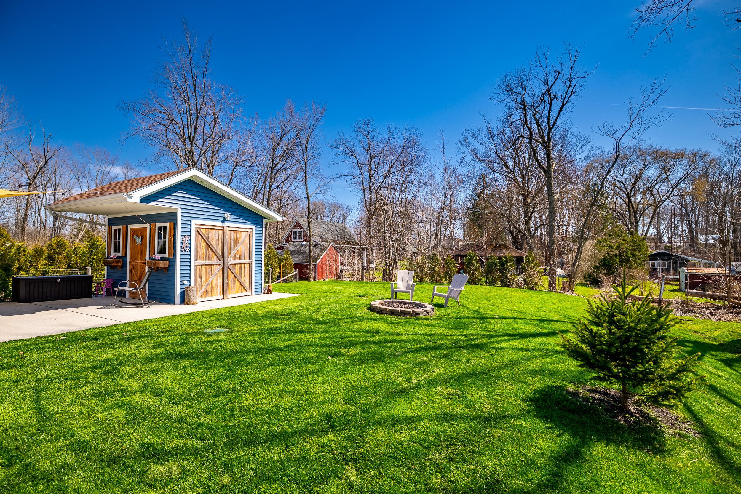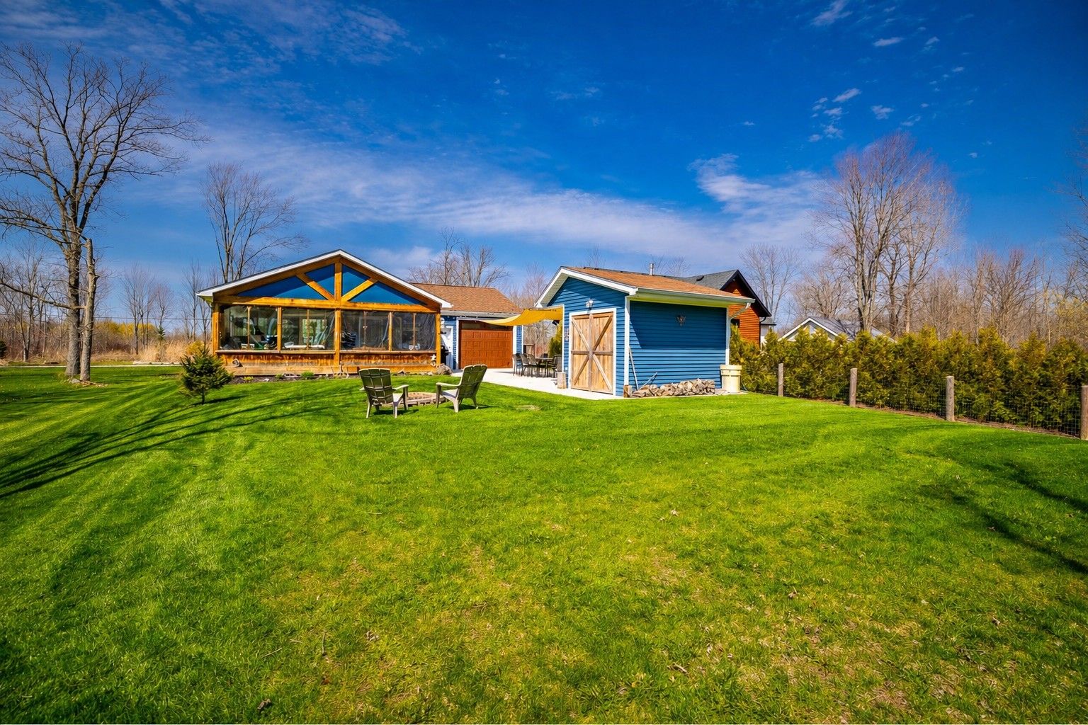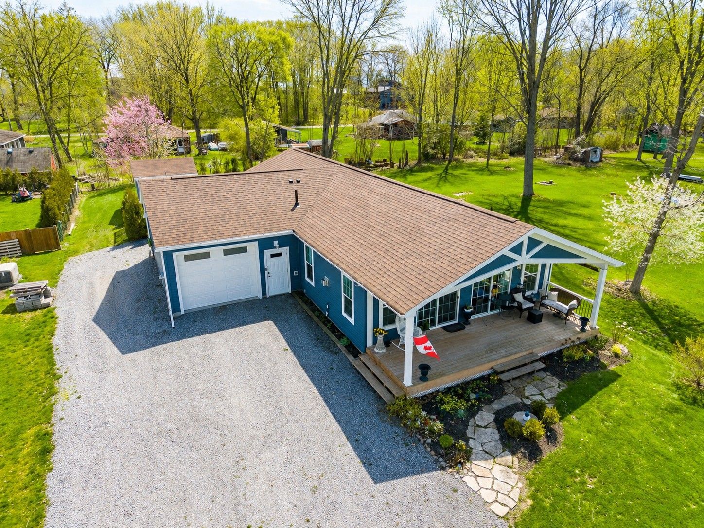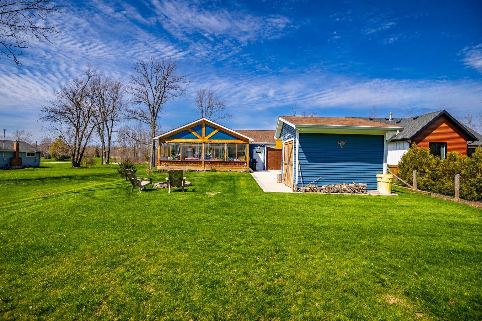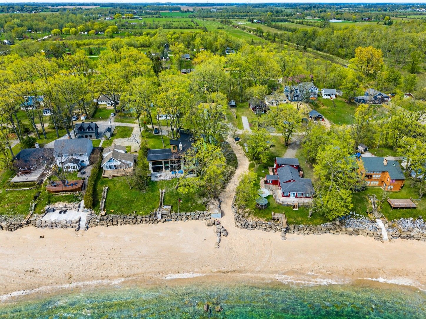 Relaxed lakeside living in the heart of niagara's wine & golf country. Welcome to silver bay, a sought-after community along the shores of lake erie, where beach days, sunsets, and easy living define the lifestyle. This 6-year-old bungalow offers a deeded access to a private sandy beach, just a short stroll down a scenic, tree-lined sand path. Set on a generous quarter-acre lot, the home welcomes you with a spacious covered front porch showcasing post & beam-inspired design - an ideal place to unwind and take in the evening air. Inside, thoughtfully designed open living space blends a warm and summer vibe. Double sliding doors extend the living area to the front sitting porch, enhancing seamless indoor-outdoor flow. The open-concept layout features a cozy gas fireplace and a stylish white kitchen with a centre wood plank island, adding a touch of rustic charm - perfect for entertaining and gatherings alike. At the rear of the home, an expansive screened-in room off the primary bedroom creates a peaceful extension of the home-ideal for summer evenings and morning long coffees. The main floor offers a primary suite which includes a walk-in closet, 4-piece ensuite, and direct access to the screened-in rear room. The main floor also boasts 2 extra bedrooms for family and fiends overnight stays. One is currently set up as an office. The partially finished lower level adds versatility with recreational space and bedroom space - yours to define. A 3-piece bathroom is all finished. Outside, enjoy a large concrete patio with sun sail, landscaped gardens, raised beds, and a timed irrigation system. A matching shed with power and lighting adds convenience. The insulated, heated garage features a drive through front and rear doors for easy access or workshop use. Additional features include seasonal silver bay water, a 5,500-gallon cistern, generator-ready hookup, and bell fibe. A turnkey opportunity to enjoy the best of niagara's relaxed, beachside lifestyle.