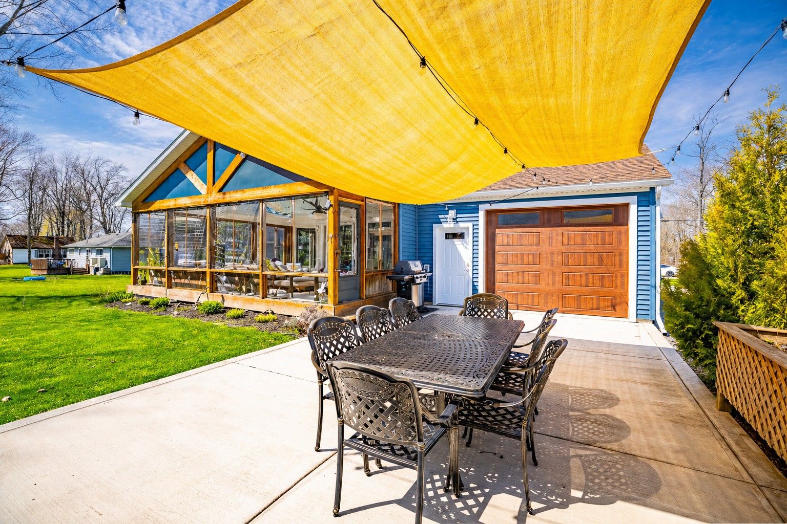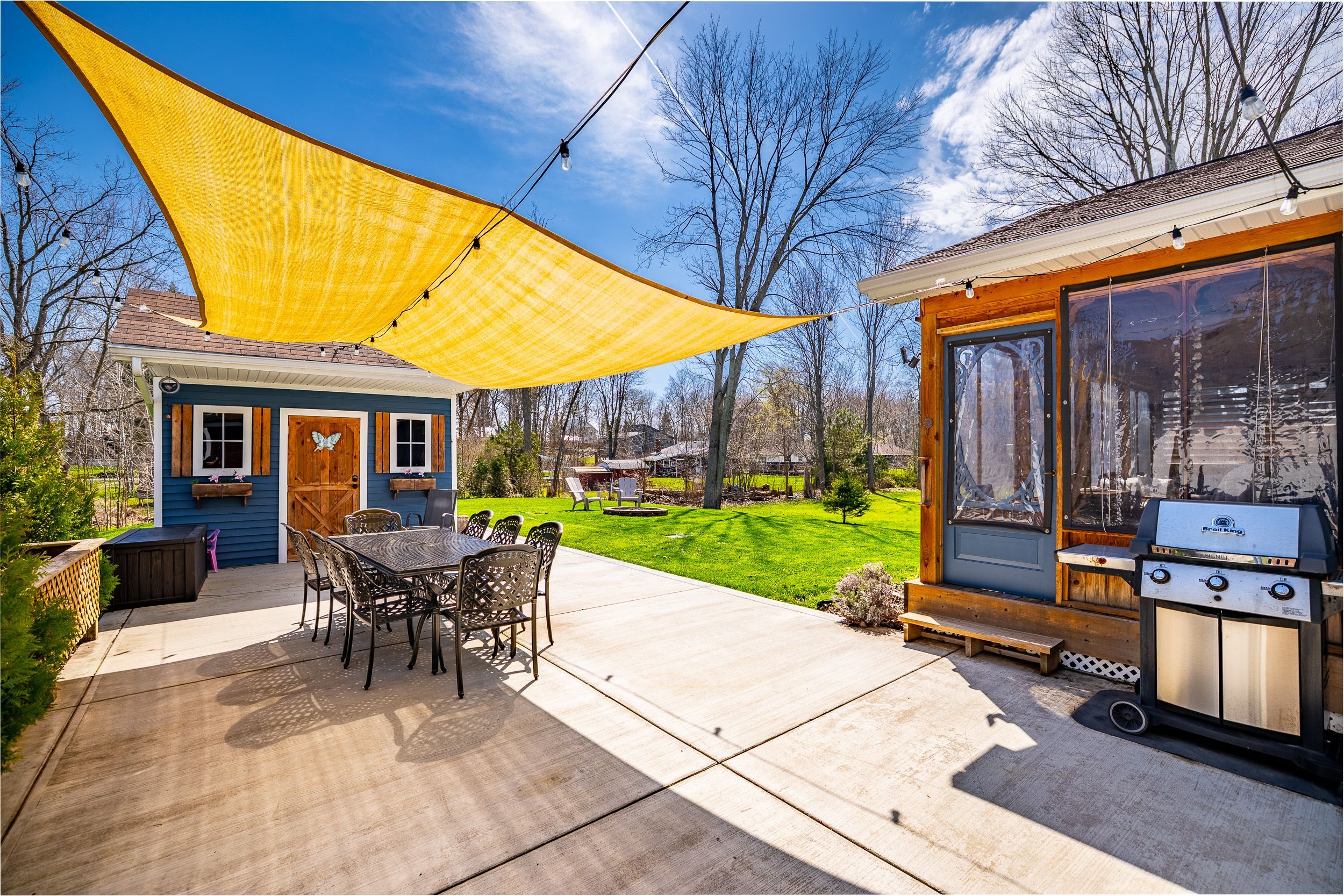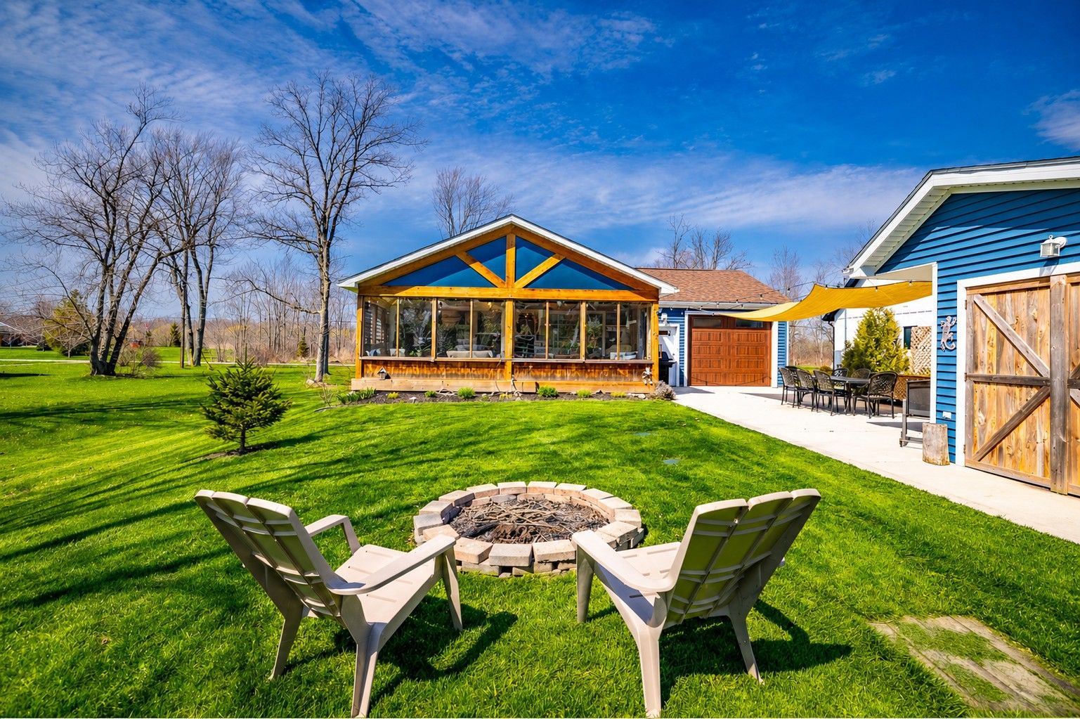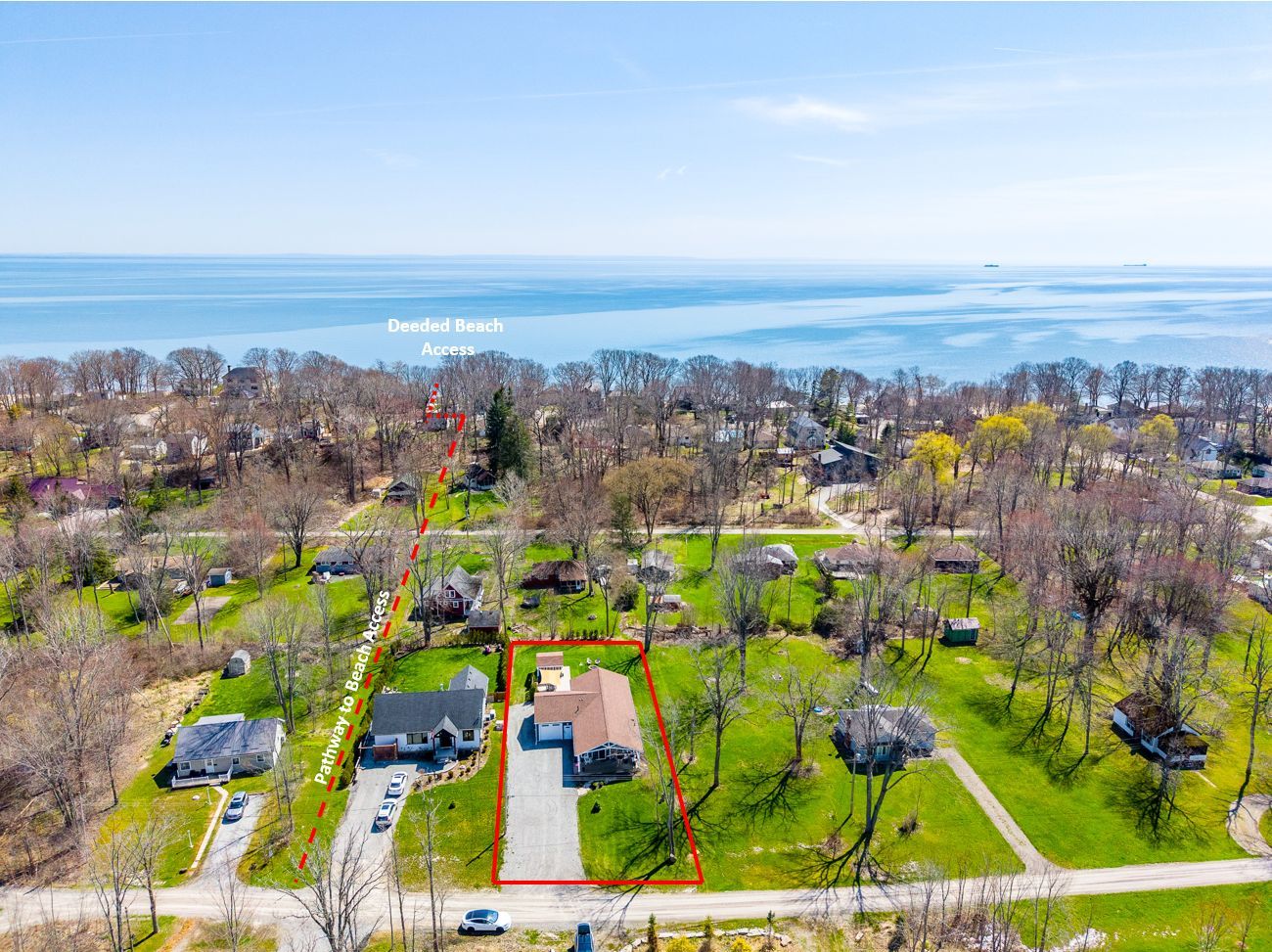 Relaxed lakeside living in the heart of niagara's wine & golf country. Welcome to silver bay, a sought-after community along the shores of lake erie, where beach days, sunsets, and easy living define the lifestyle. This 6-year-old bungalow offers a deeded access to a private sandy beach, just a short stroll down a scenic, tree-lined sand path. Set on a generous quarter-acre lot, the home welcomes you with a spacious covered front porch showcasing post & beam-inspired design - an ideal place to unwind and take in the evening air. Inside, thoughtfully designed open living space blends a warm and summer vibe. Double sliding doors extend the living area to the front sitting porch, enhancing seamless indoor-outdoor flow. The open-concept layout features a cozy gas fireplace and a stylish white kitchen with a centre wood plank island, adding a touch of rustic charm - perfect for entertaining and gatherings alike. At the rear of the home, an expansive screened-in room off the primary bedroom creates a peaceful extension of the home-ideal for summer evenings and morning long coffees. The main floor offers a primary suite which includes a walk-in closet, 4-piece ensuite, and direct access to the screened-in rear room. The main floor also boasts 2 extra bedrooms for family and fiends overnight stays. One is currently set up as an office. The partially finished lower level adds versatility with recreational space and bedroom space - yours to define. A 3-piece bathroom is all finished. Outside, enjoy a large concrete patio with sun sail, landscaped gardens, raised beds, and a timed irrigation system. A matching shed with power and lighting adds convenience. The insulated, heated garage features a drive through front and rear doors for easy access or workshop use. Additional features include seasonal silver bay water, a 5,500-gallon cistern, generator-ready hookup, and bell fibe. A turnkey opportunity to enjoy the best of niagara's relaxed, beachside lifestyle.