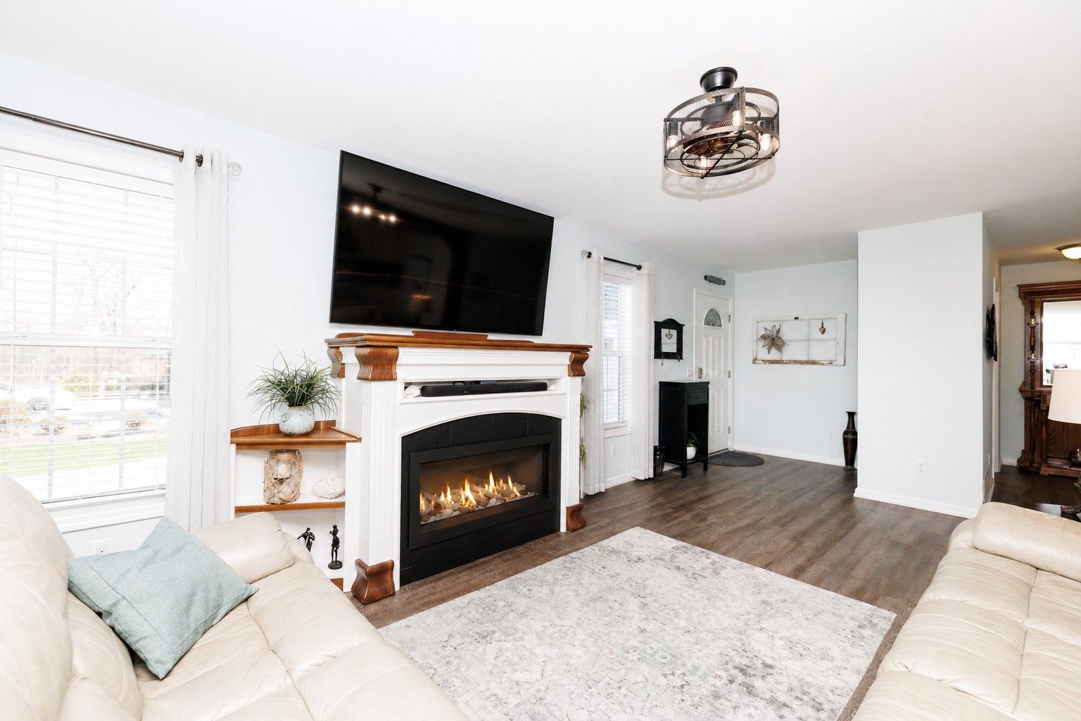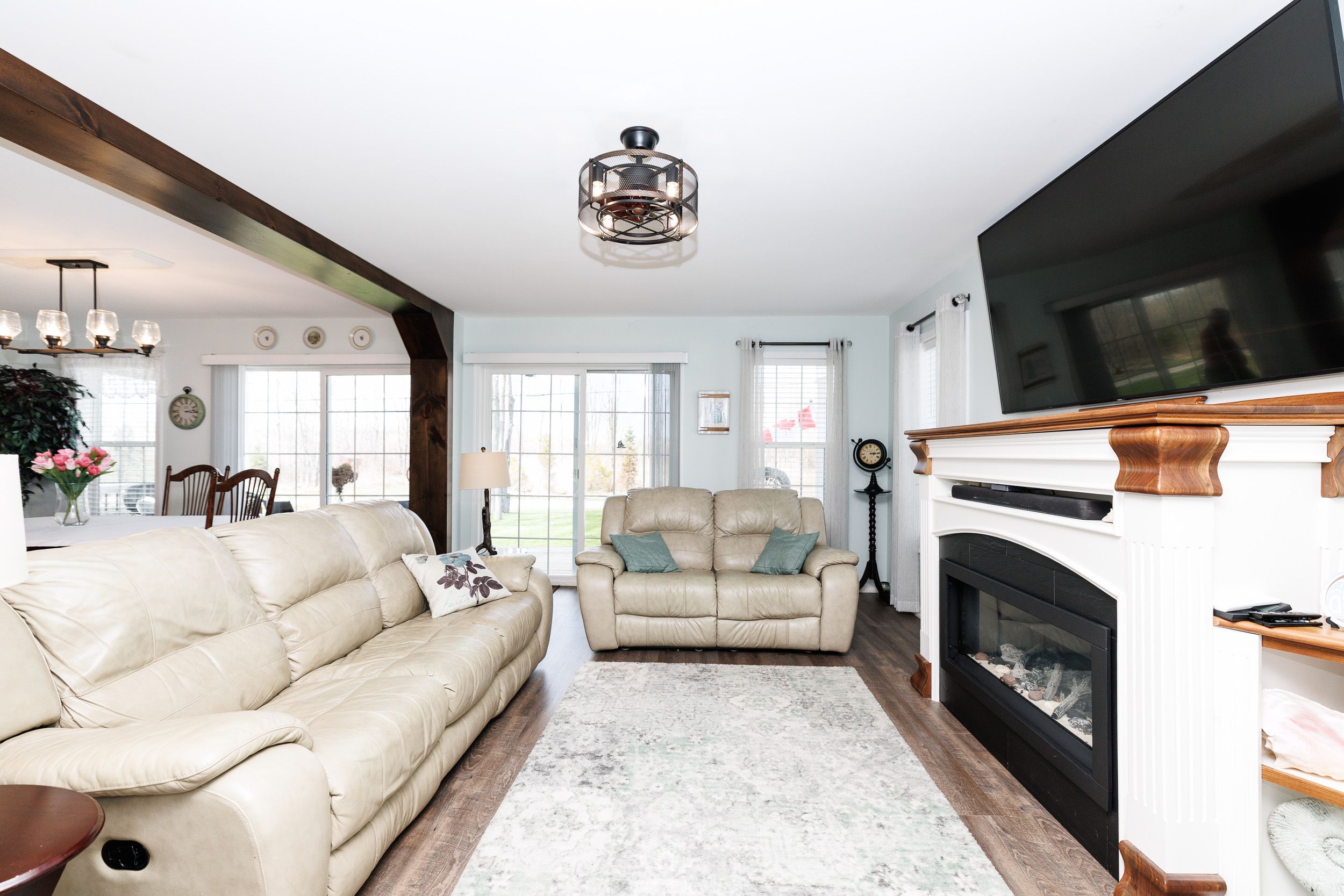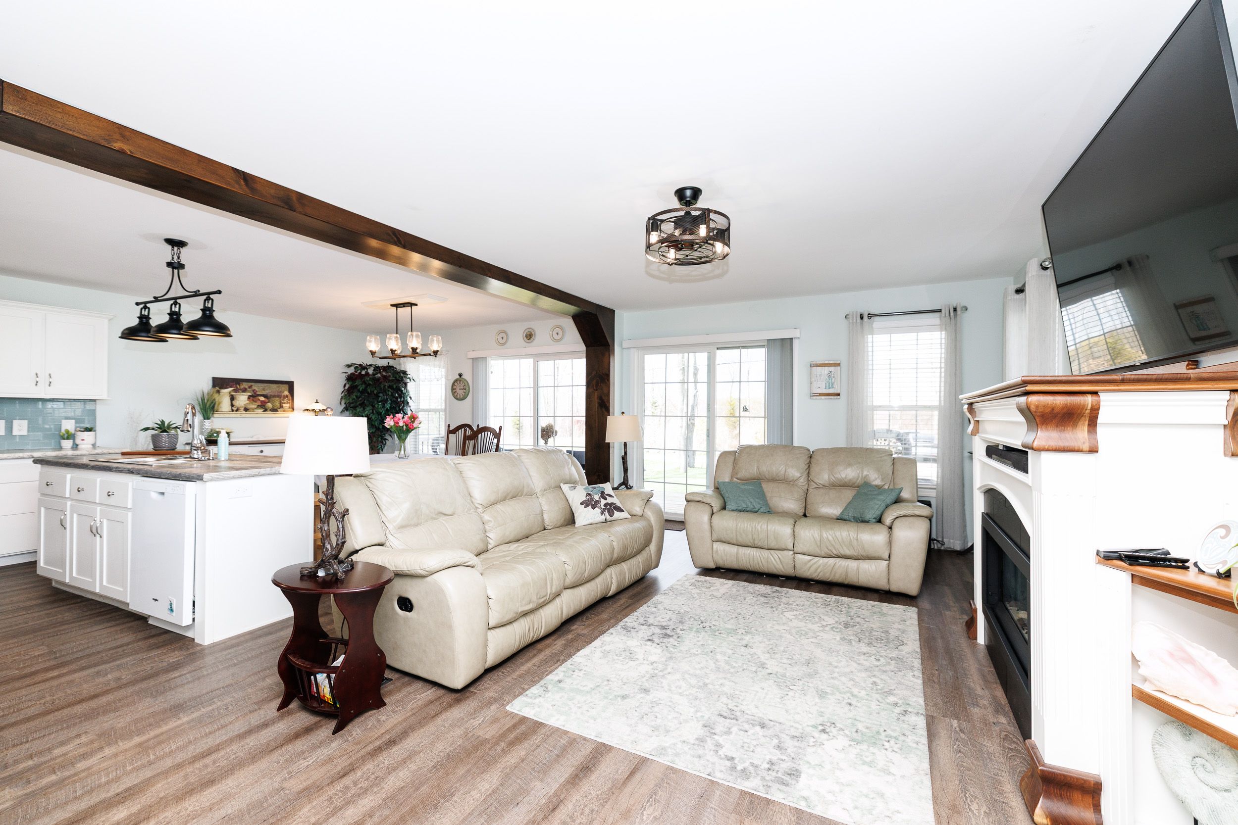 • Open-concept layout with a cozy gas fireplace and stylish kitchen.