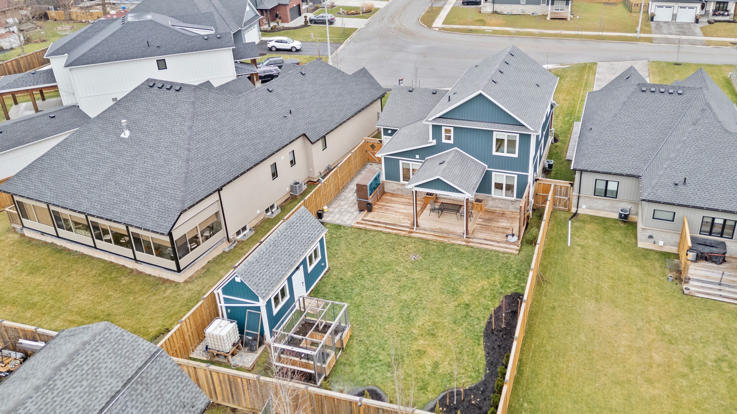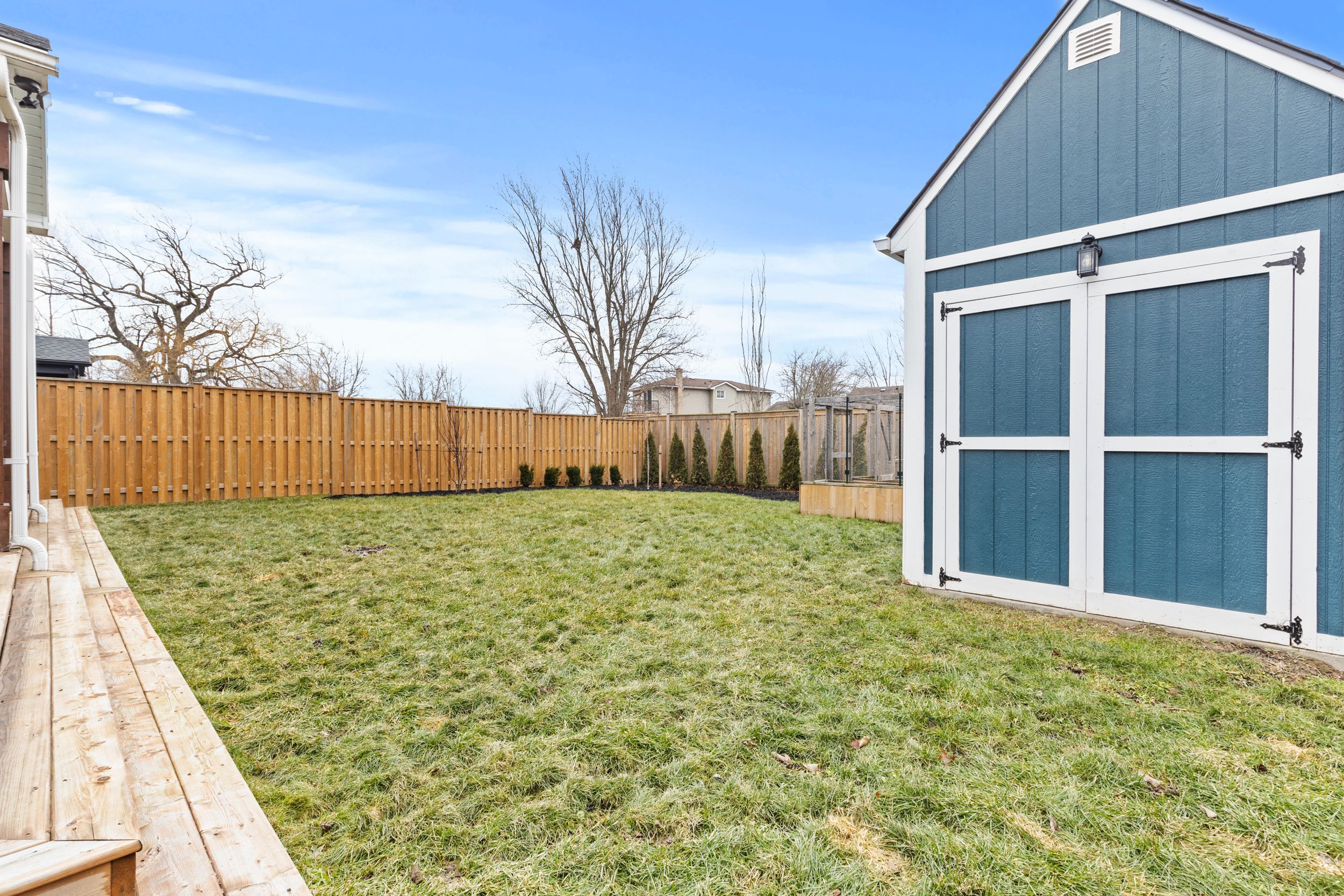 • Fully fenced backyard with large deck, shed, and vegetable garden.