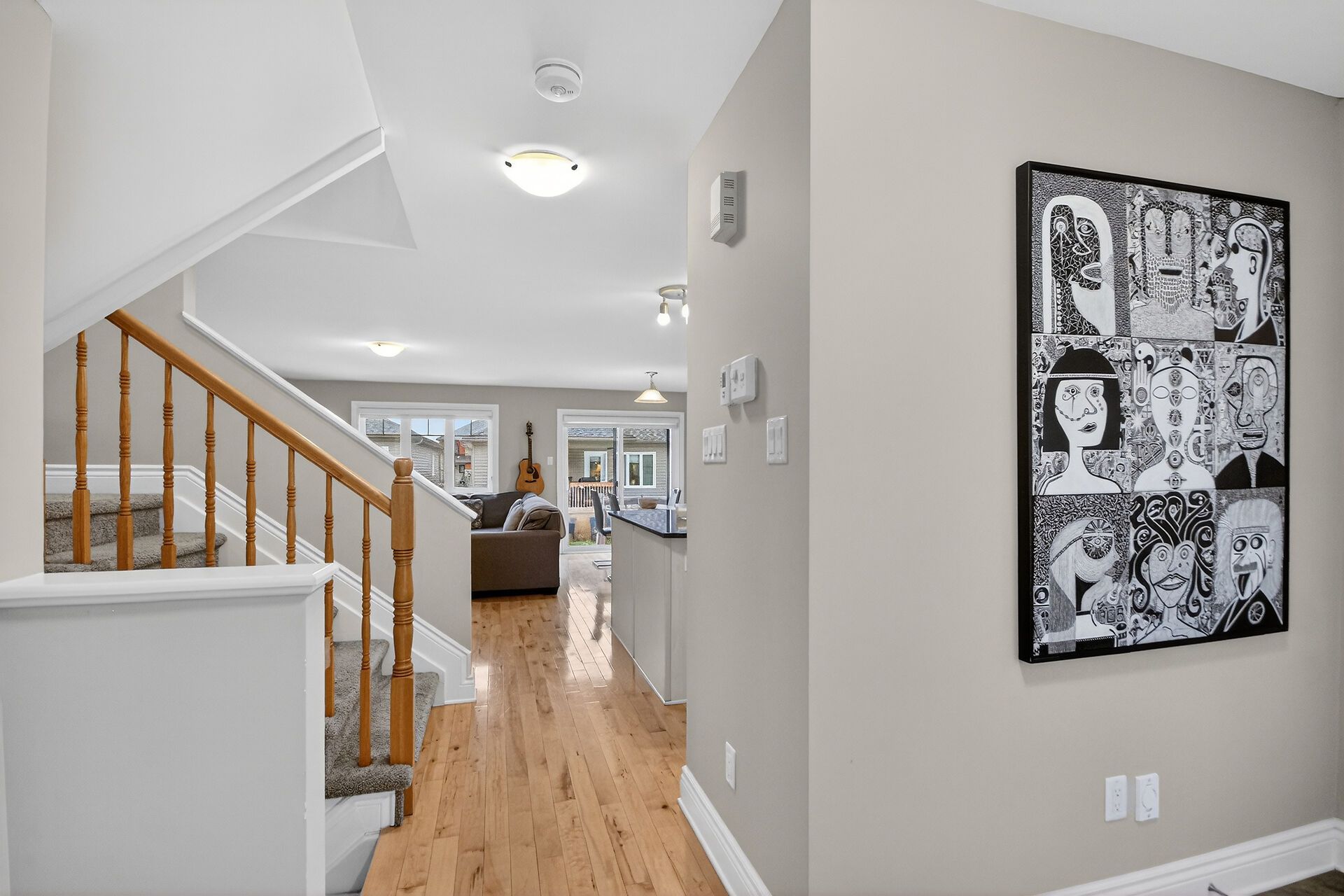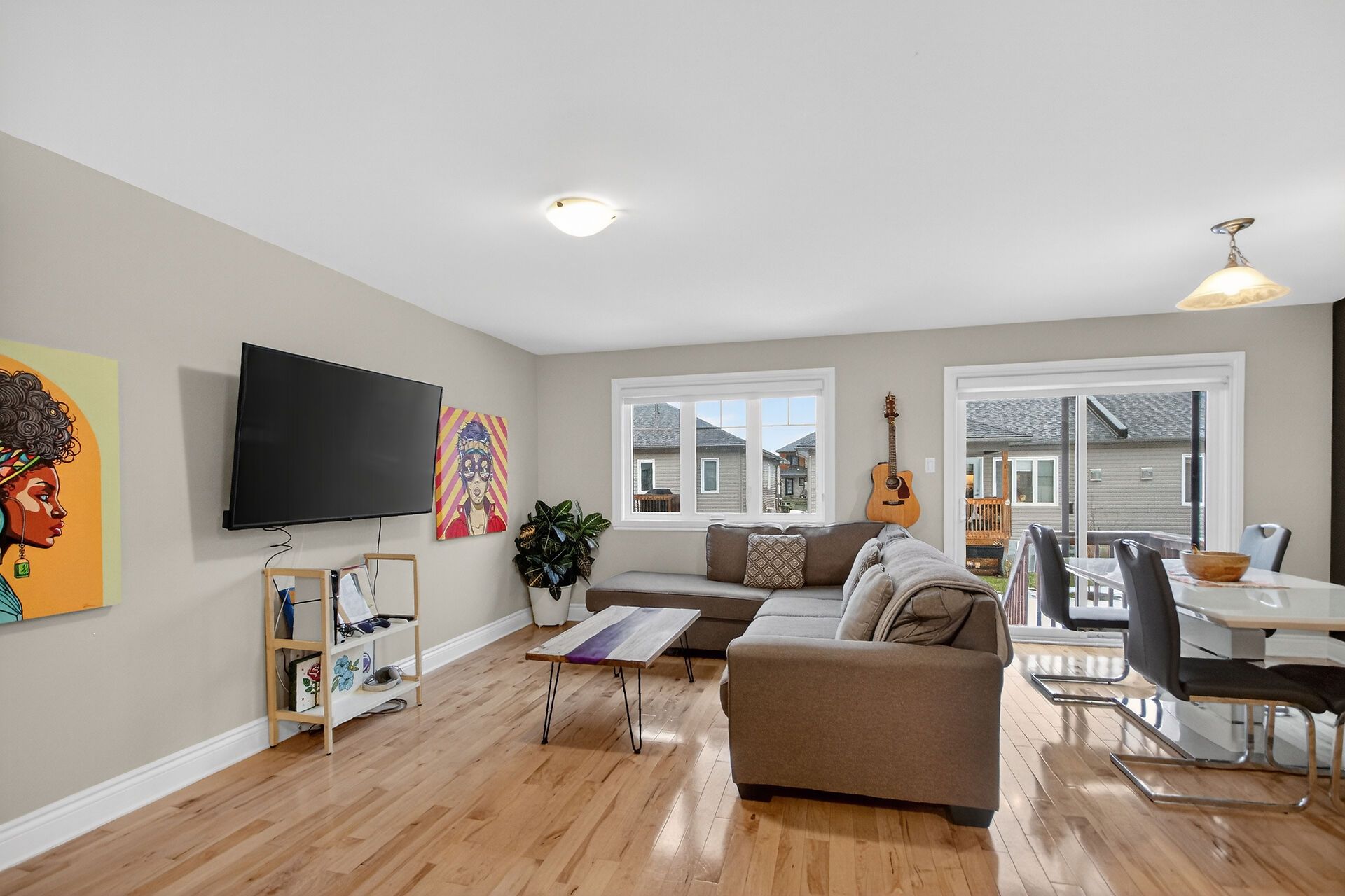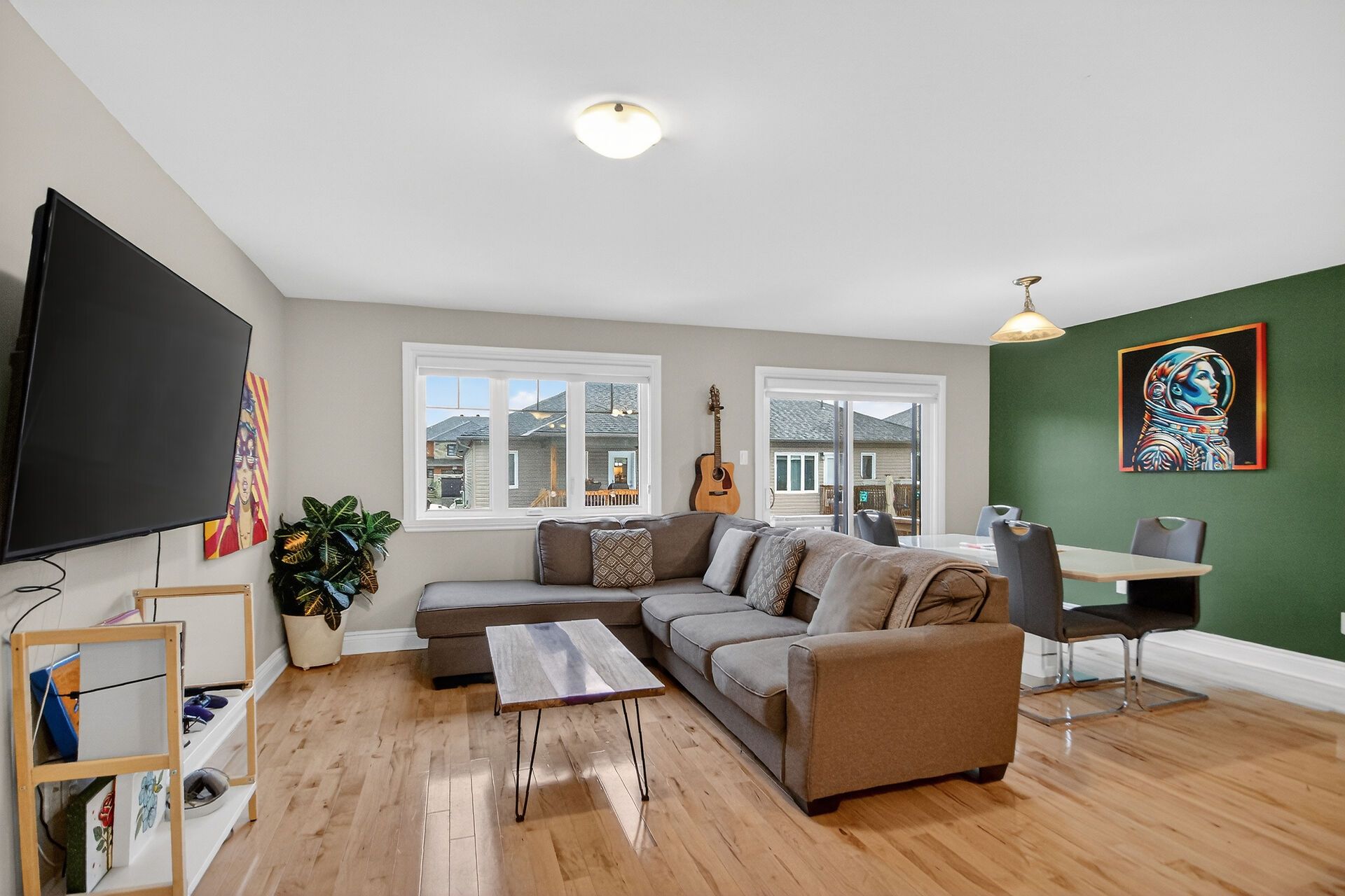 Welcome to 355 twilight ave in the sought-after sunset flats area of the town of russell-an exceptional end -unit townhome widened by 4 ft. And offering nearly 1,400 sq ft on the main level plus a finished basement . This bright 3-bedroom home features a welcoming foyer with ceramic floors and double closet, a modern kitchen with granite countertops, crown moulding above cabinets, stainless steel appliances, and hardwood flooring throughout the main level. The living and dining areas are filled with natural light from large, bright windows. The spacious primary bedroom with two closets and well-sized secondary bedrooms are complemented by a main bathroom with double sinks. The finished basement offers a large rec room and full bath, plus a unique separate door providing excellent rental or in-law suite potential. Close to parks, schools, shopping, trails, and community amenities, with easy access to downtown ottawa.