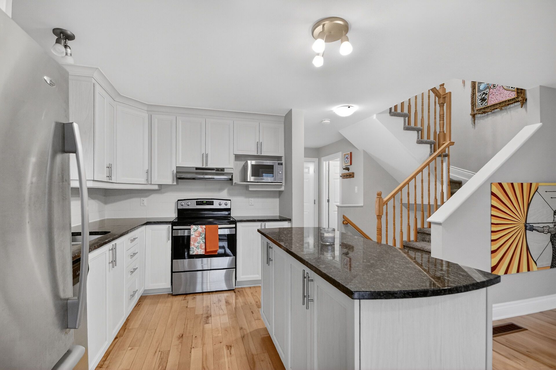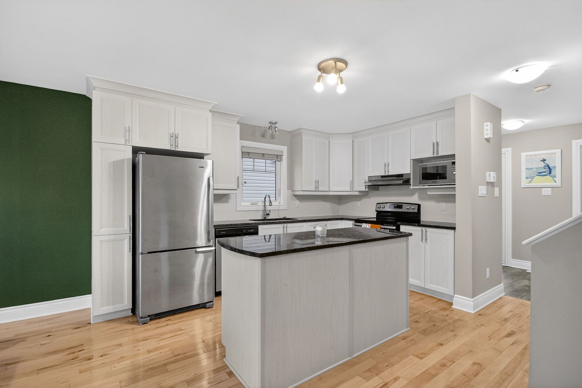 • Modern kitchen featuring granite countertops and stainless steel appliances.